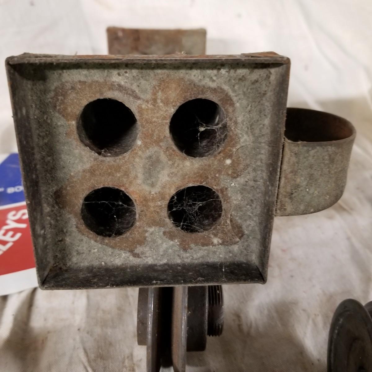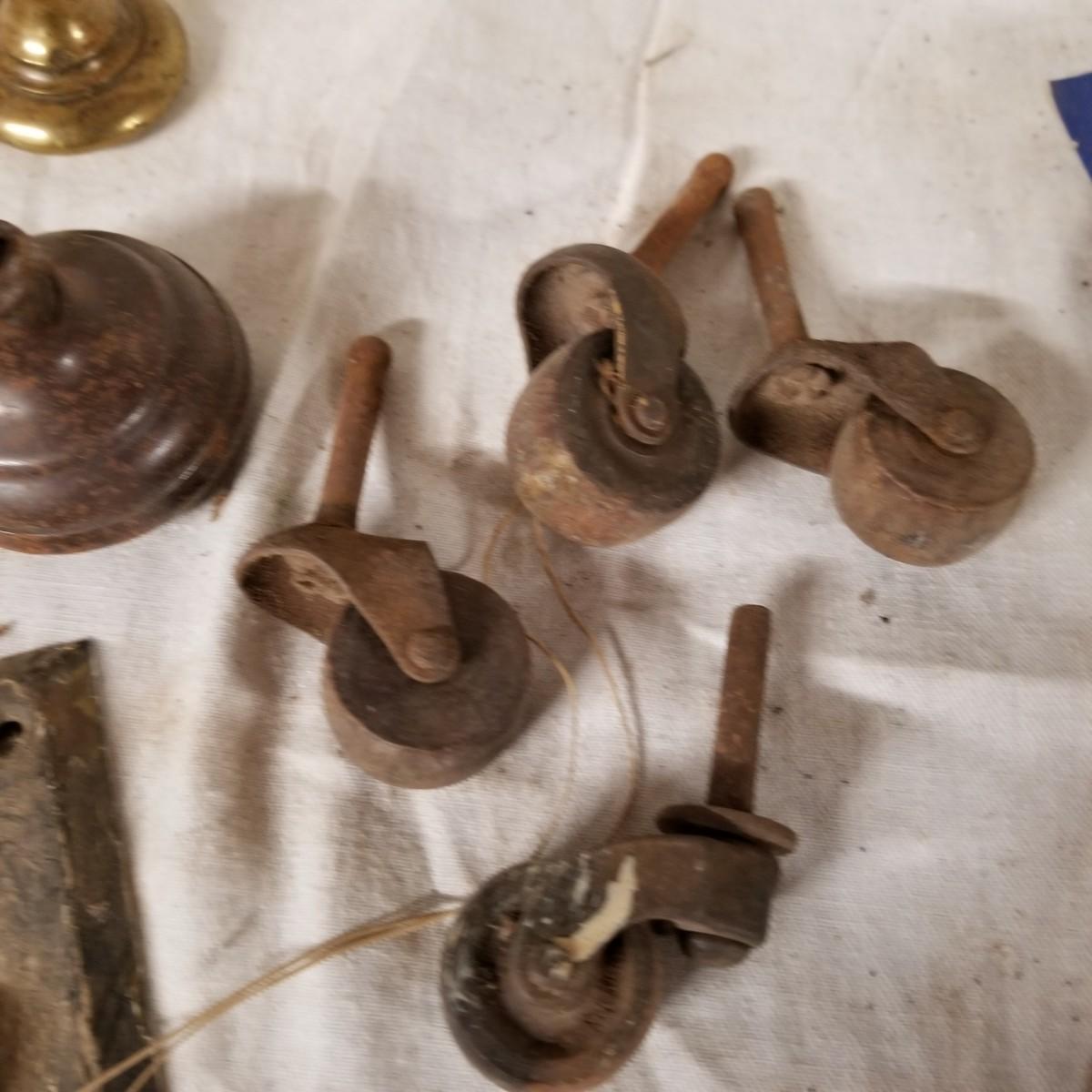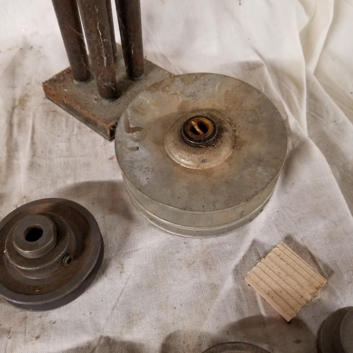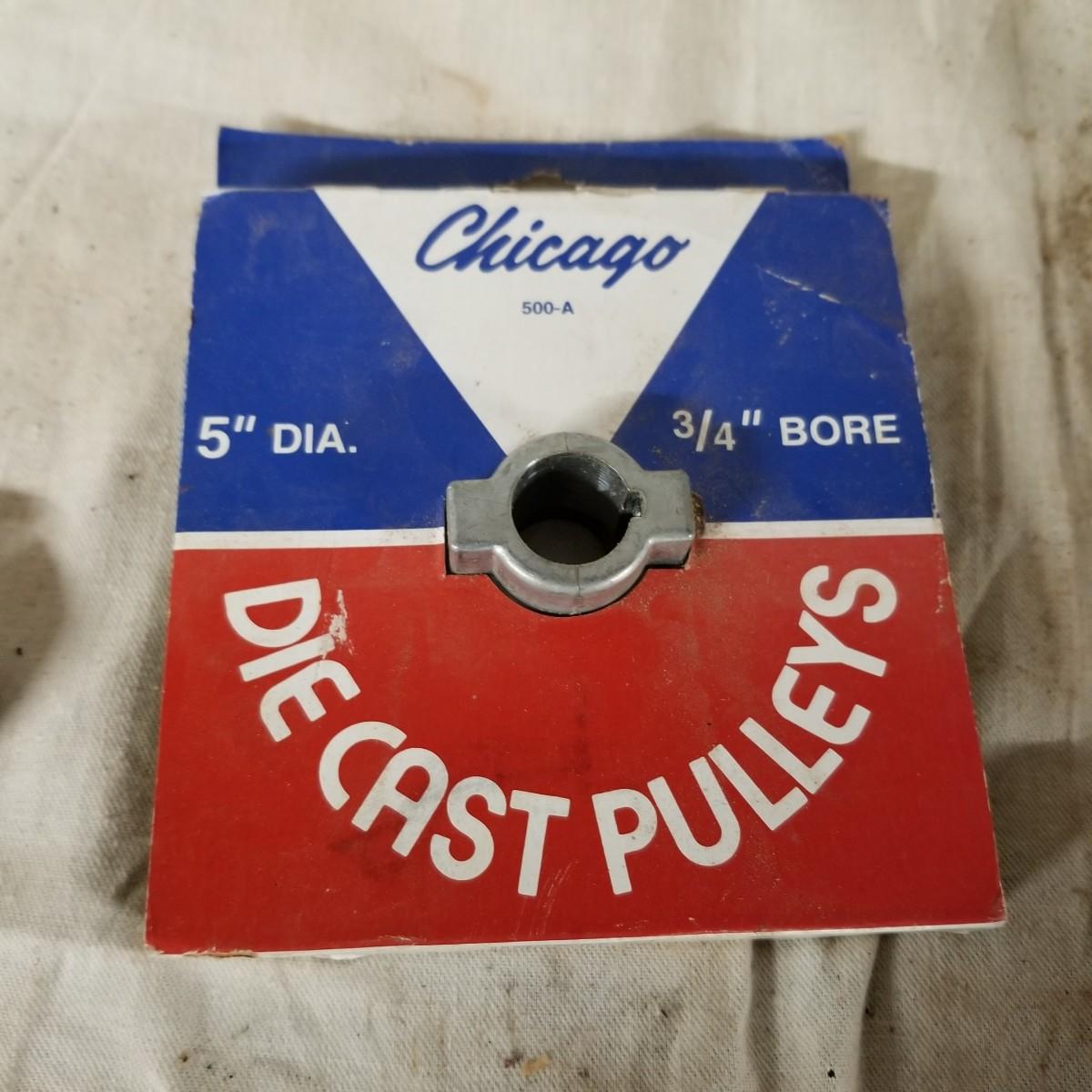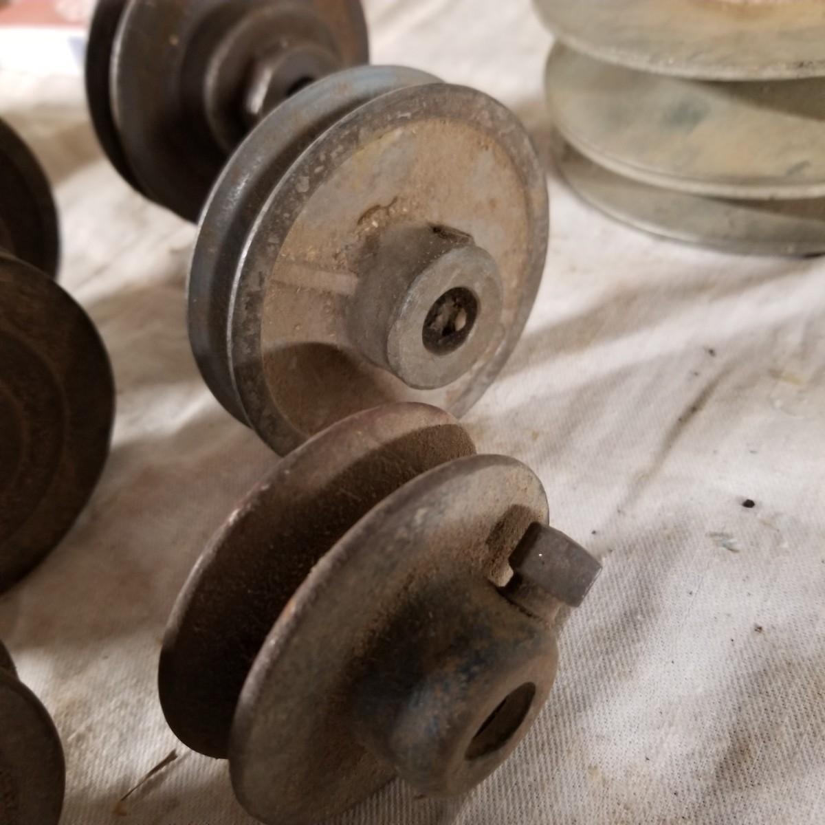 Assortment of pulleys, from 2" d up to 5" d.  Some singles, one double, one triple.  Most all are 1/2" shaft except for Chicago item which is 3/4".  Also old door hardware,  four knobs and two faceplates.  Four wood wheel casters, 1" d, and two Sealmaster ball bearing pillow blocks, 1/2" bore with grease fittings.  One vintage 9" tin candle mold to make four at a time.  Shipping  available.