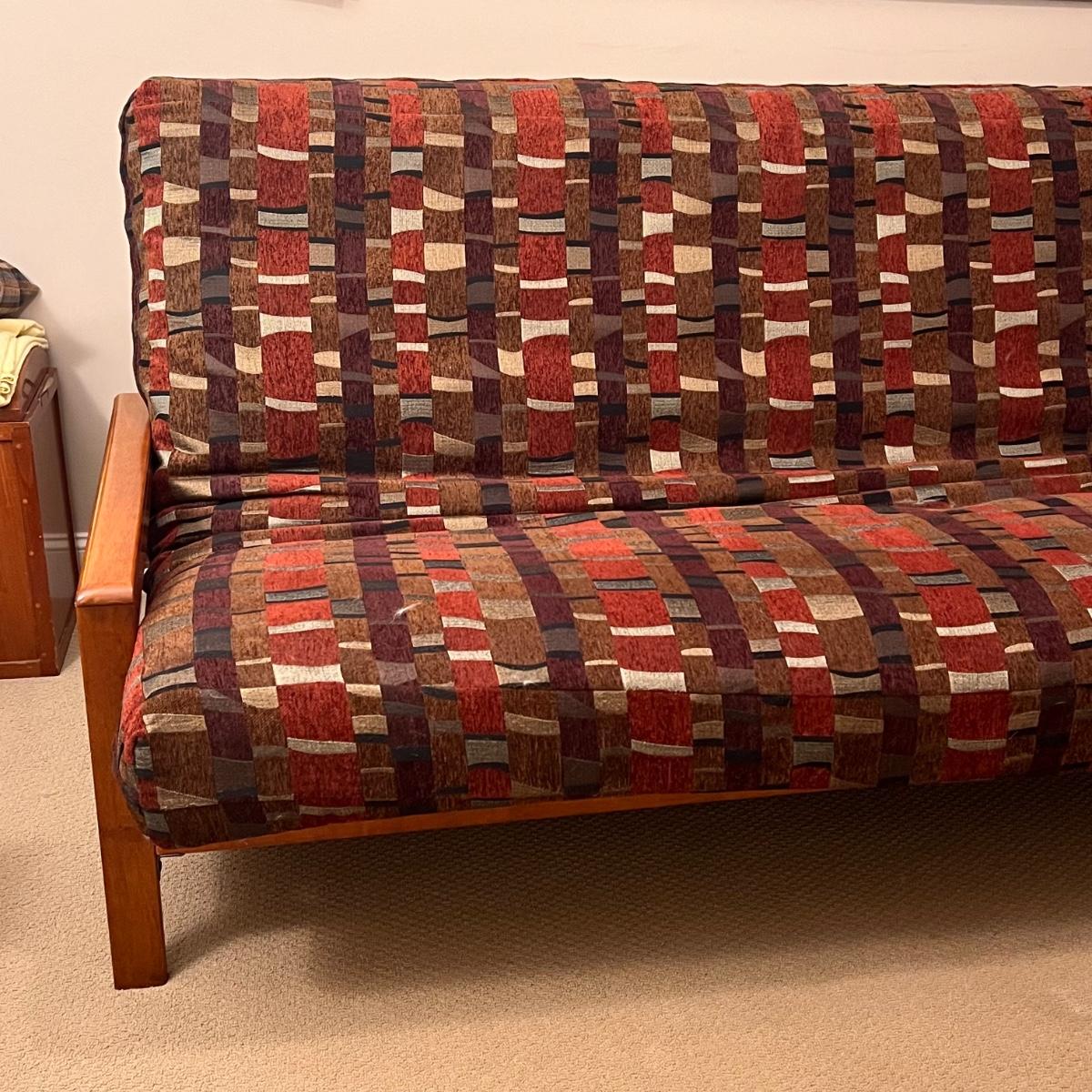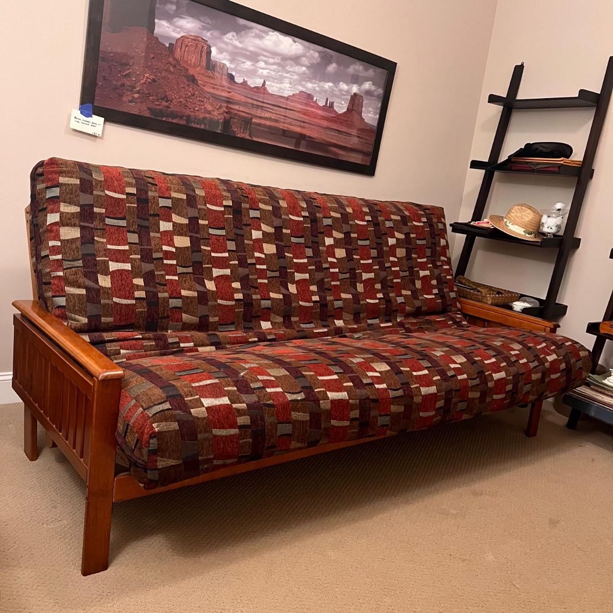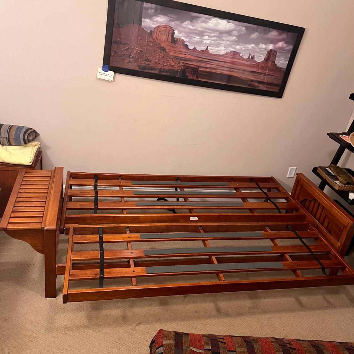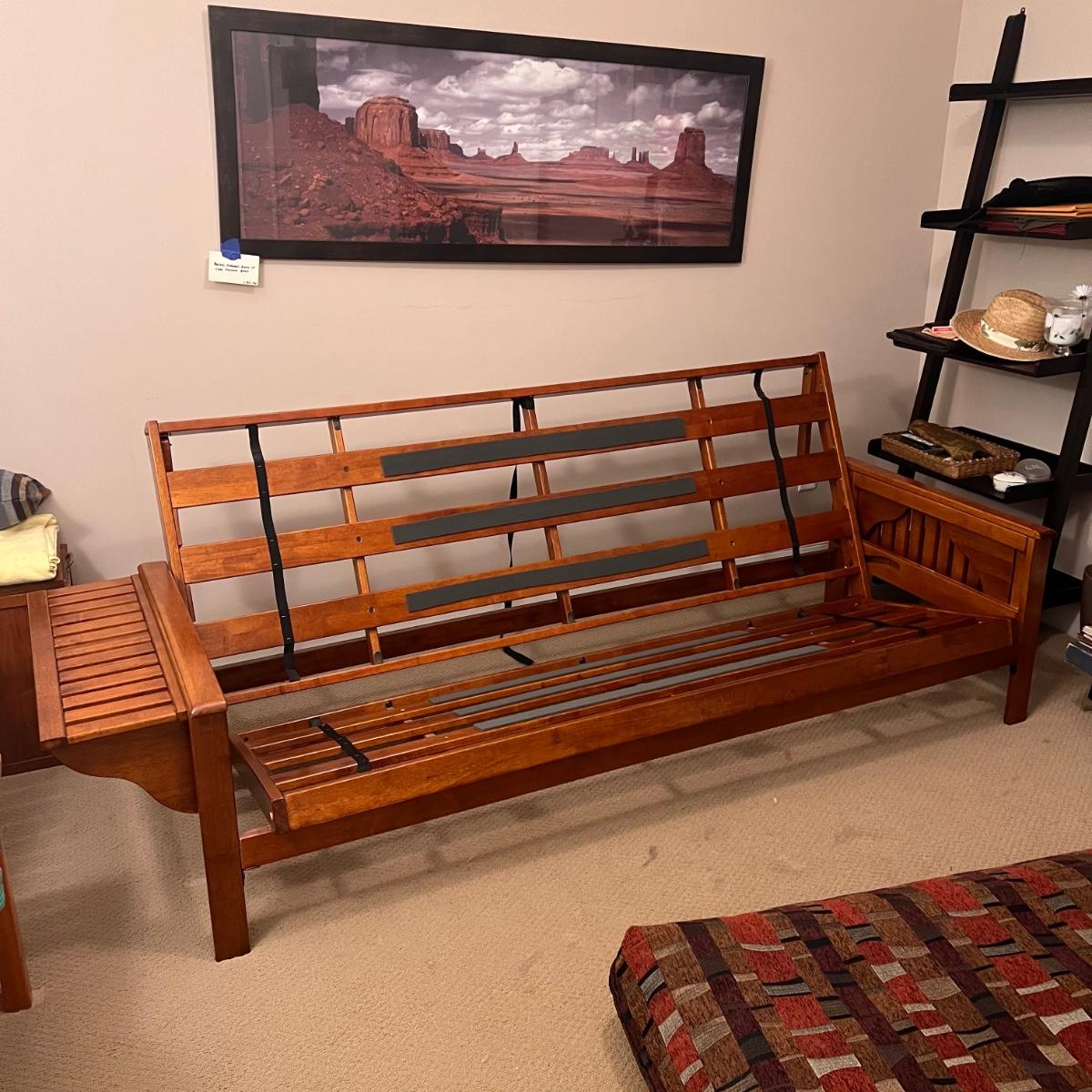 This lot includes one futon/pull-out bed with a wooden frame. It has a large removable cushion with a cushion cover that can be unzipped and washed. The frame itself measures 76” x 60”H when fully extended. When upright, the couch measures 83” x 38”H. Seat height is 20". There are side tables on each arm that swing up for use. Local pickup only. Winning bidder must bring assistance to help move and load this item due to its weight and/or size. Item will need to be moved down three steps.