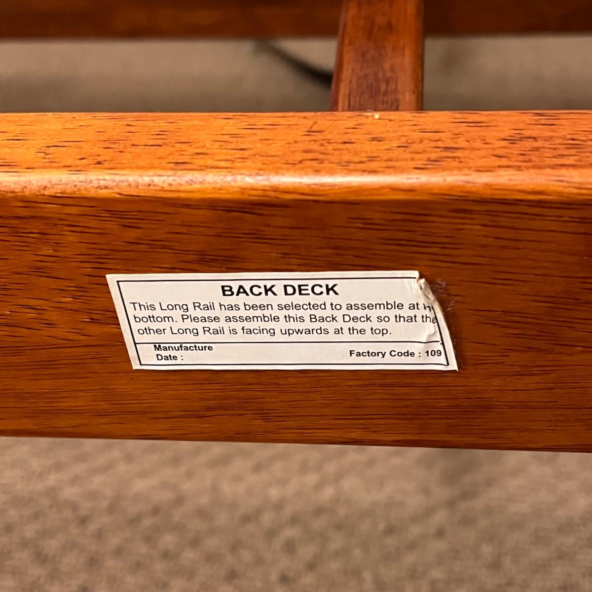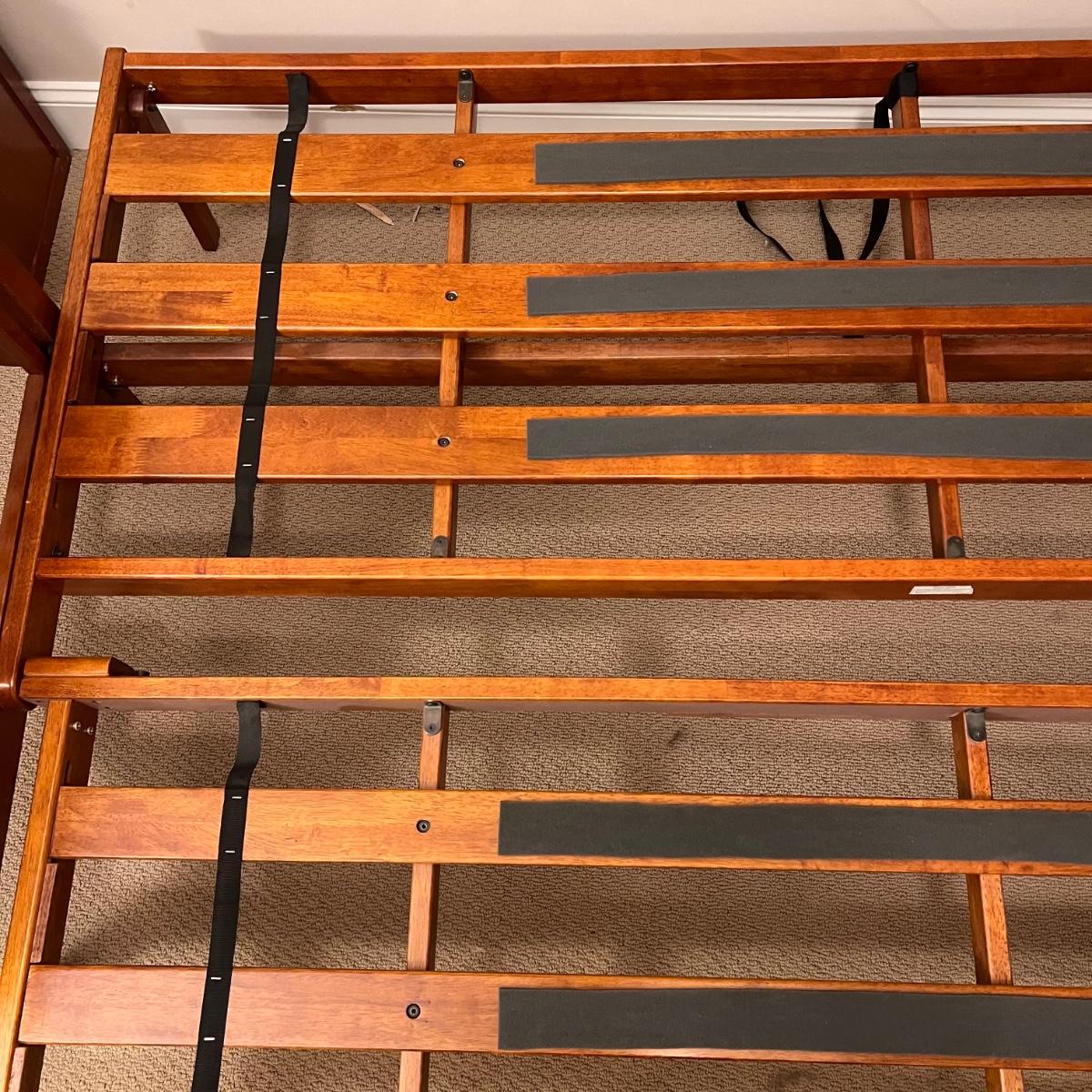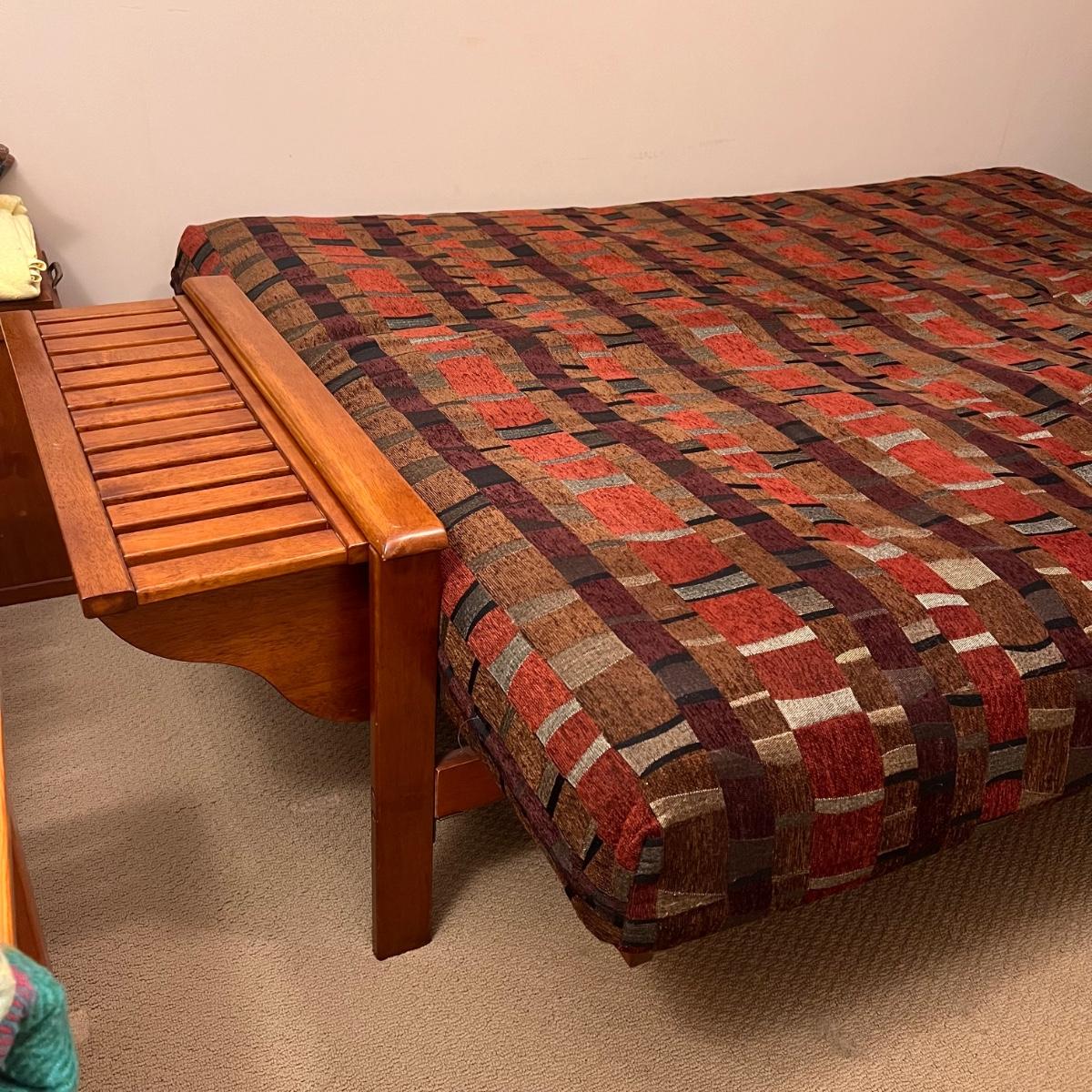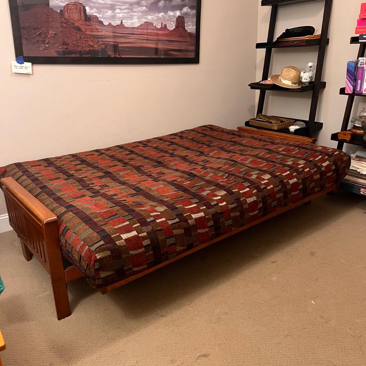 This lot includes one futon/pull-out bed with a wooden frame. It has a large removable cushion with a cushion cover that can be unzipped and washed. The frame itself measures 76” x 60”H when fully extended. When upright, the couch measures 83” x 38”H. Seat height is 20". There are side tables on each arm that swing up for use. Local pickup only. Winning bidder must bring assistance to help move and load this item due to its weight and/or size. Item will need to be moved down three steps.