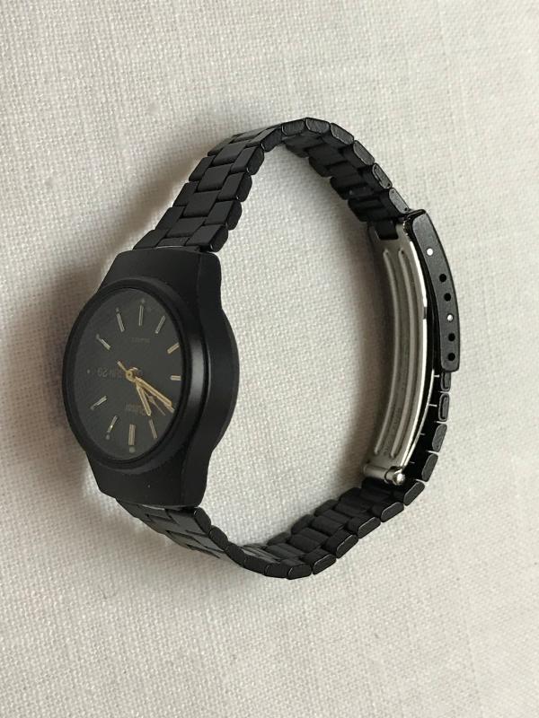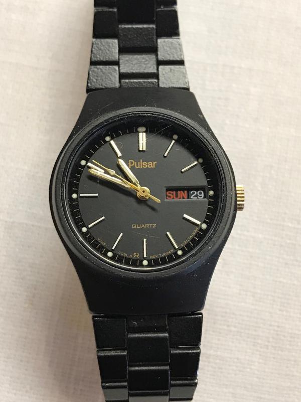 Ladies watch by Pulsar with black round face inset in black stainless steele water resistant bezel. Black stainless steele link band.