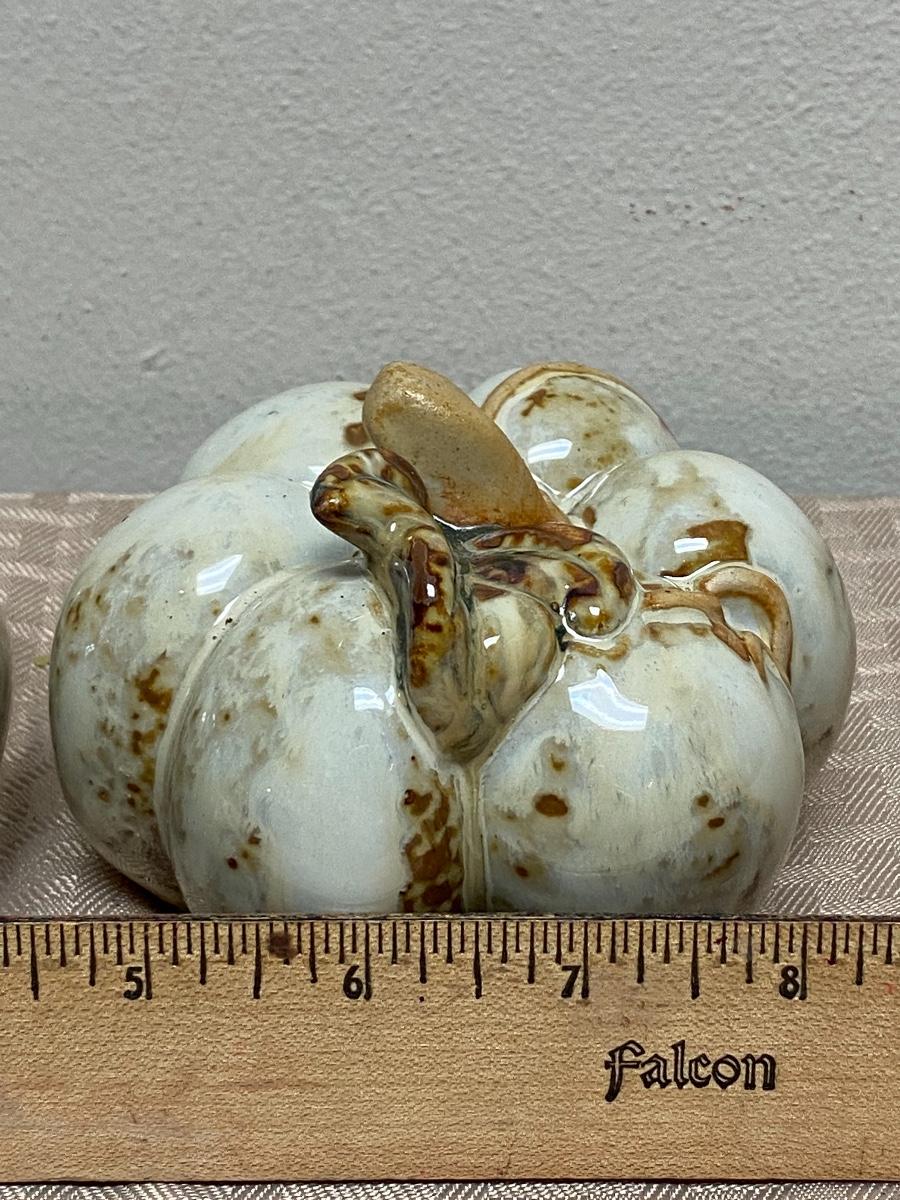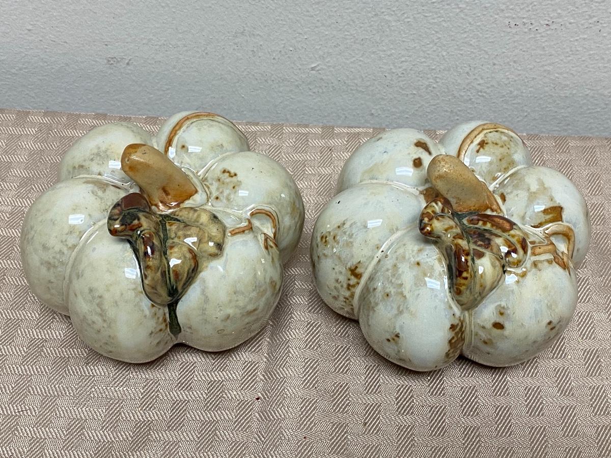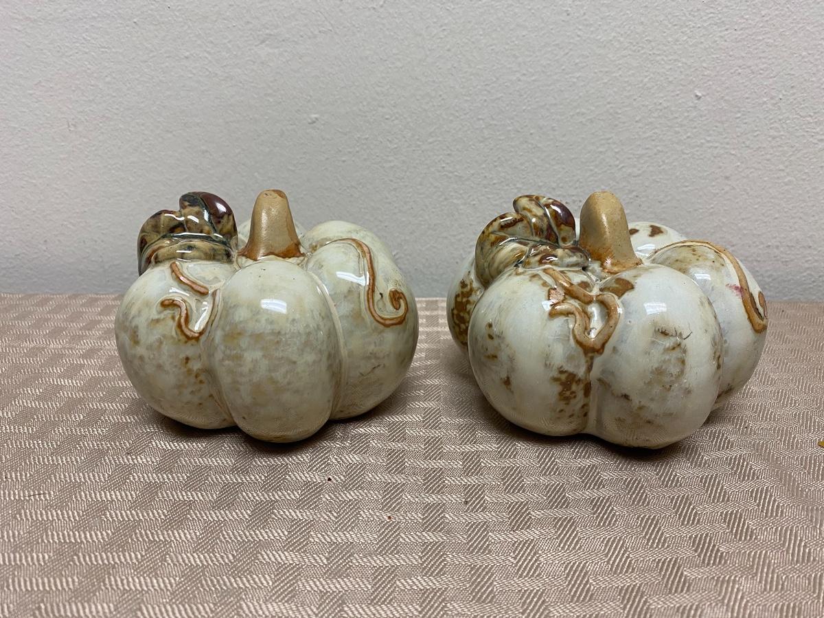 Pair of Ceramic Fall Thanksgiving Autumn Pumpkin Figurines. Almost have a dripware glaze finish. Good condition.