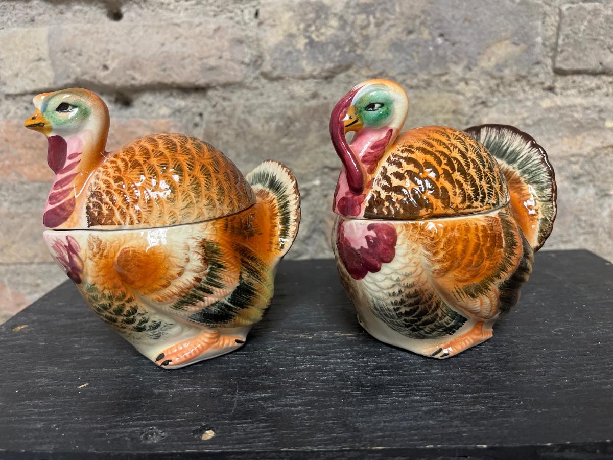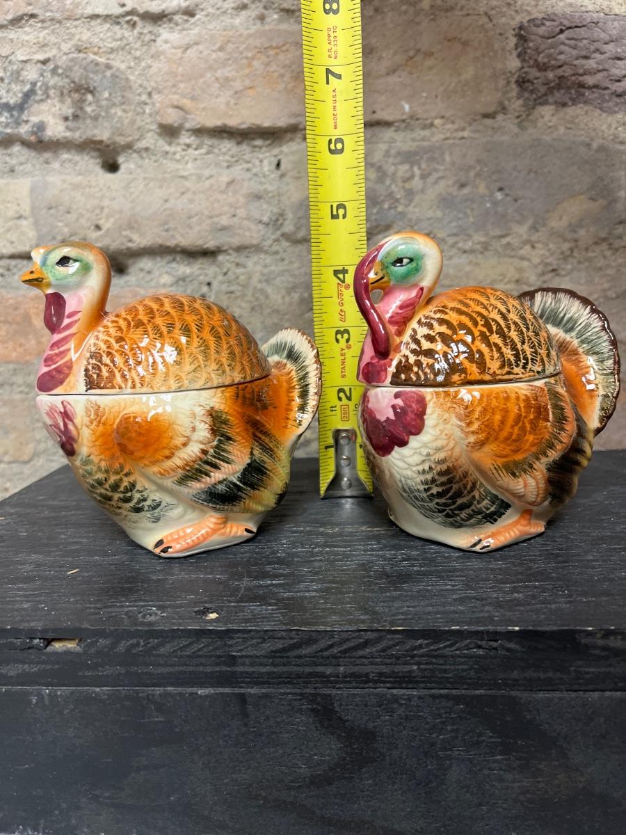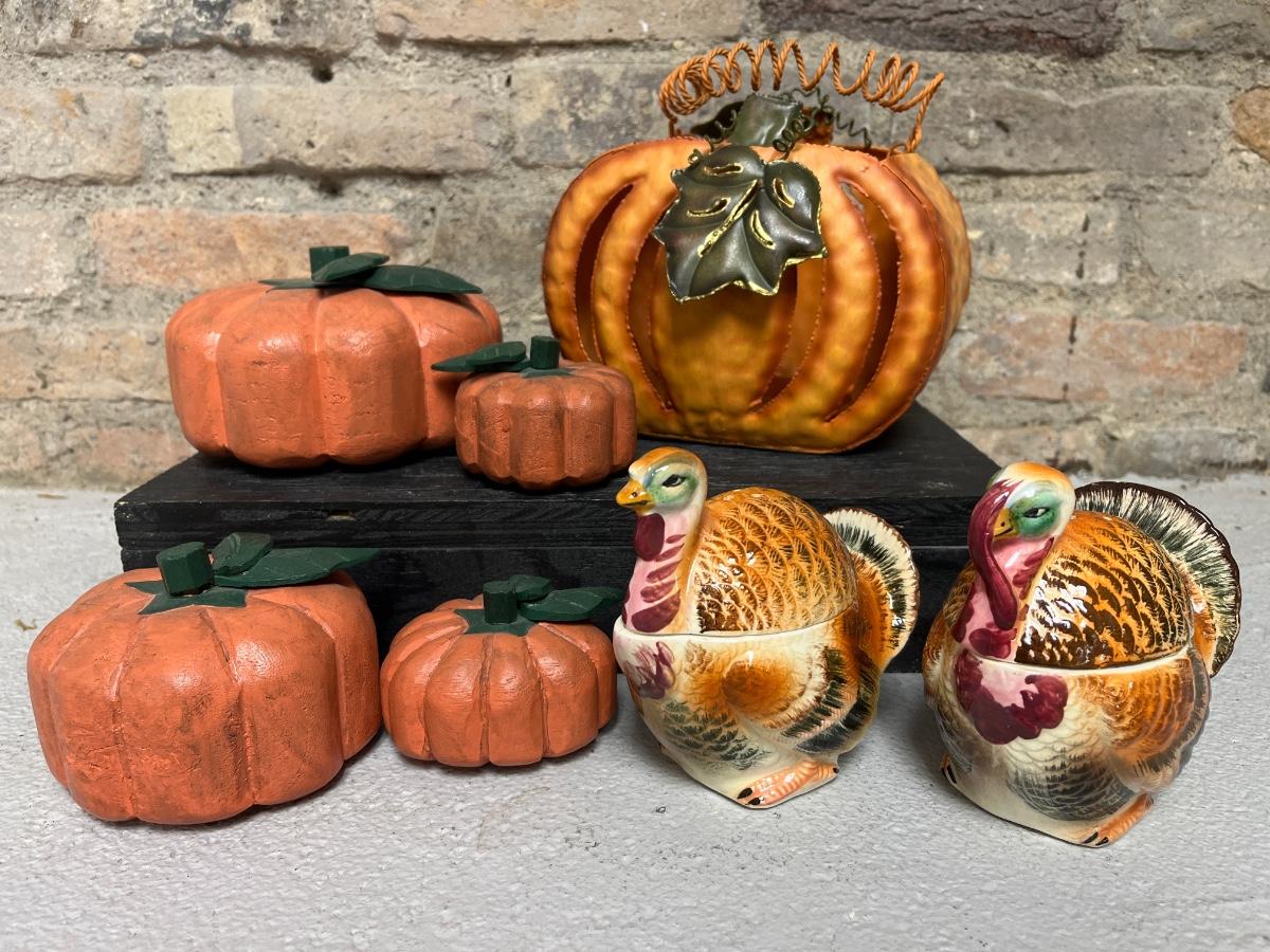 Vintage Turkey S&P shaker/ sugar and creamer set, flat pumpkin set and metal pumpkin basket