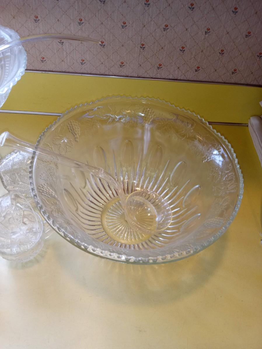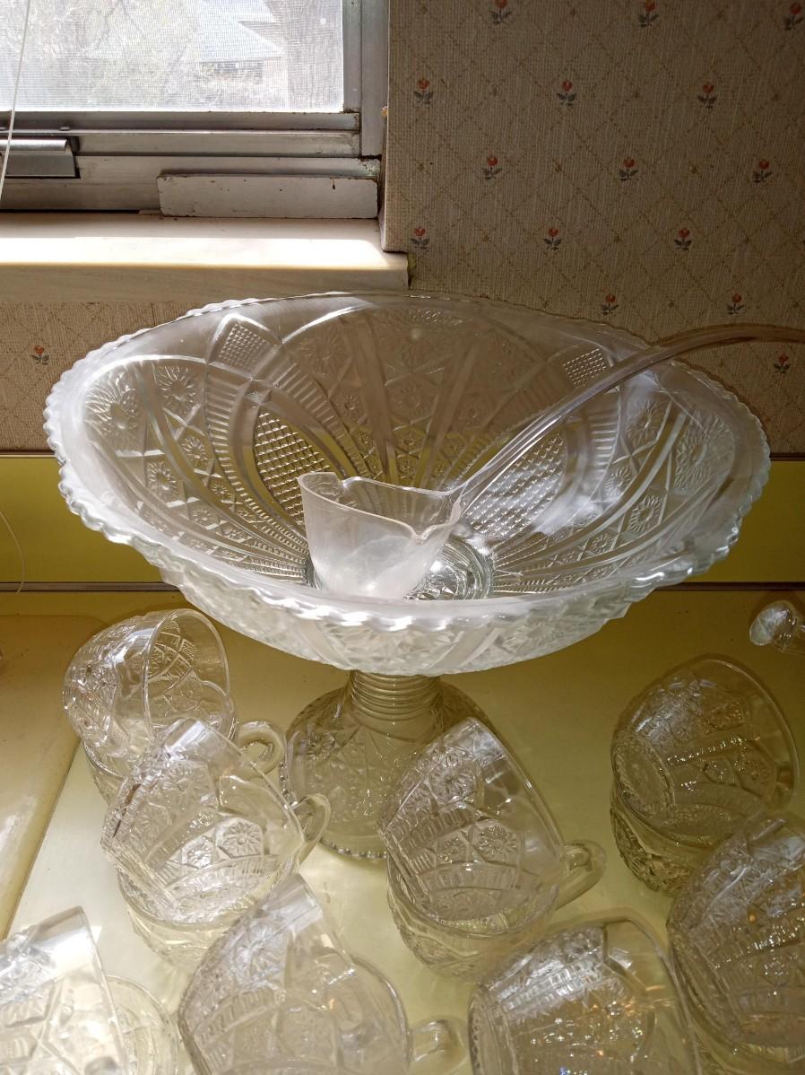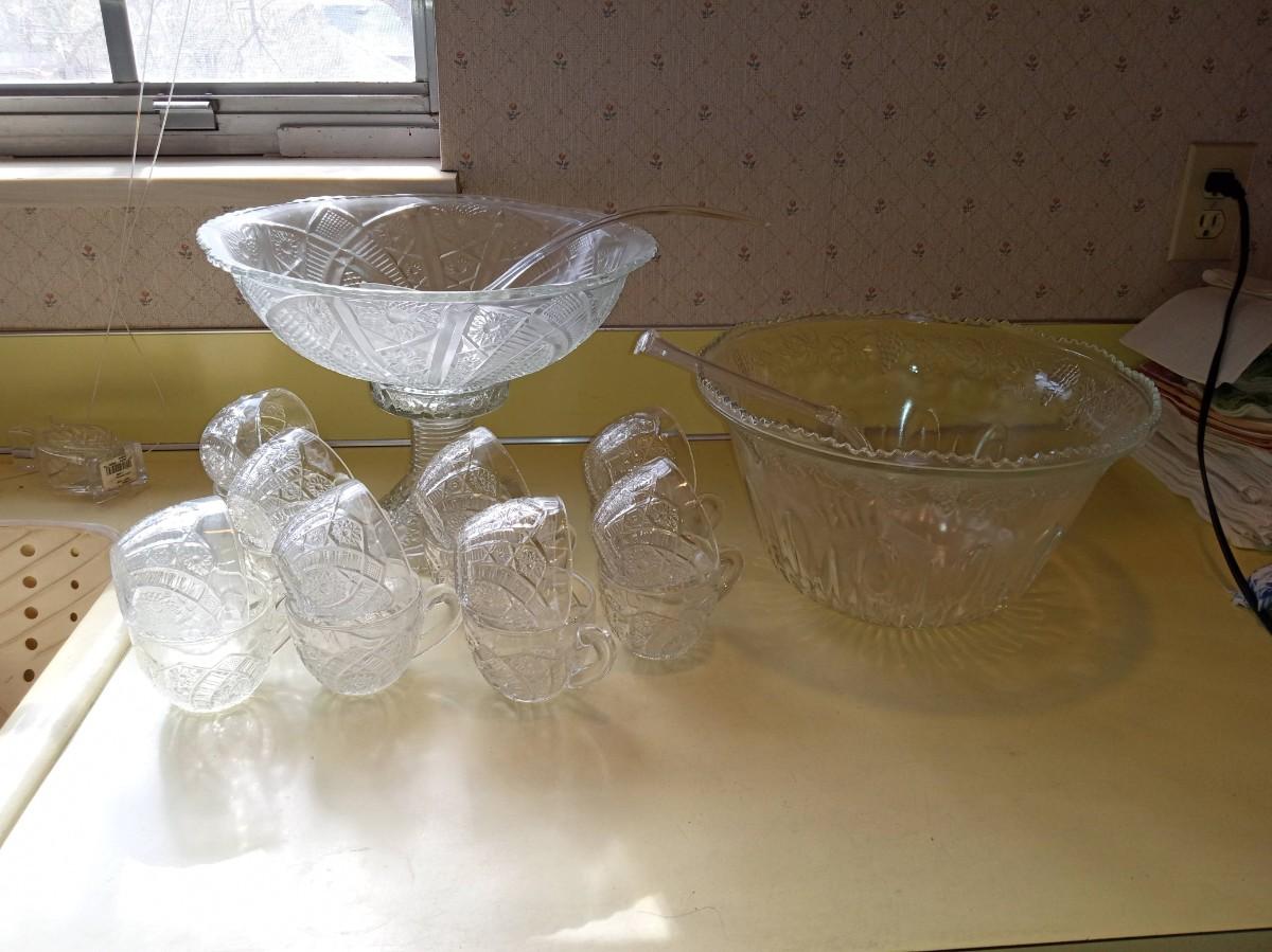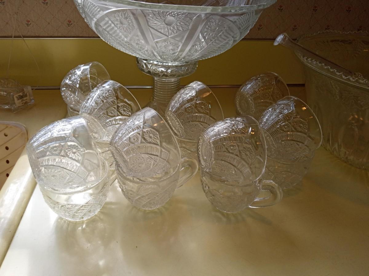 PUNCH BOWL, CUPS AND LARGE BOWL ON PEDESTAL