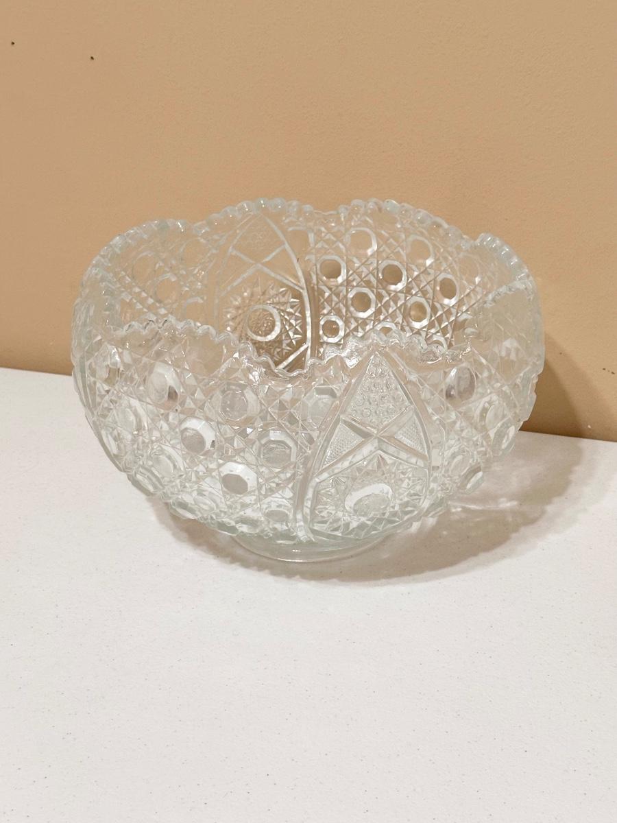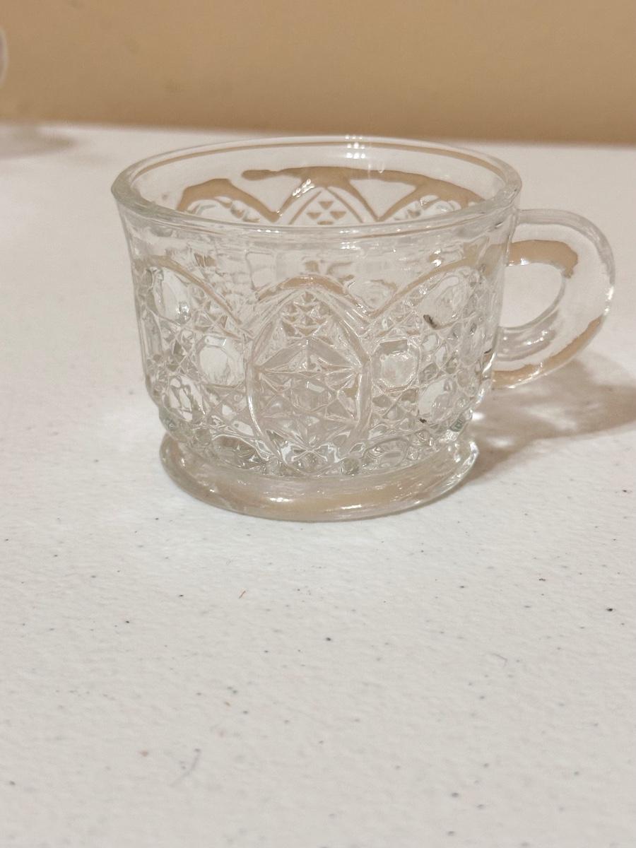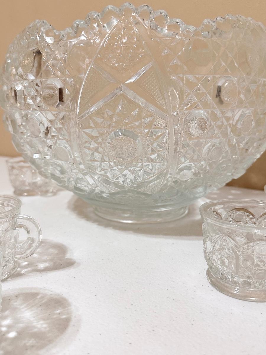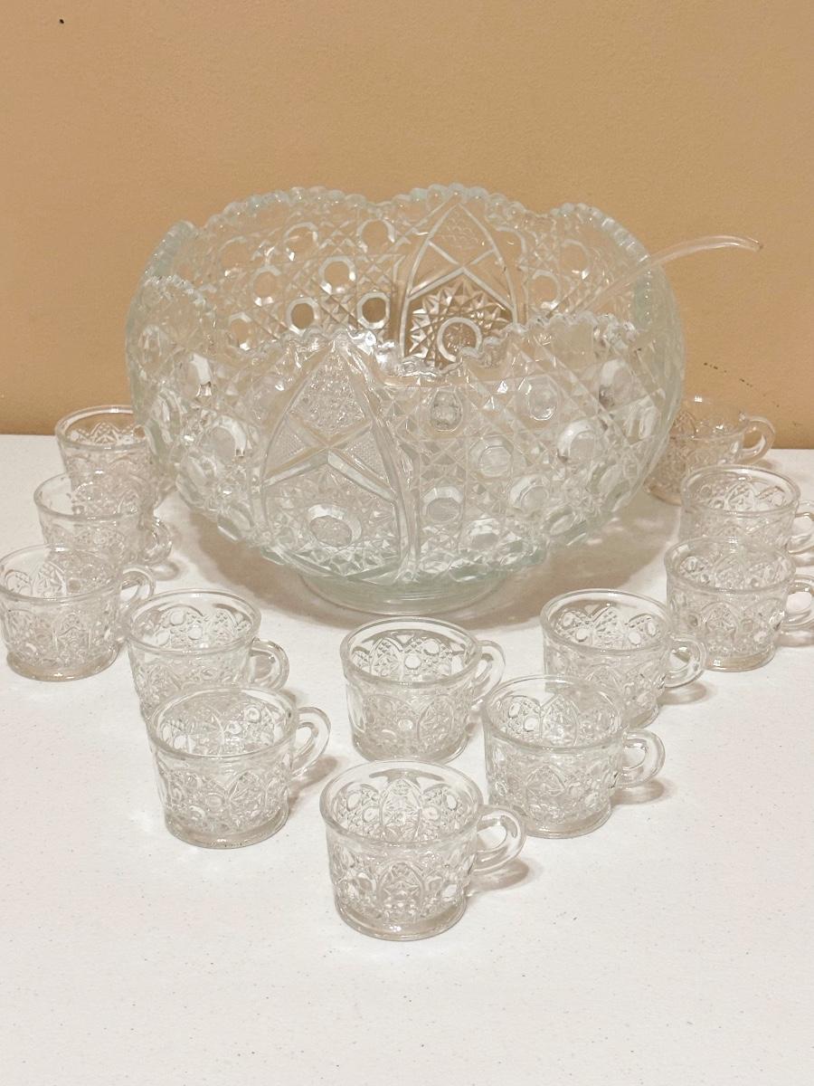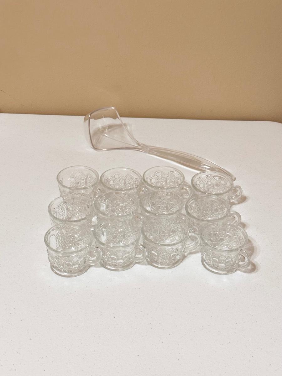 Glass bowl with 12 cups and a plastic ladle. ~ can be used as a salad bowl. Bowl measures 8.5” x 12” round ~ cups are 2.25” H x 2.75” Round