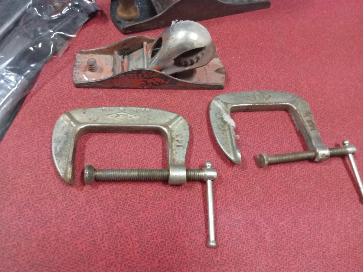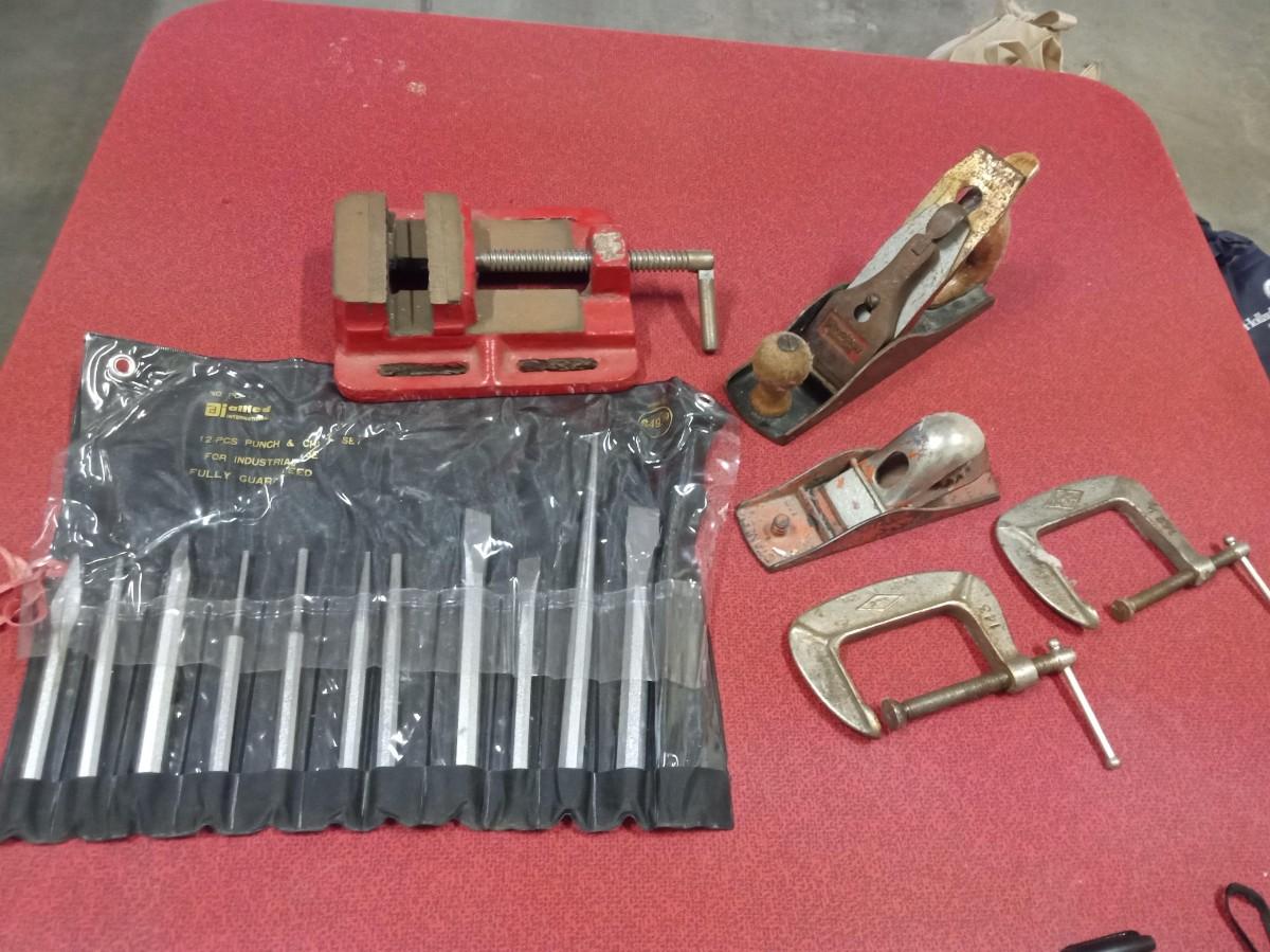PUNCH & CHISEL SET, PLANES, C-CLAMPS AND A VISE