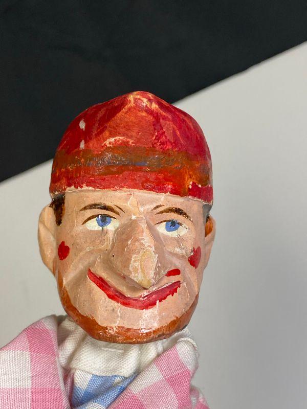 Punch & Judy style hand puppet man. Wearing a pink and blue gingham outfit, maybe suppose to be a jester or clown. Not original outfit. Has signs of age. Wood face, hands, and foot (missing one leg). It looks like someone tried to touch up the paint a little previously.