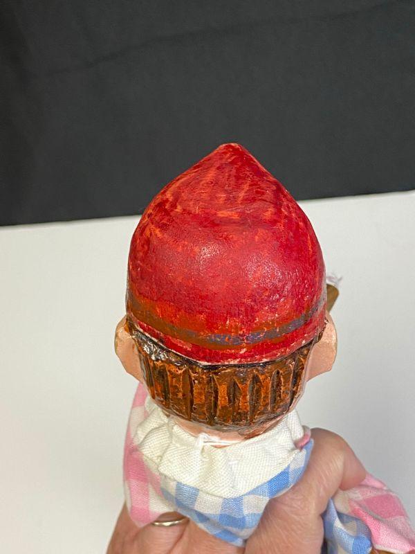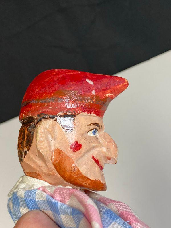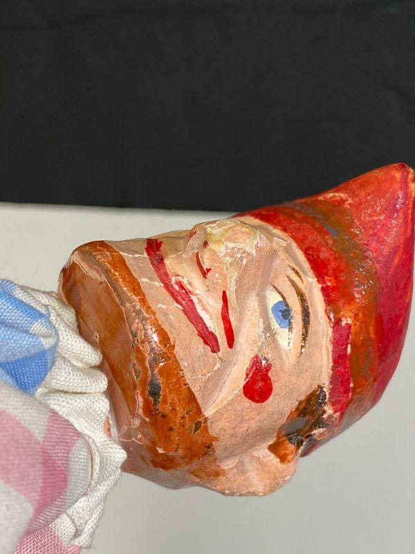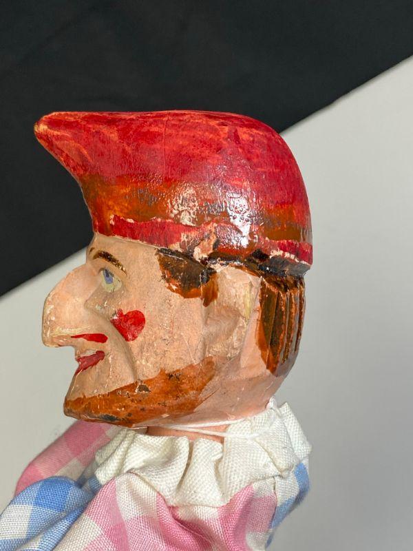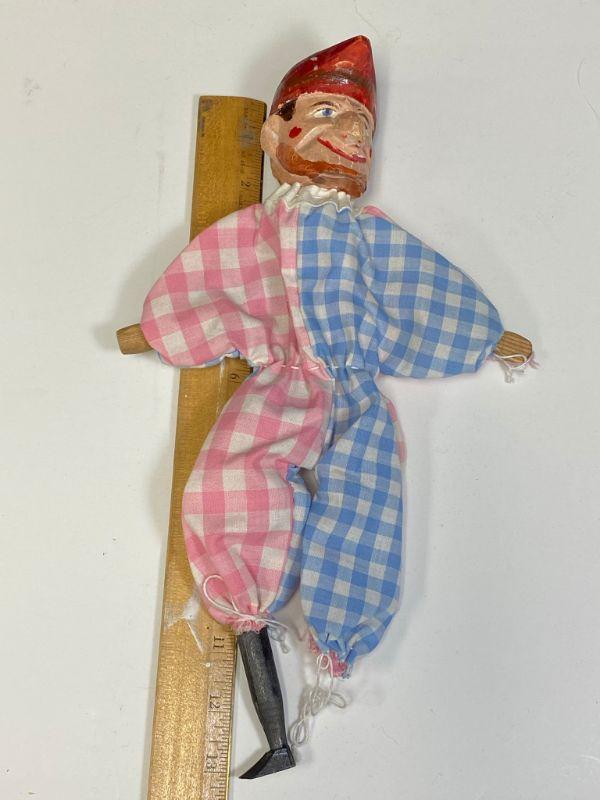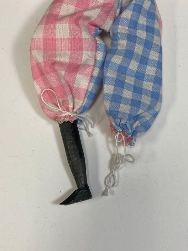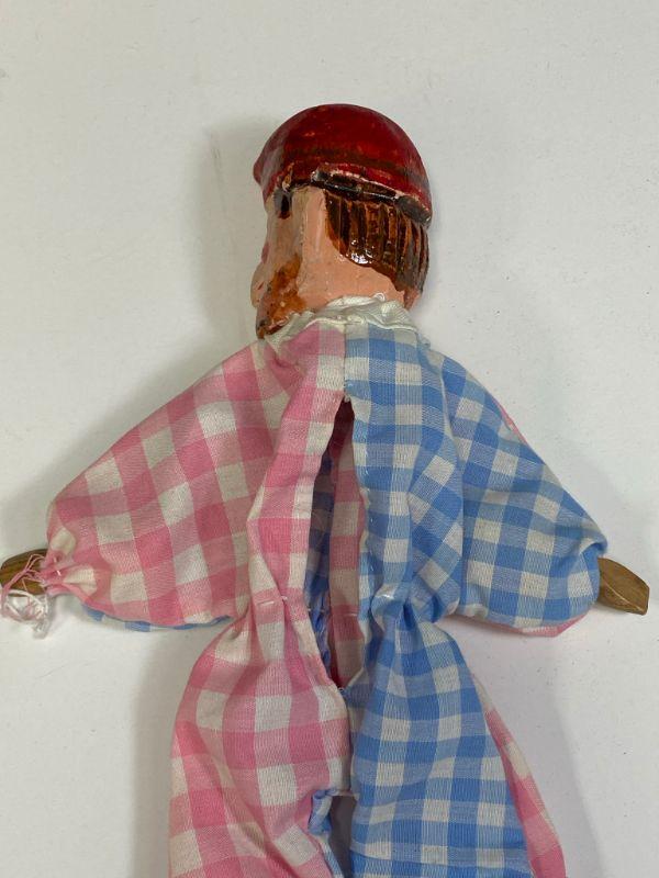 Punch & Judy style hand puppet man. Wearing a pink and blue gingham outfit, maybe suppose to be a jester or clown. Not original outfit. Has signs of age. Wood face, hands, and foot (missing one leg). It looks like someone tried to touch up the paint a little previously.