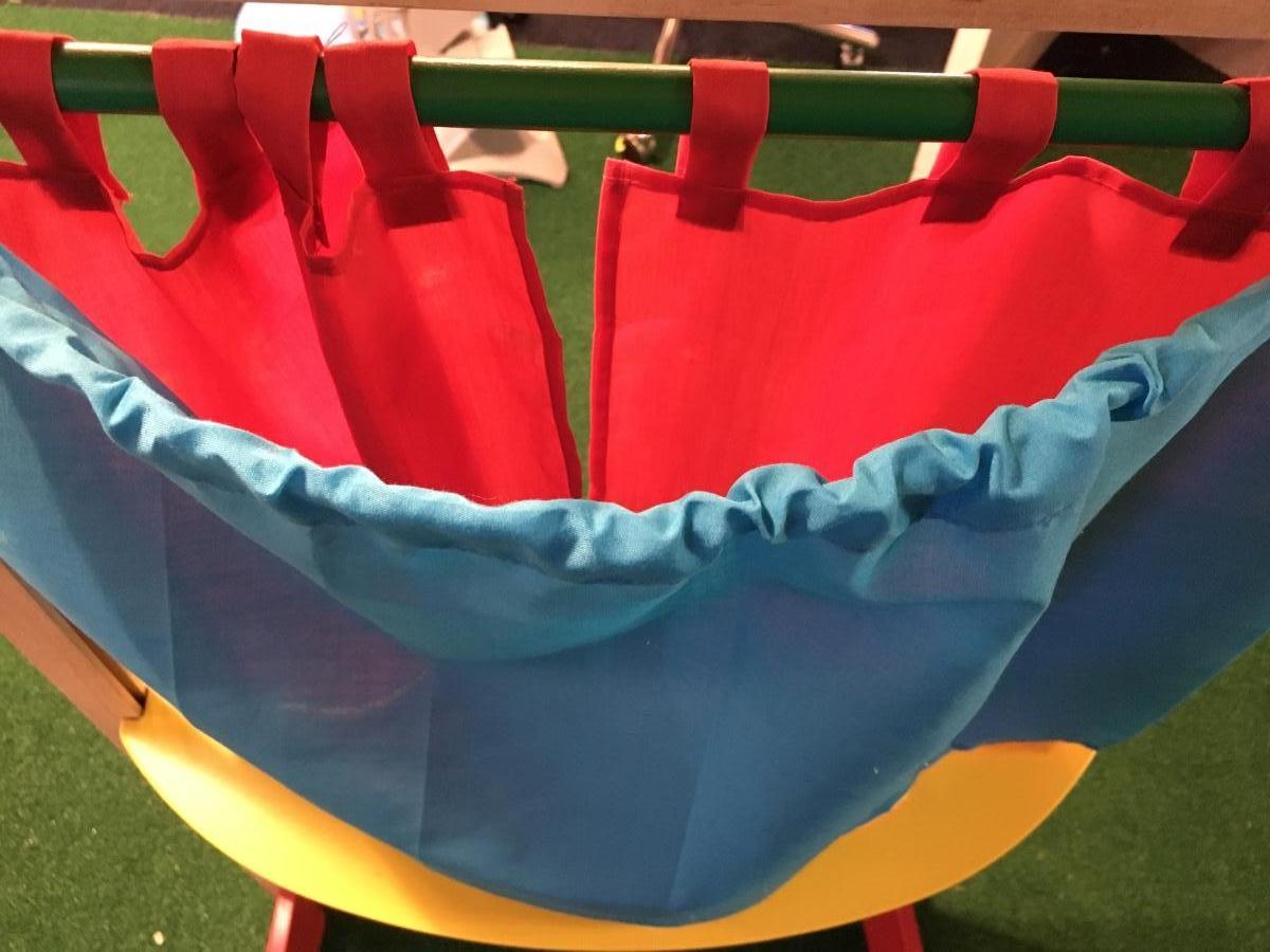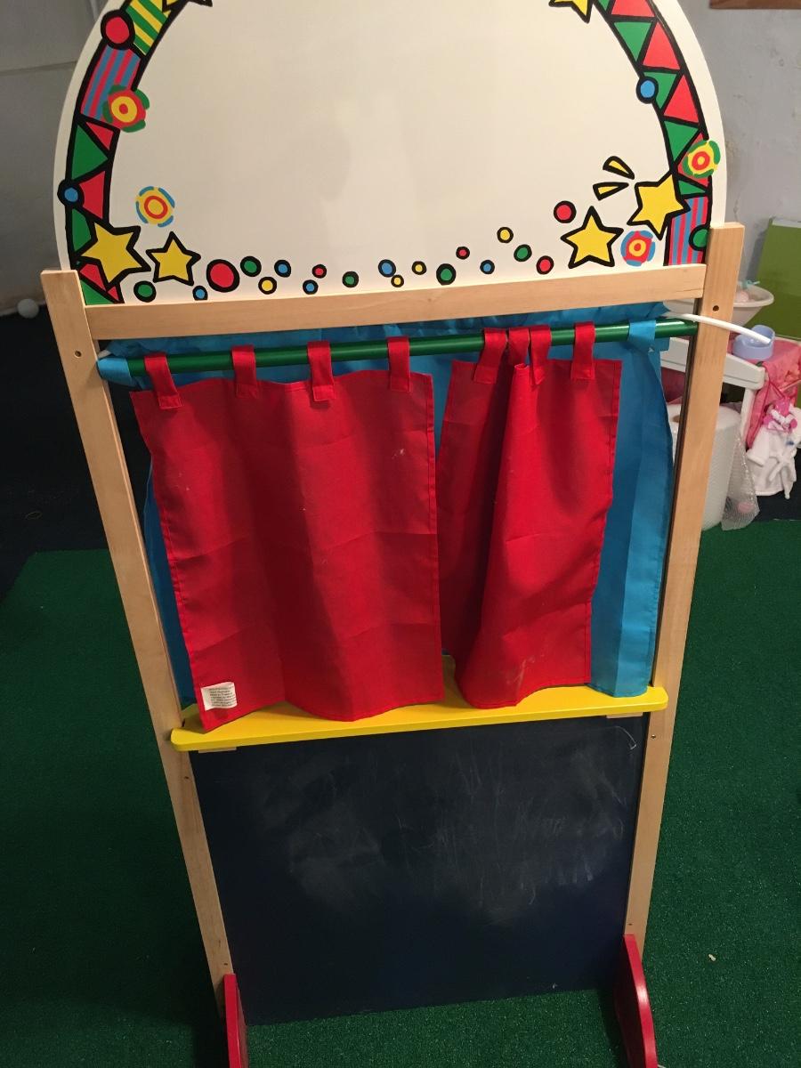 Consturctive Playthngs puppet theater with builtin chalkboard. Overall solid consturcction though one foot coudl use some wood glue.