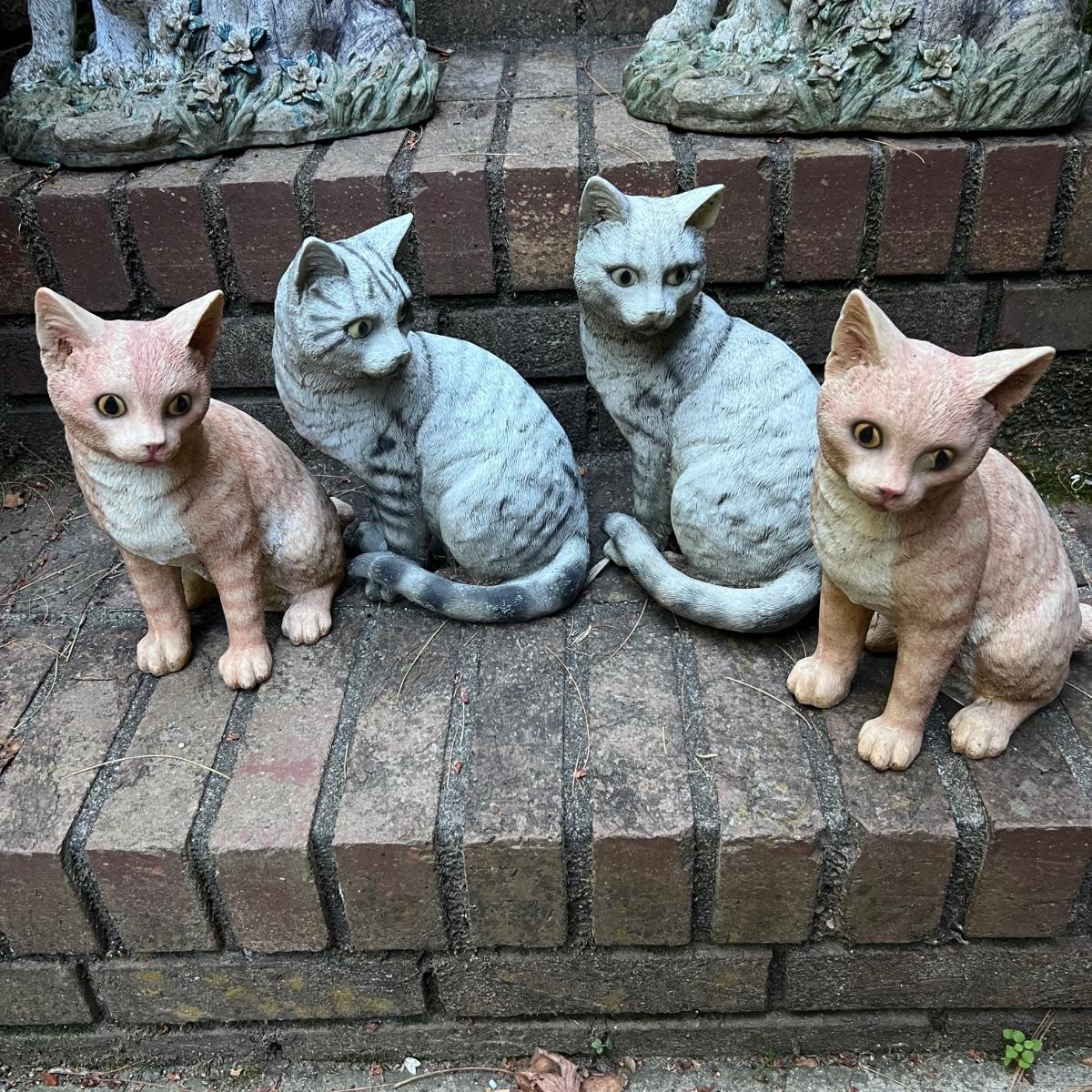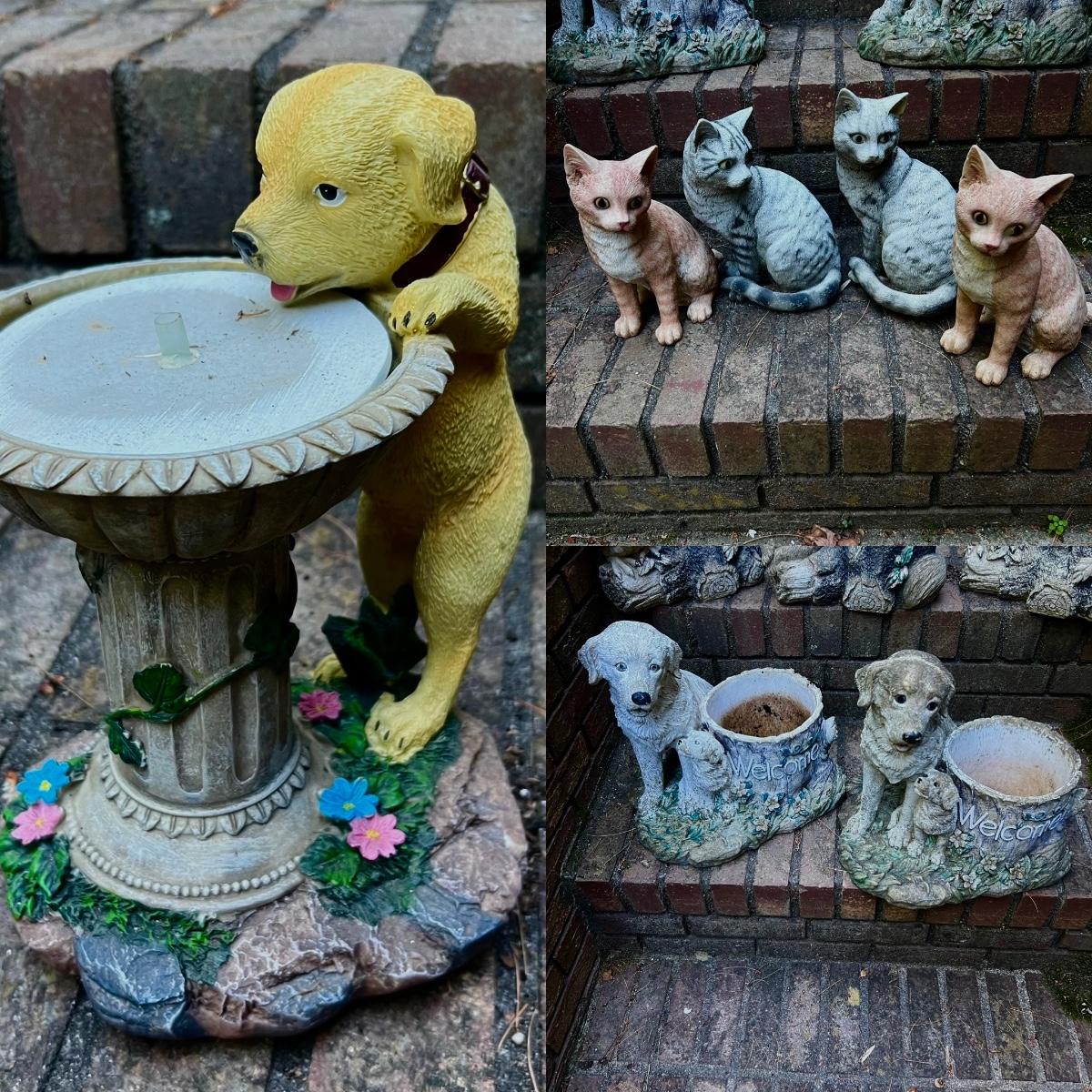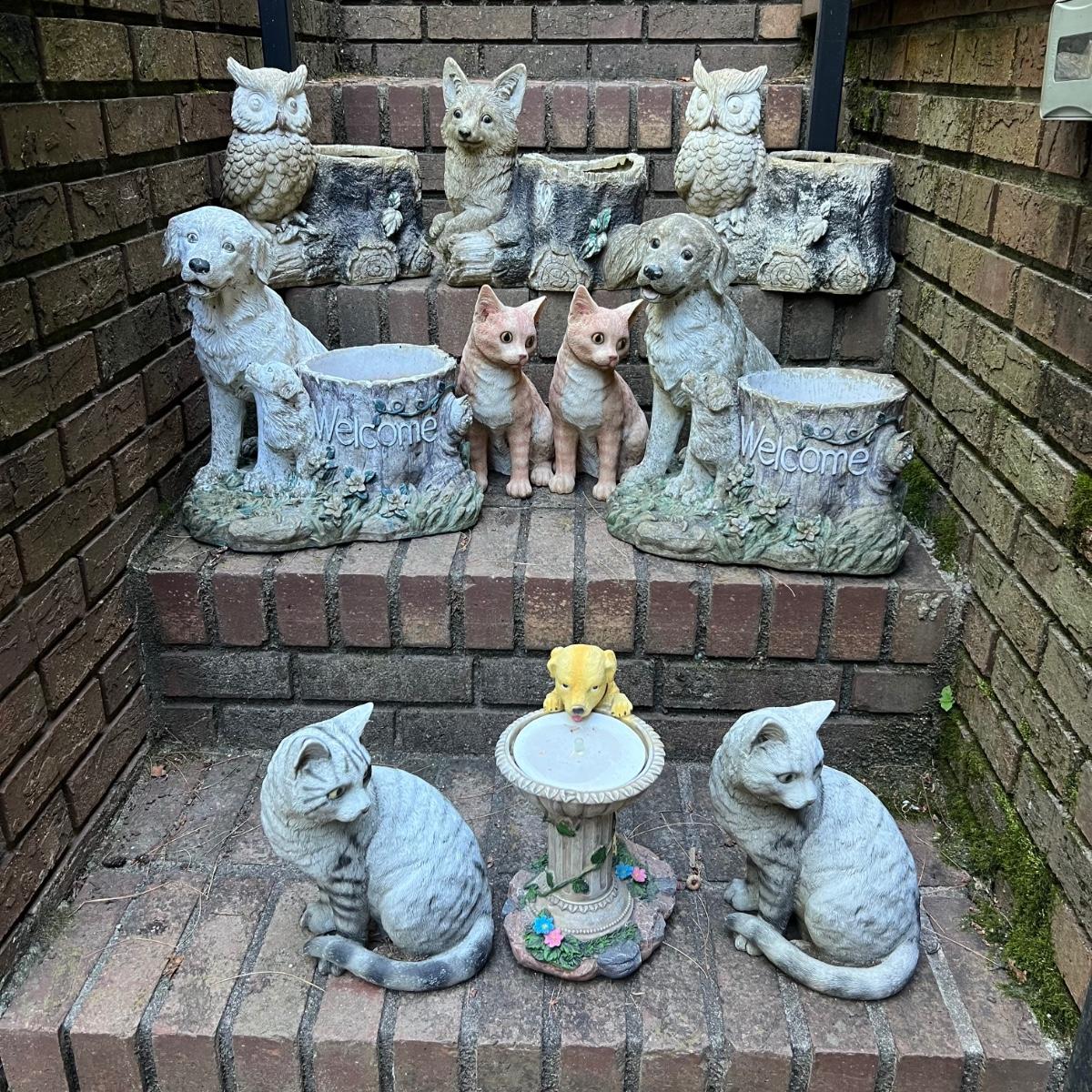 This lot contains four cat statues, five animal themed planters and a puppy fountain; all are a hard resin like material with some weather related fading. Some remnants of soil in the pots. The fountain is battery operated and was not tested.