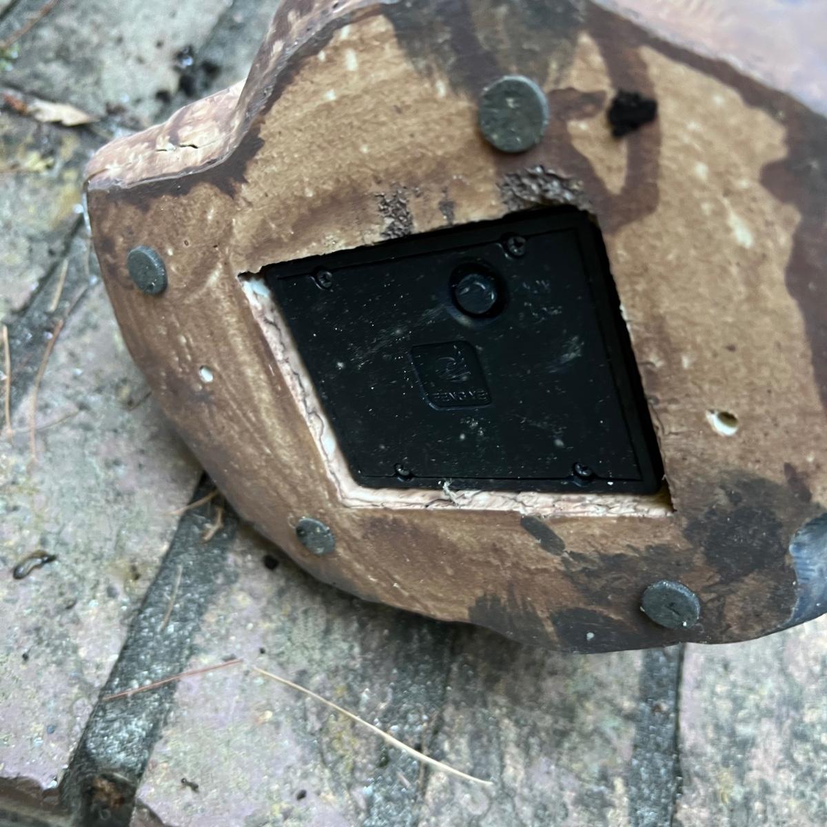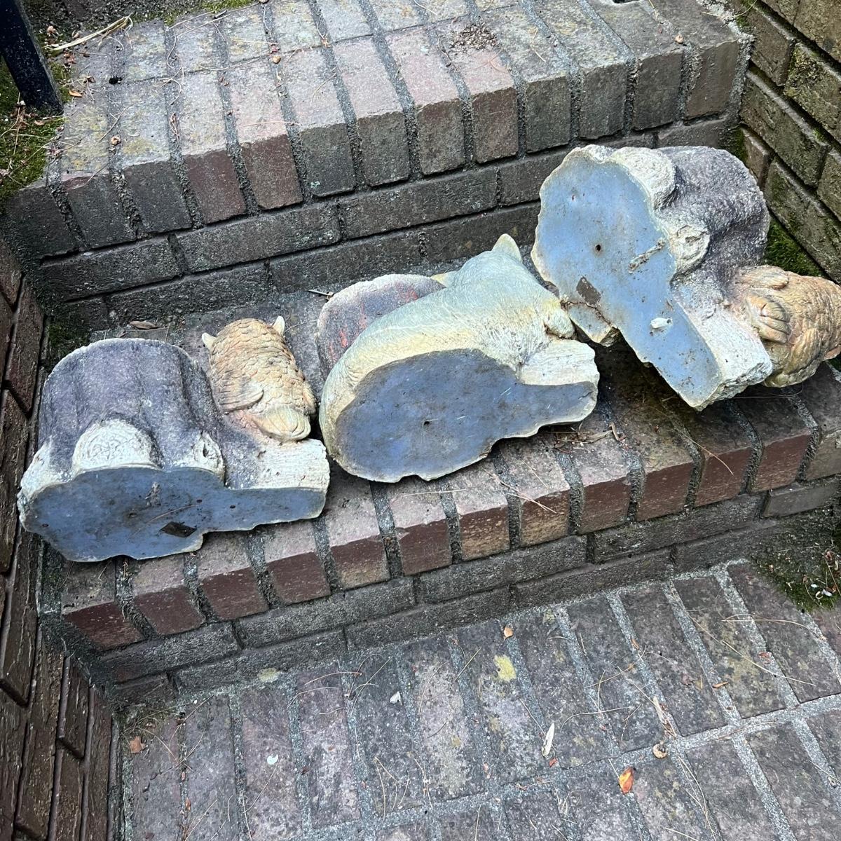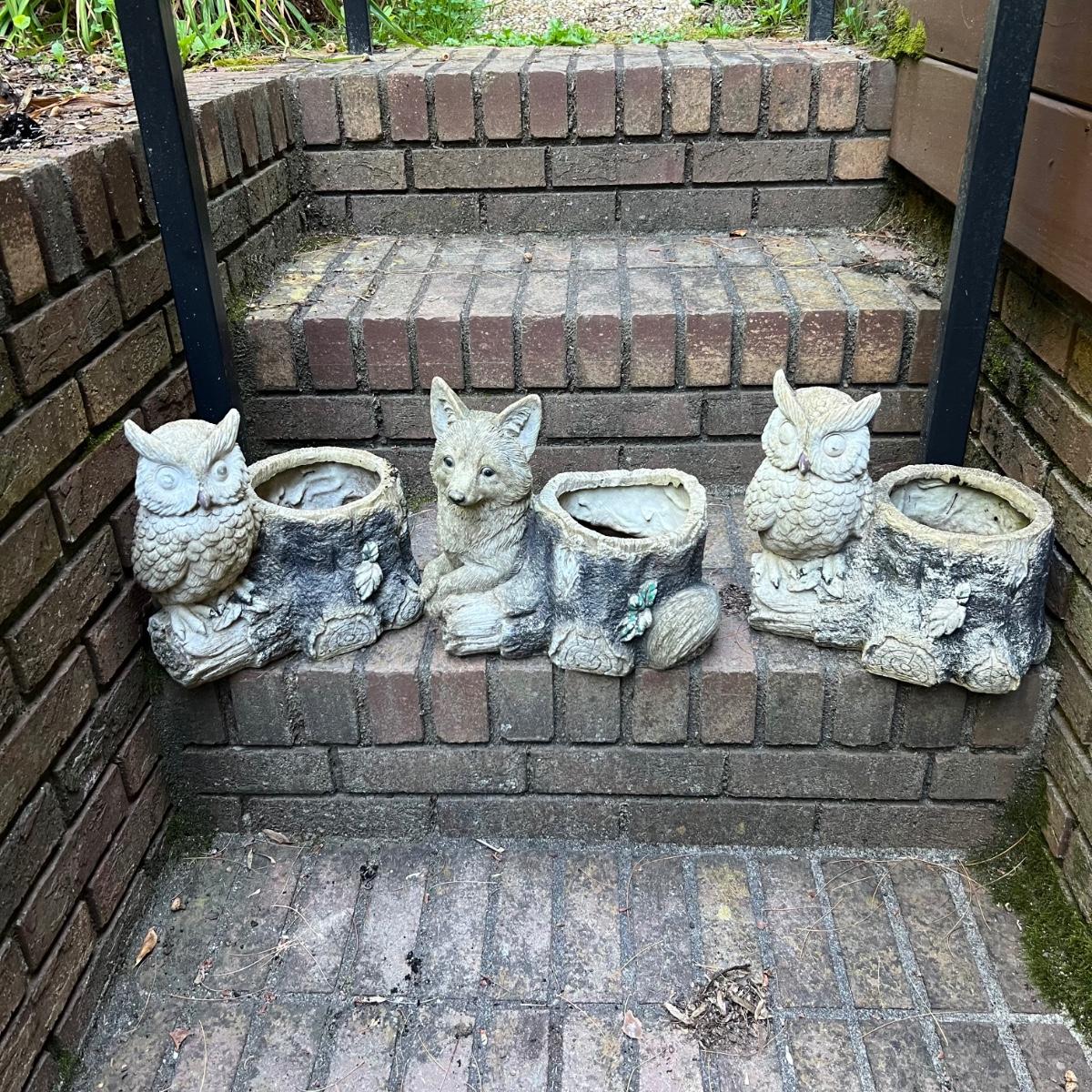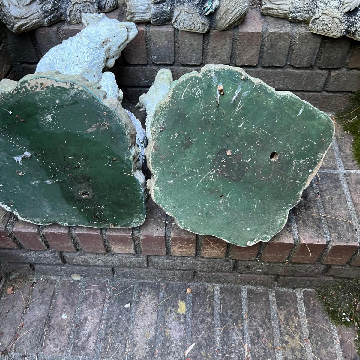 This lot contains four cat statues, five animal themed planters and a puppy fountain; all are a hard resin like material with some weather related fading. Some remnants of soil in the pots. The fountain is battery operated and was not tested.