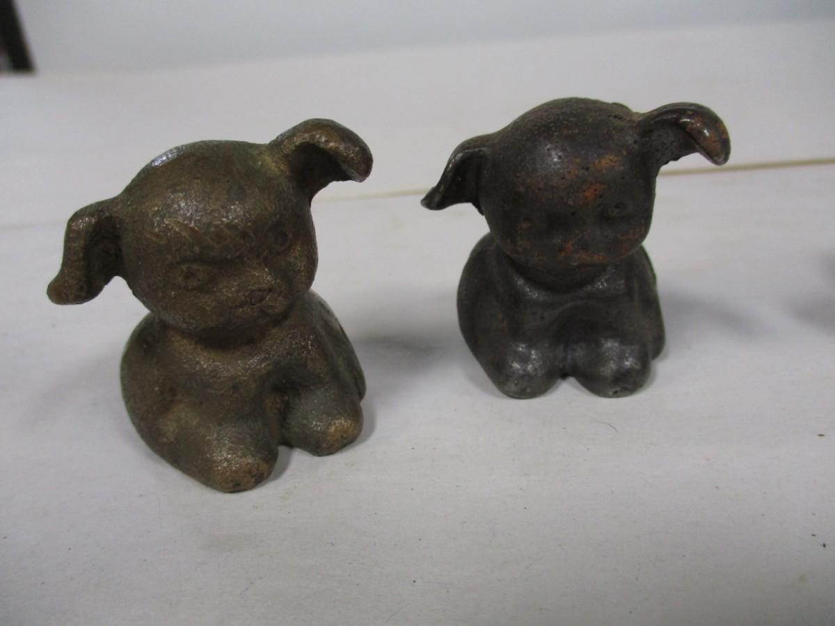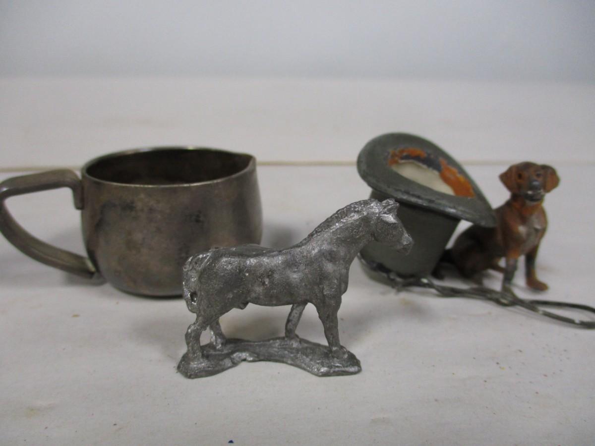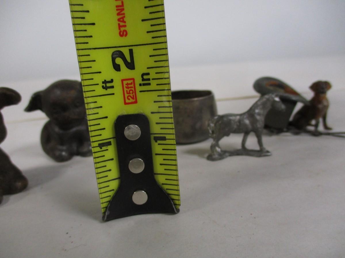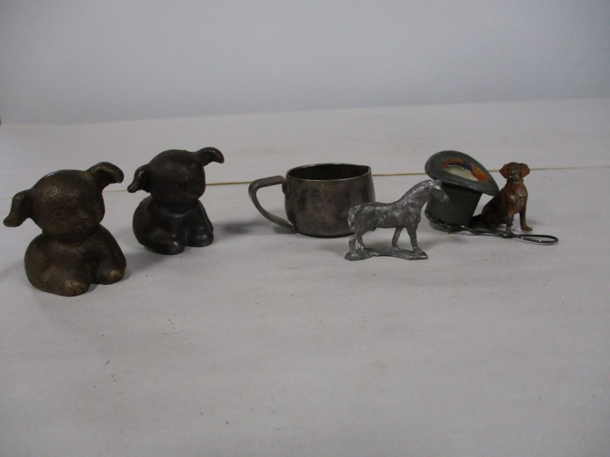 Assortment of Puppy Paperweights, Silver Plated Cup Horse, and Lead Dog with Top Hat