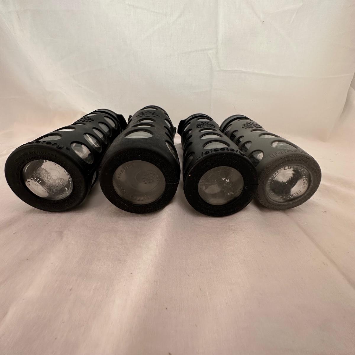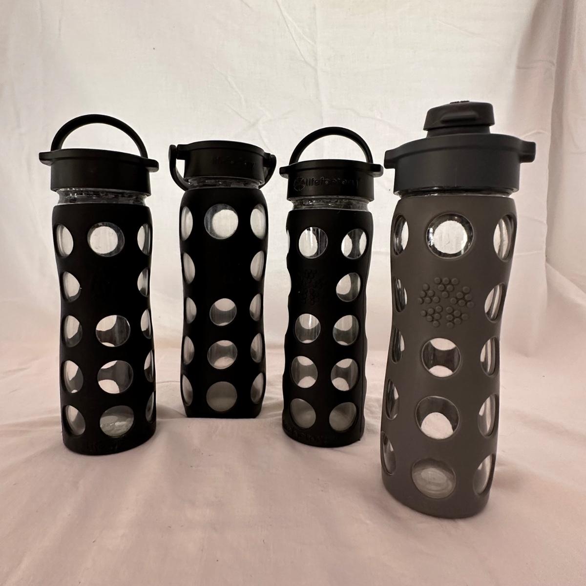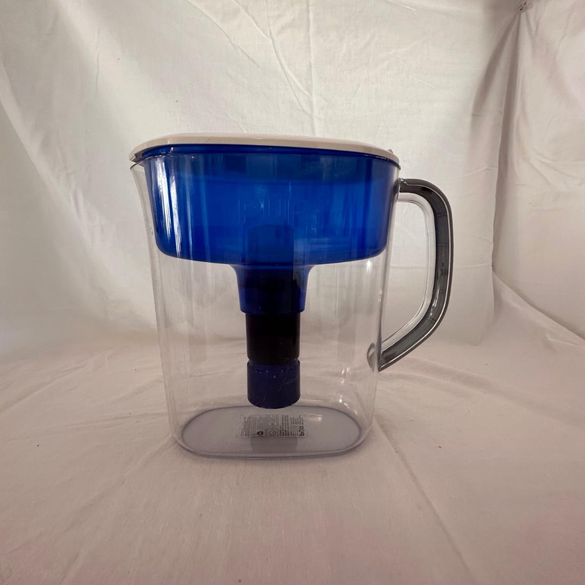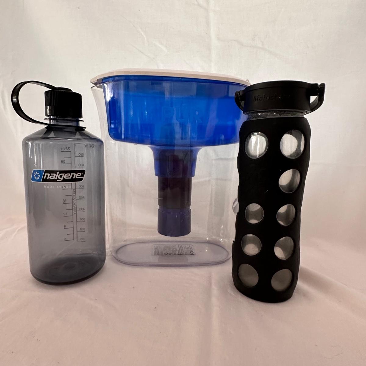 Pur water filter pitcher with one unopened replacement filter, four Lifefactory glass water bottles with rubber covers, Nalgene water bottle. Ovation water bottle carriers with zip pouch and shoulder straps. Shipping available.