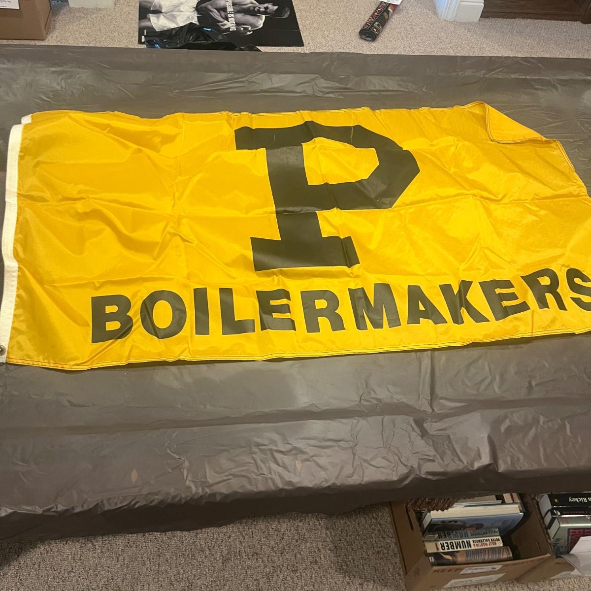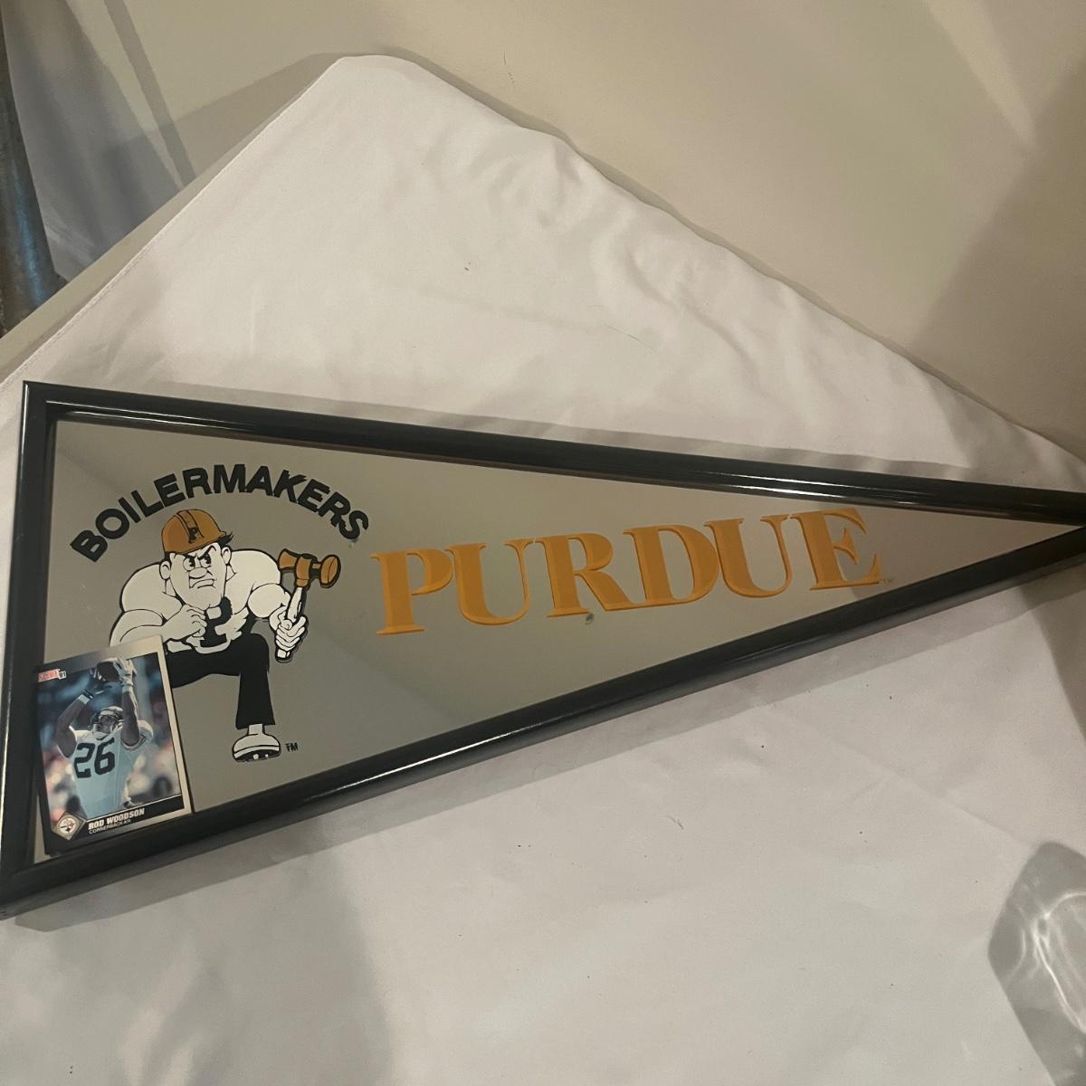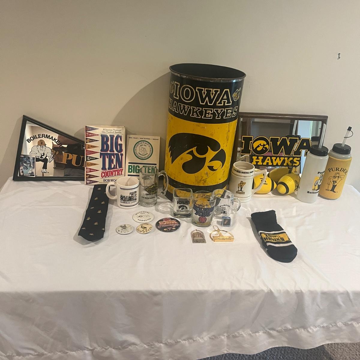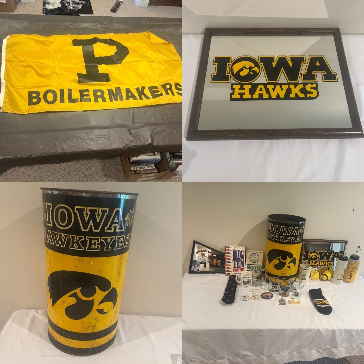 Lot includes a Purdue flag, water bottle, glasses and mugs, mirror, gold colored ornaments and more. Also includes Iowa wastebasket, mirror, tie, mittens, water bottle, glasses and more. Iowa mirror measures 15” x 13”H and Purdue flag measures 58” x 33”H.