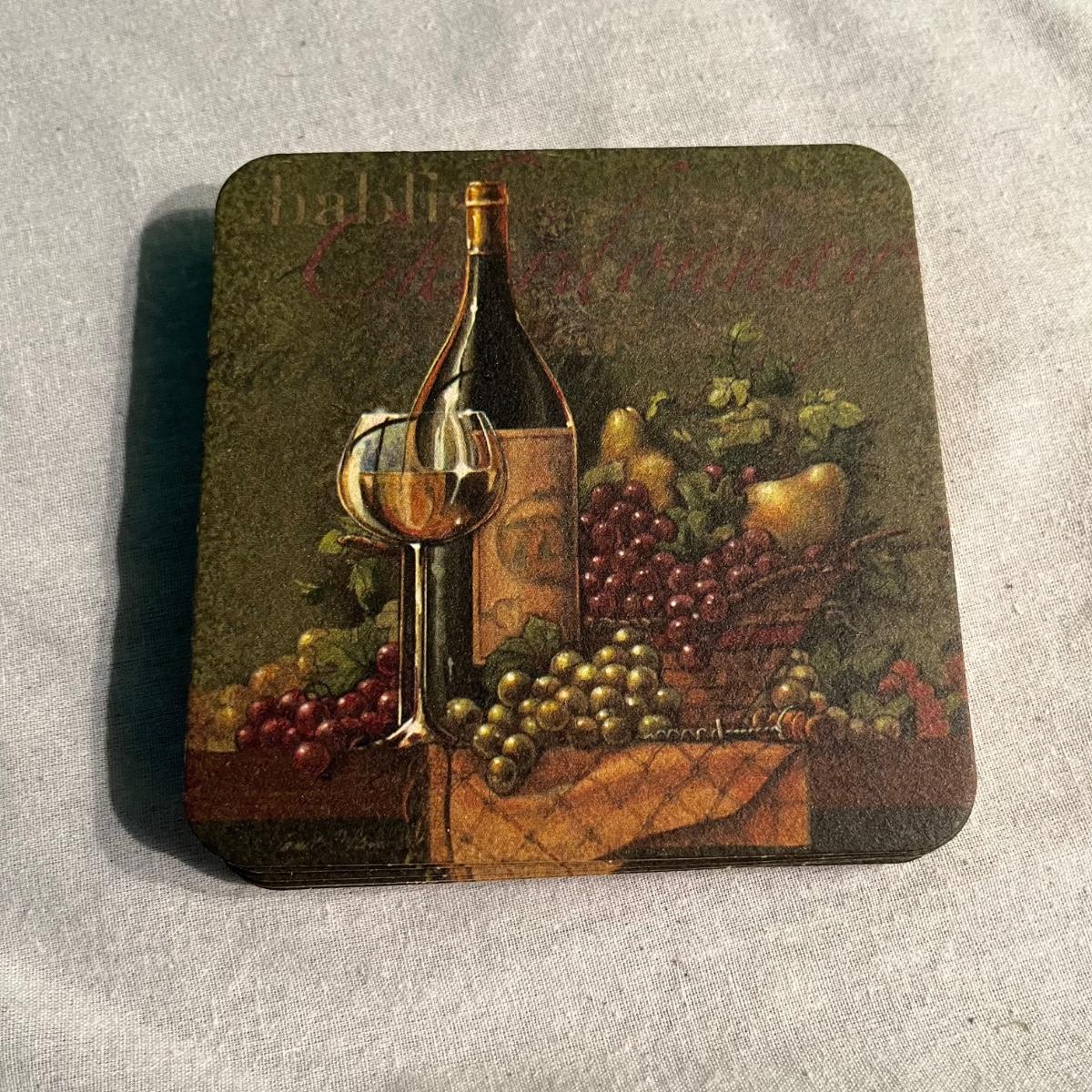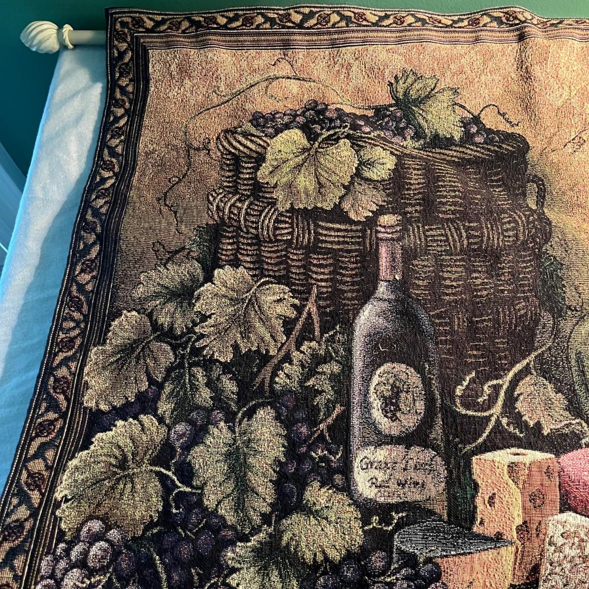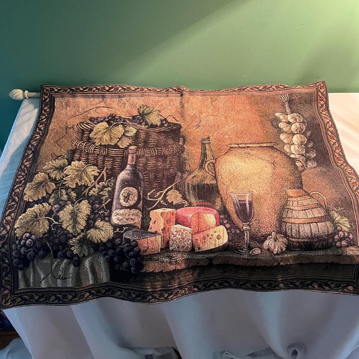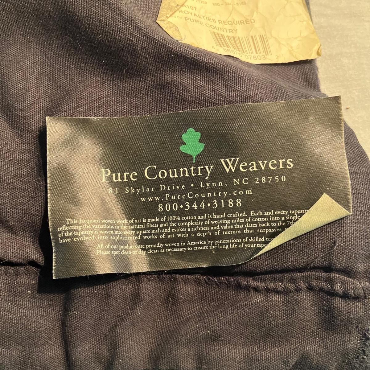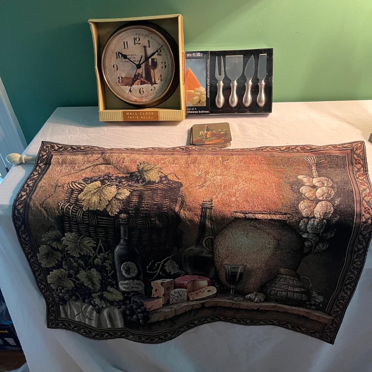 Lot includes a 25” x 30” Pure Country Weavers wall hanging Titled” Pure Country”, wall clock, eight cardboard coasters and Metálla stainless steel cheese knives. Shipping Available