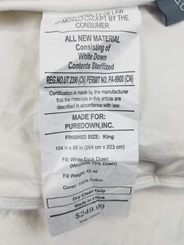 Pure Down Comforter, King Size 104" x 88". Like New, No packaging