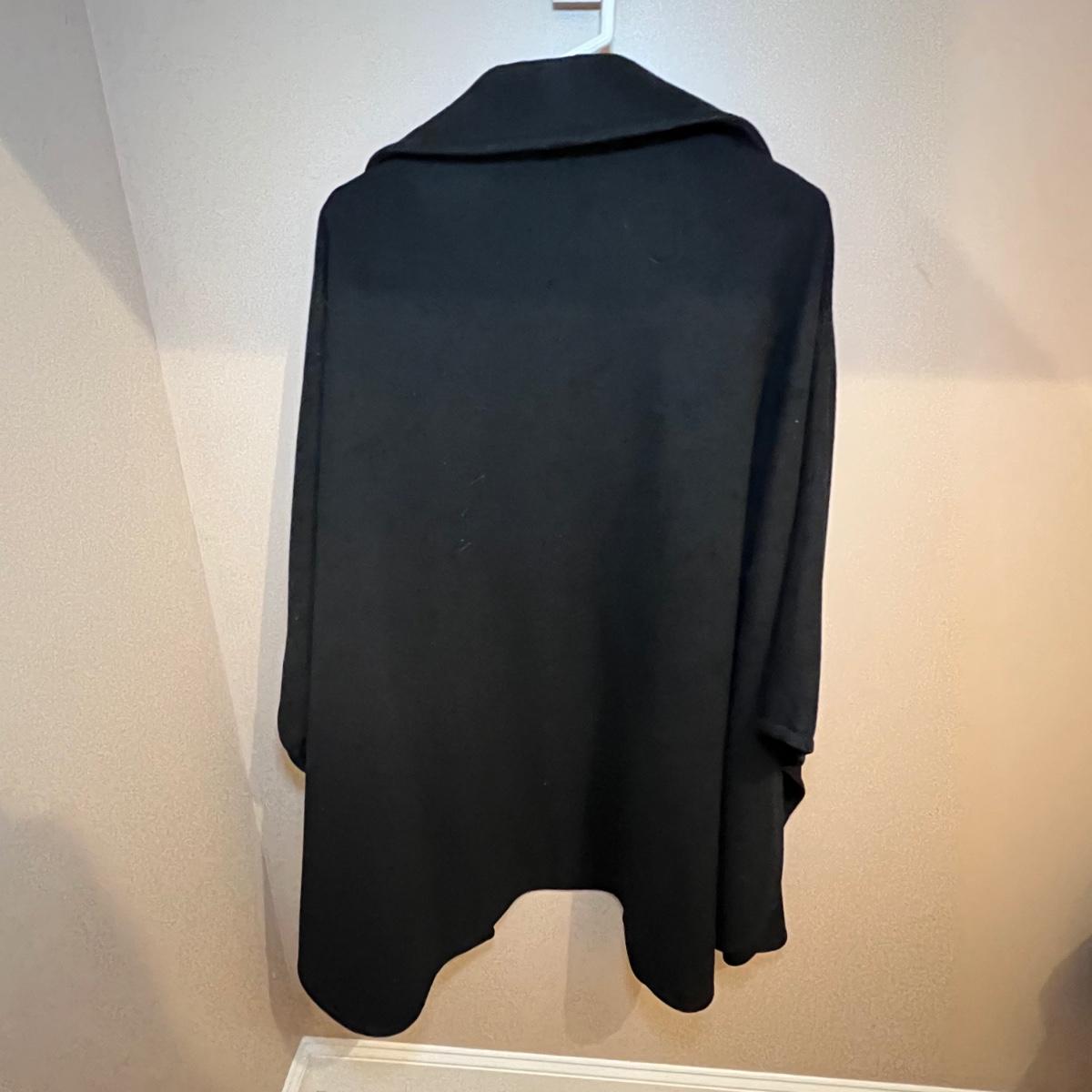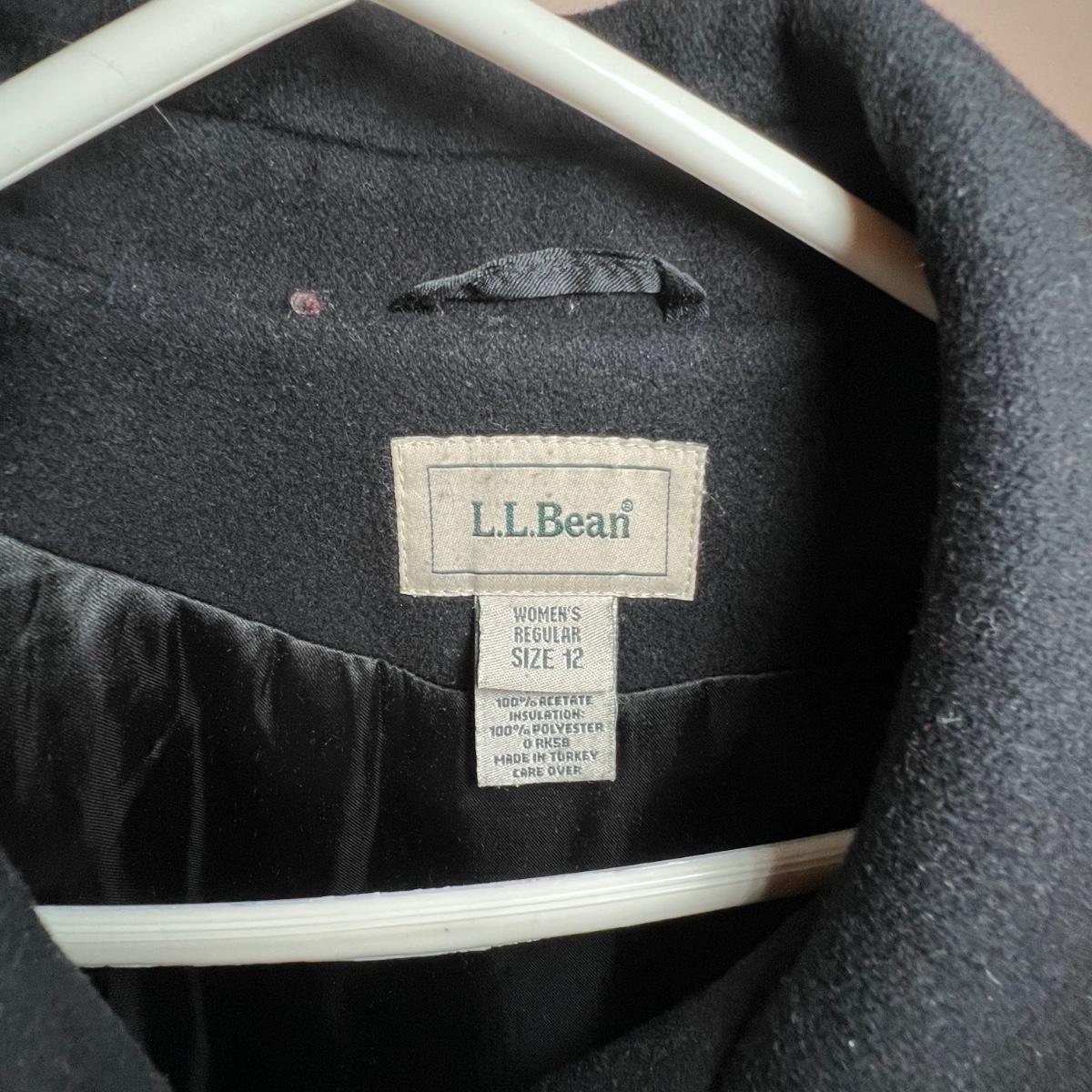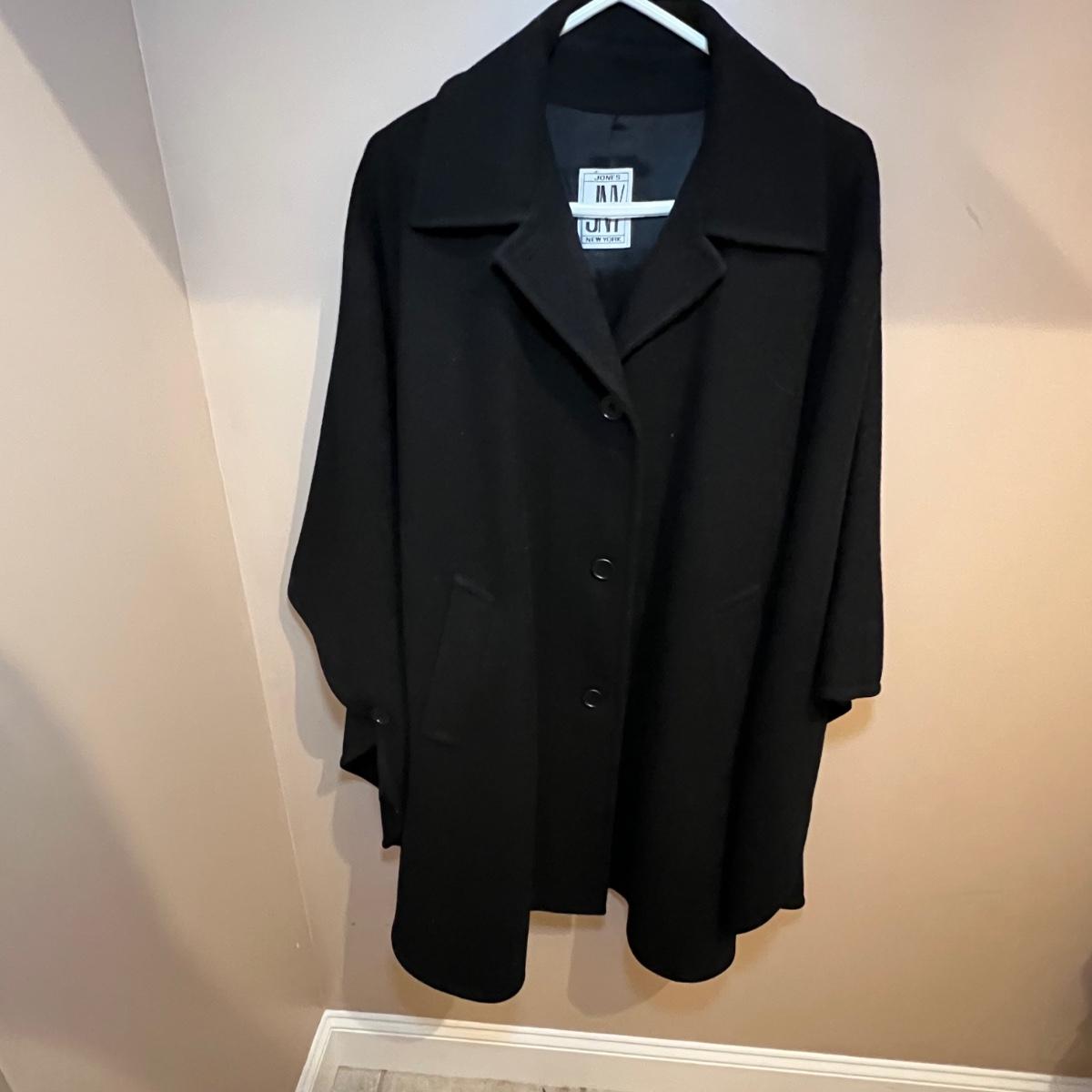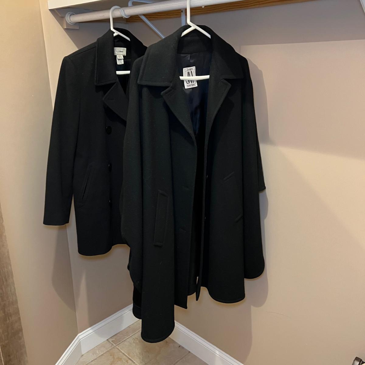 Both of these lined black jackets are wool. The LL Bean is size 12. The Jones NY is a poncho style jacket that measures approximately 17” shoulders x 39” long and would fit a range of sizes due to its loose fit.