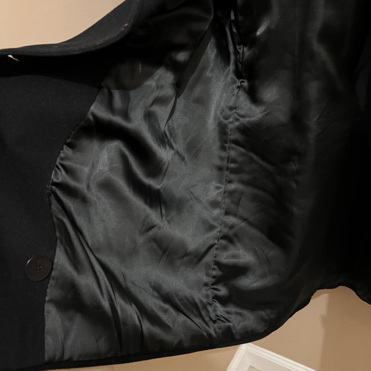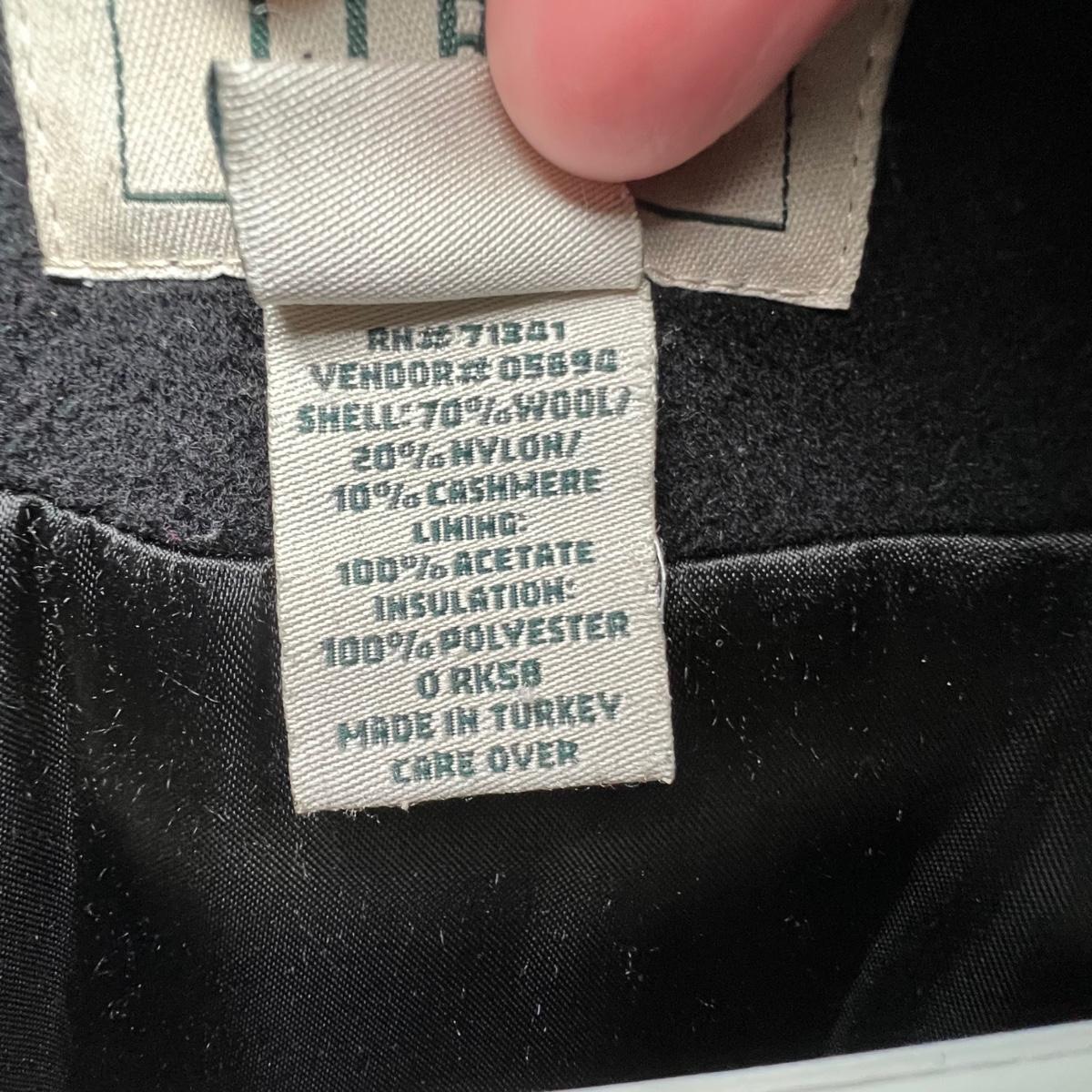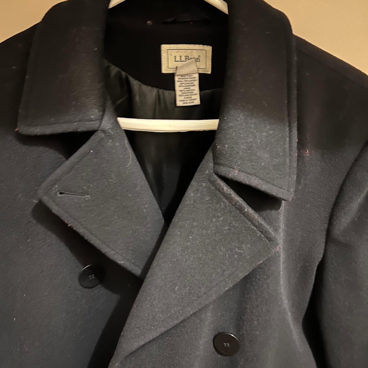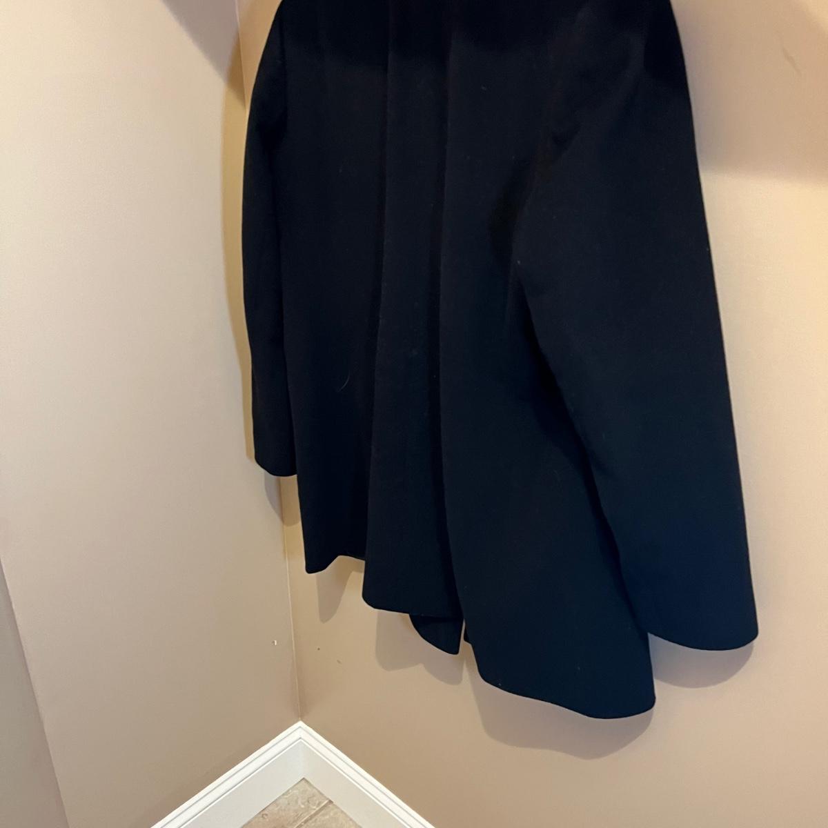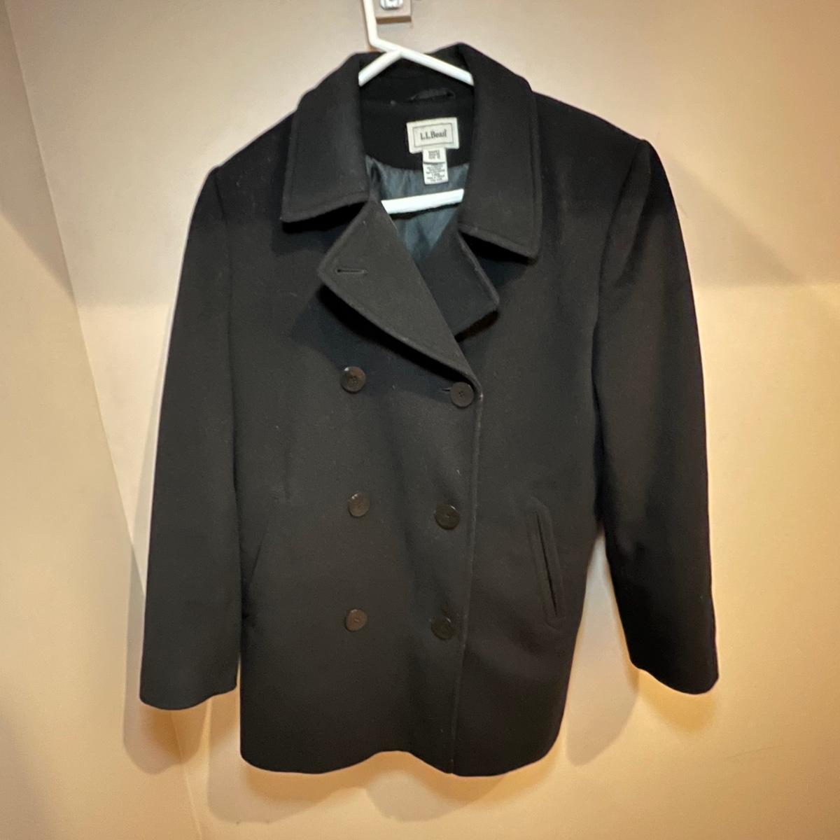 Both of these lined black jackets are wool. The LL Bean is size 12. The Jones NY is a poncho style jacket that measures approximately 17” shoulders x 39” long and would fit a range of sizes due to its loose fit.