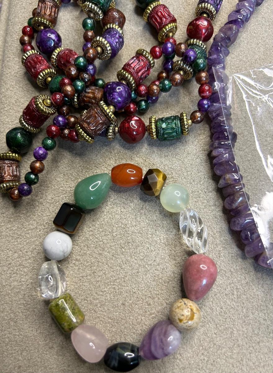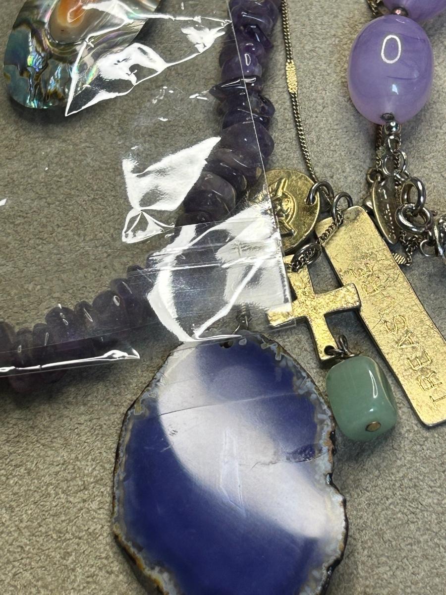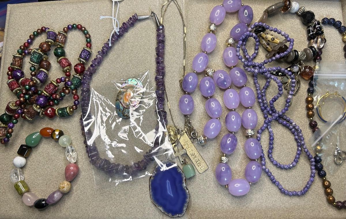 6 necklaces, 2 bracelets, 1 brooch & 2 pair of earrings. The 2nd necklace is Amethyst & I believe the 4th one is as well.