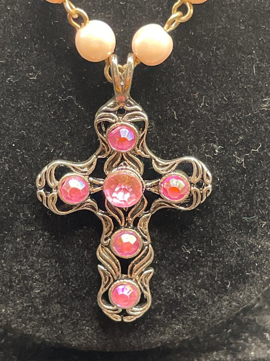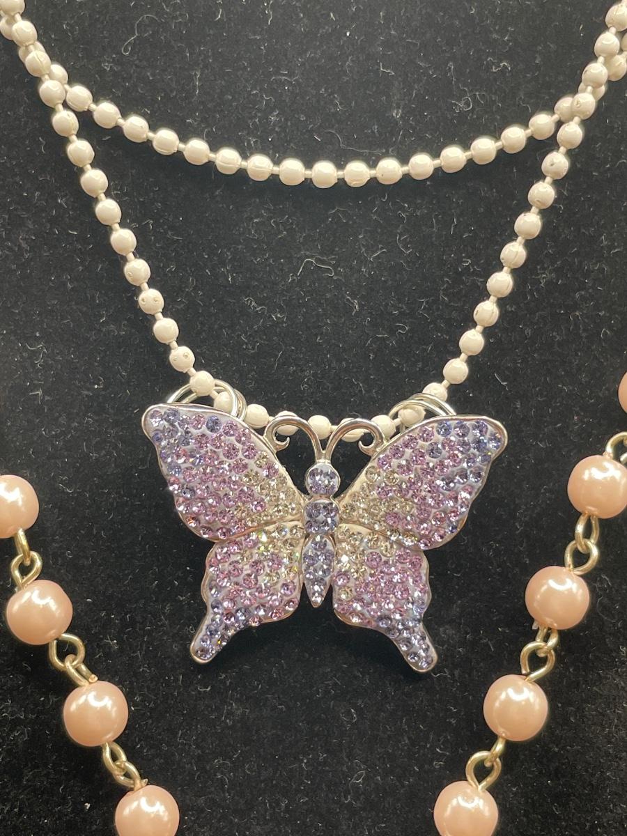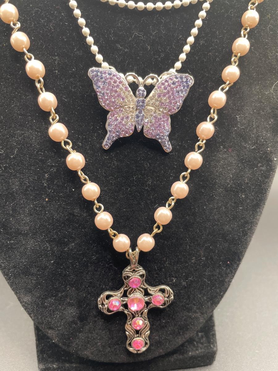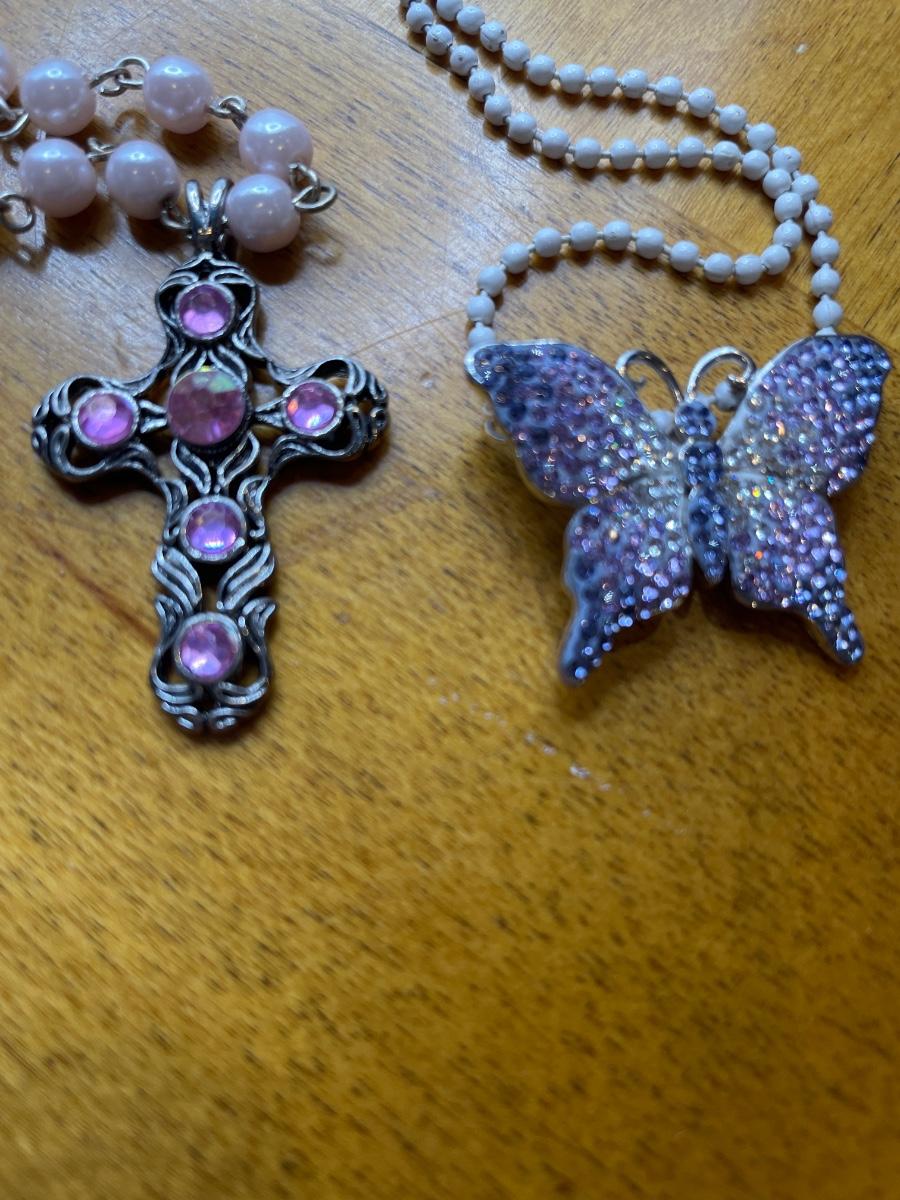 Pink cross and purple butterfly pendants
