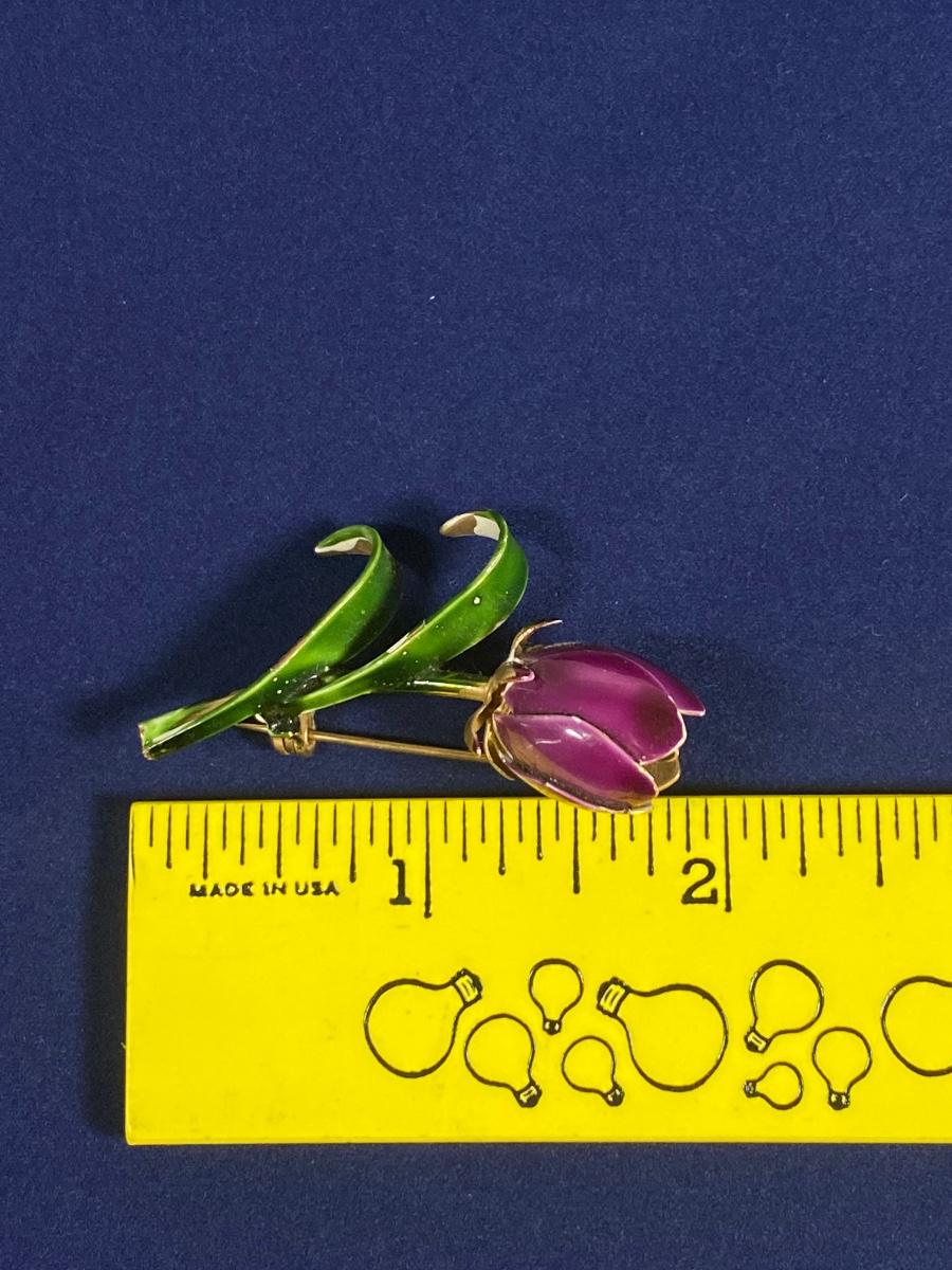 Purple Enamel Tulip Flower Pin Brooch. Some light wear along the edges. About 2" size.