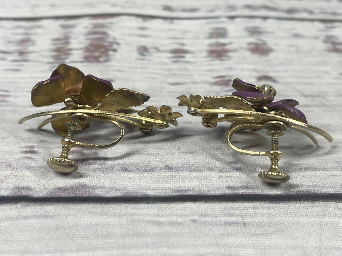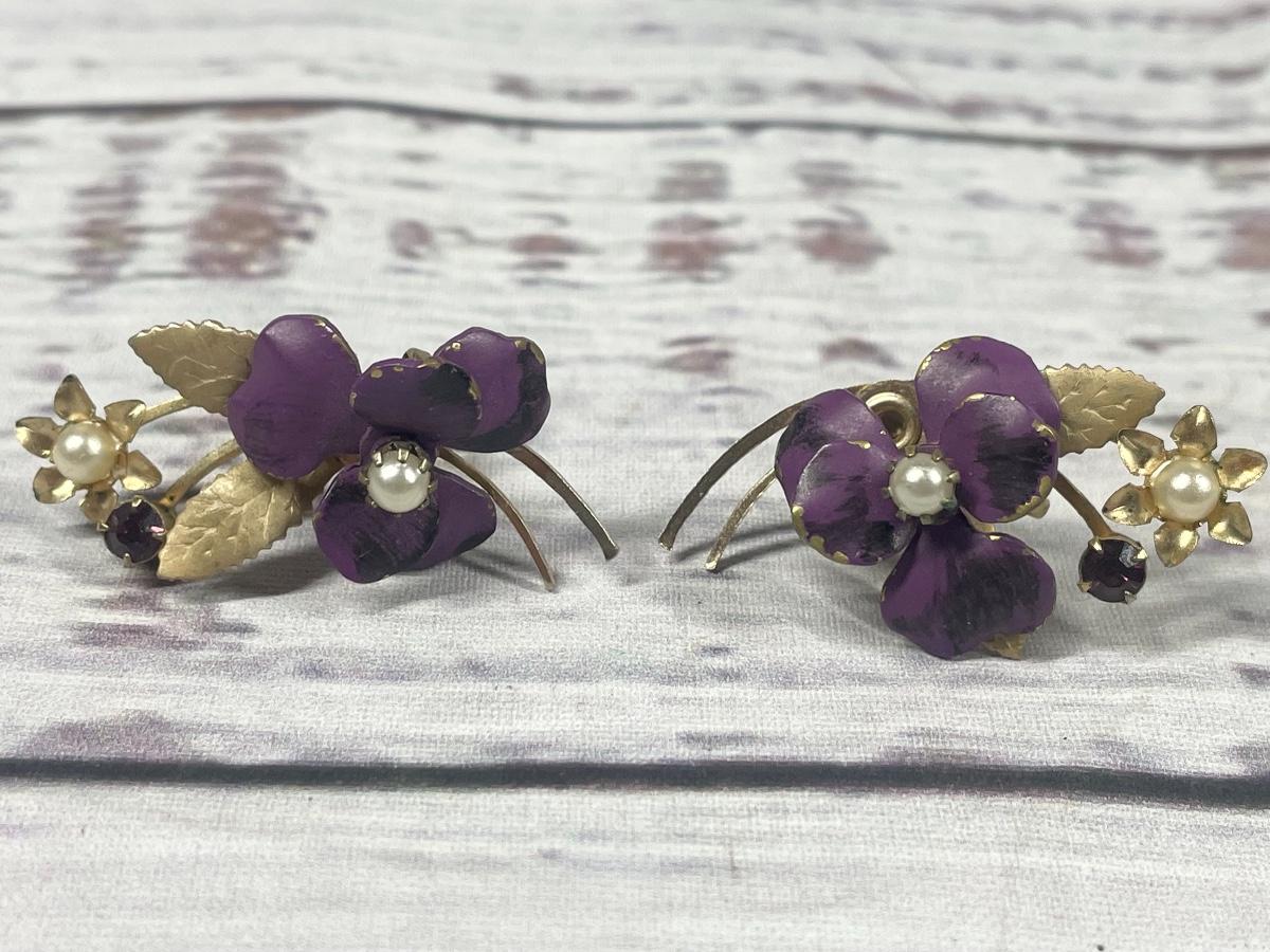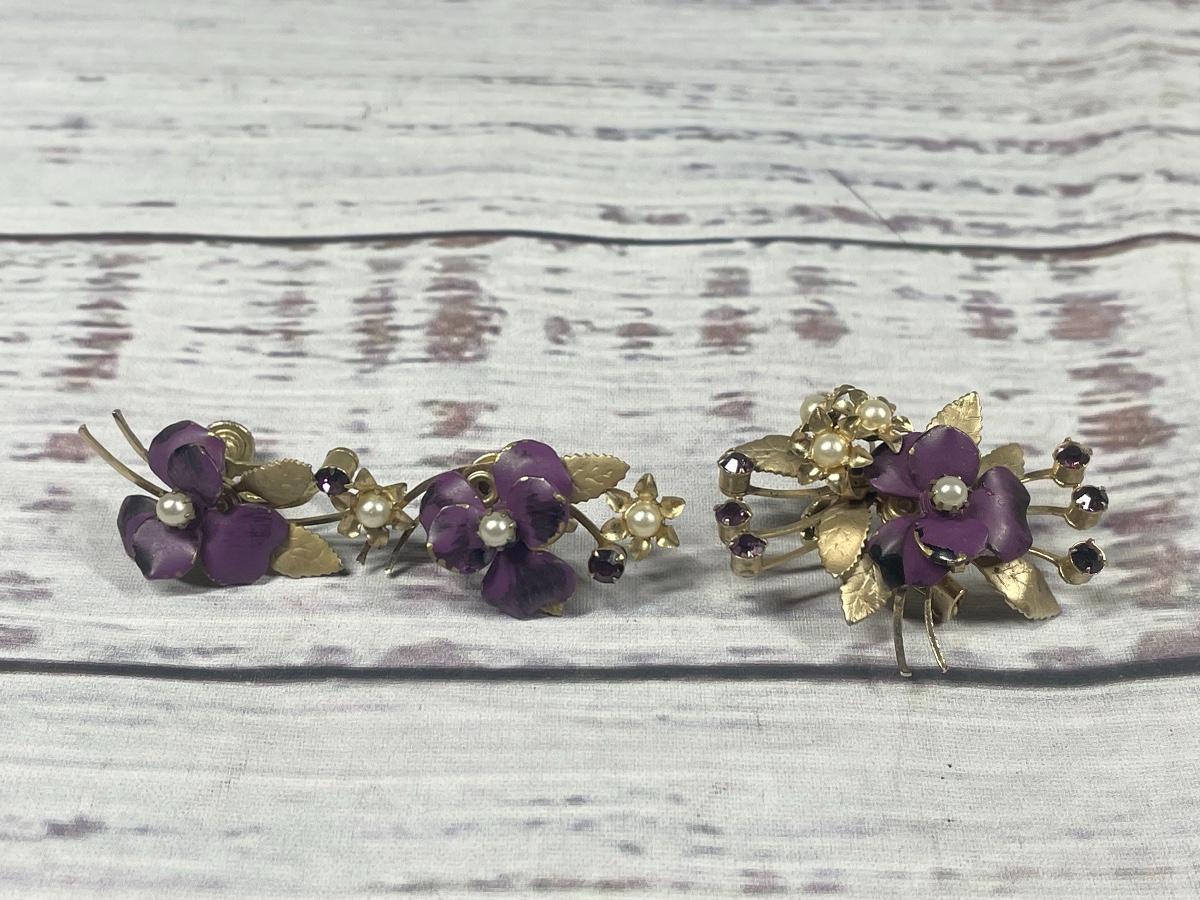 Vintage Metal Purple Flower Designed Clip on Earrings & Matching Pin