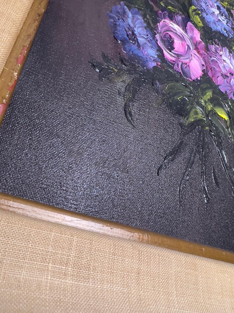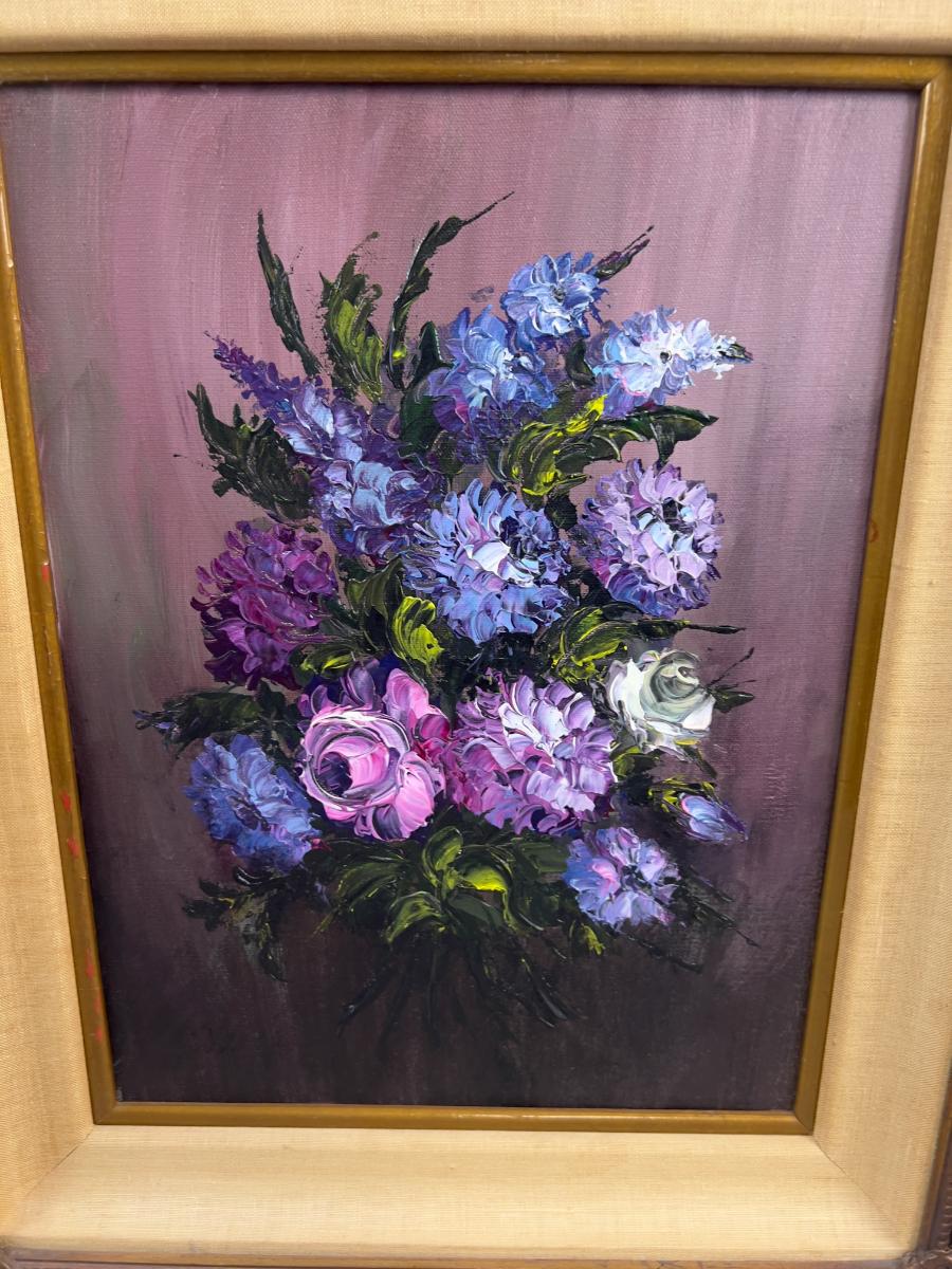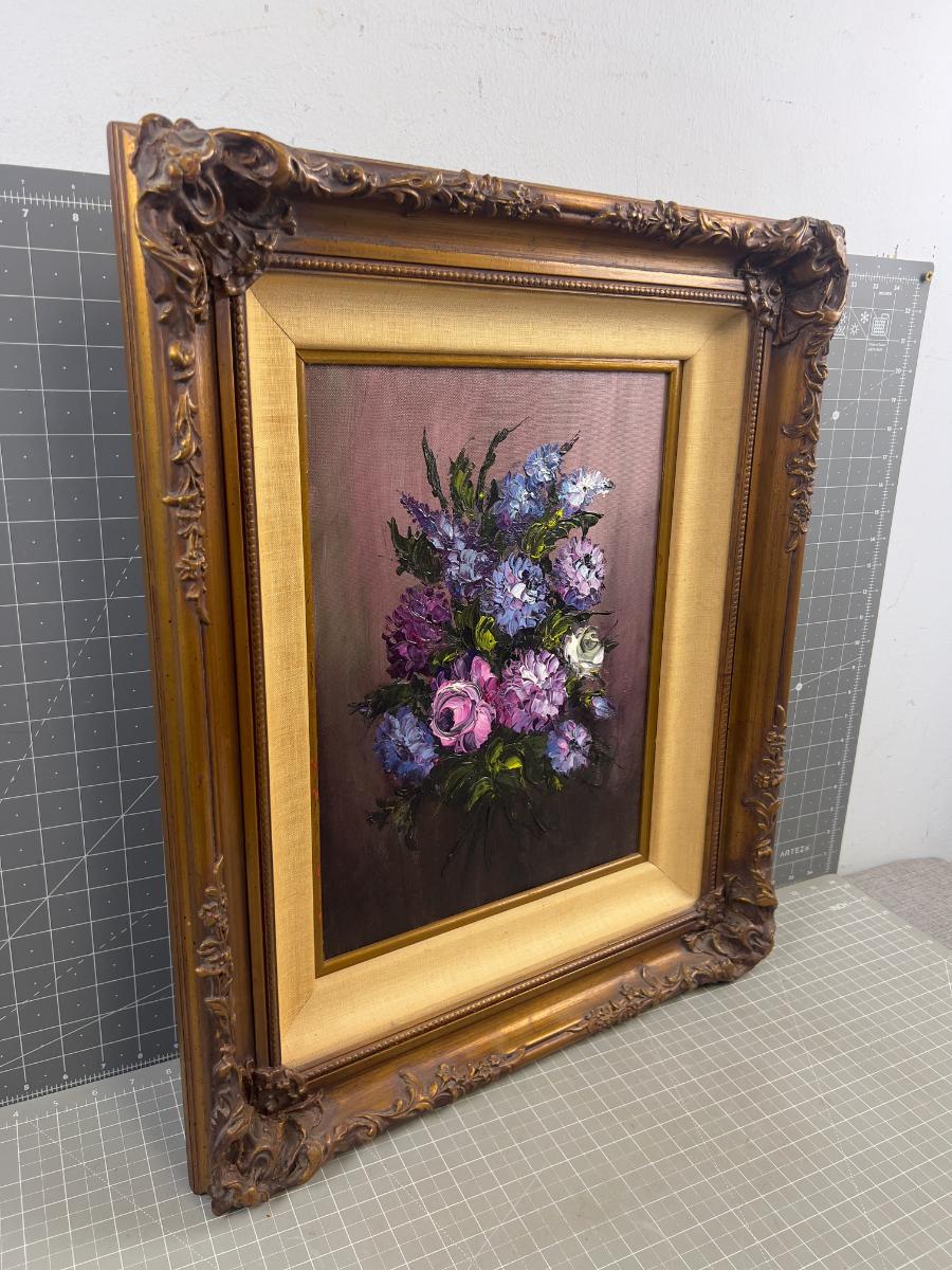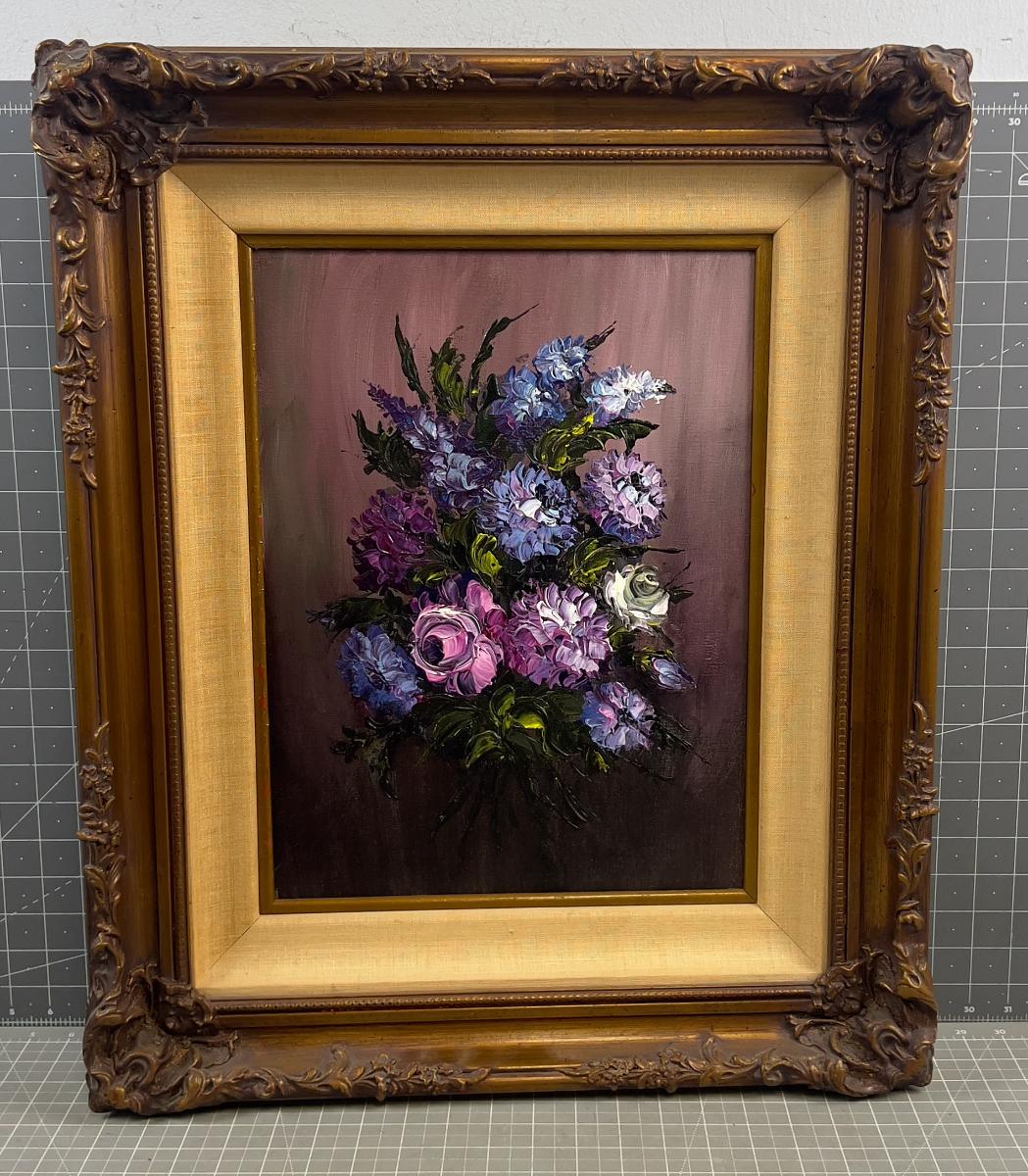 Purple Flowers, Signed, Oil on Canvas With Gold toned Frame