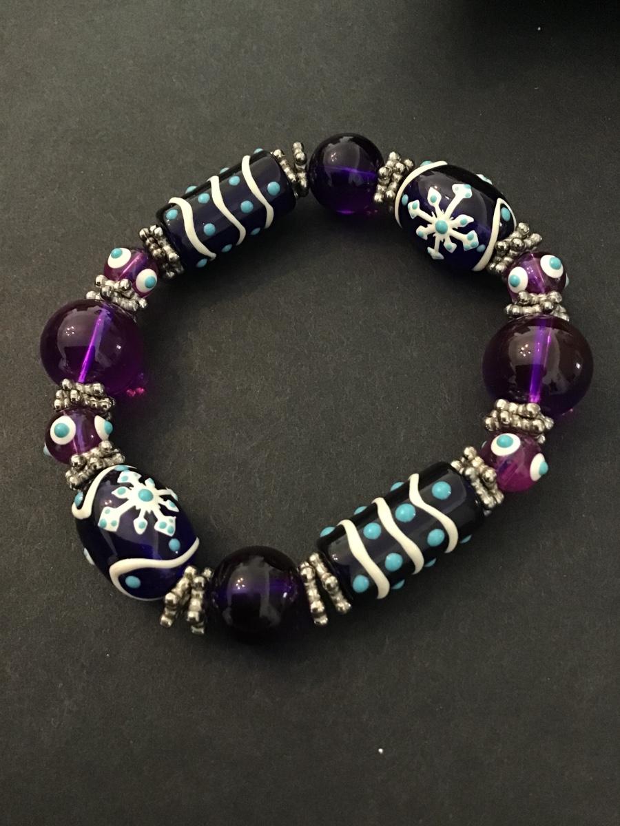 Purple glass art beaded stretch bracelet