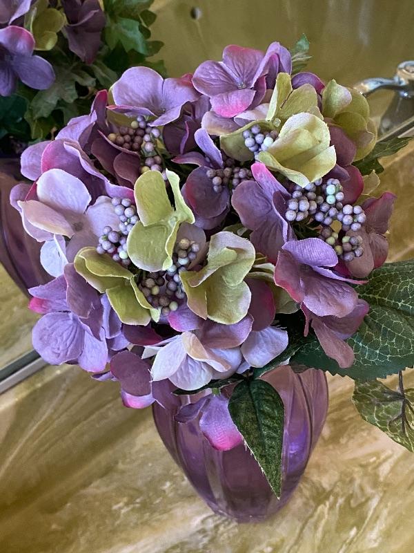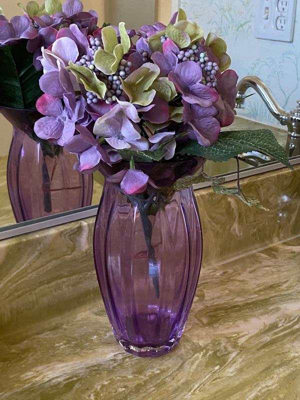 Purple Glass Vase with Faux Purple Flowers