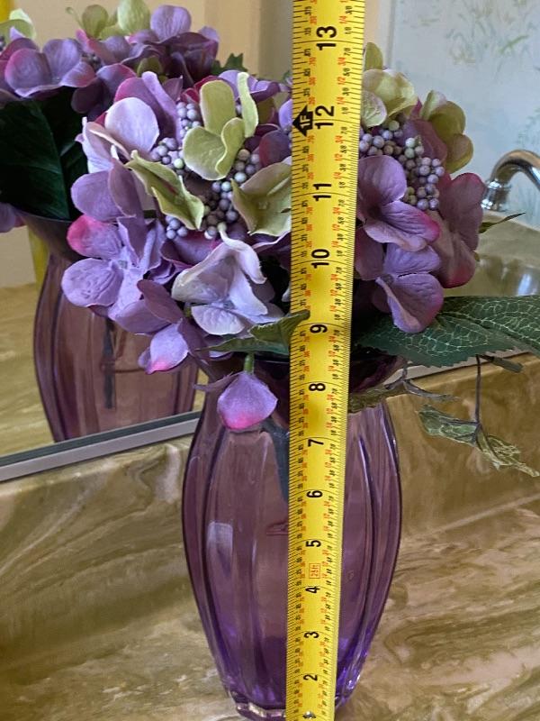 Purple vase with faux flowers. About 12" size.