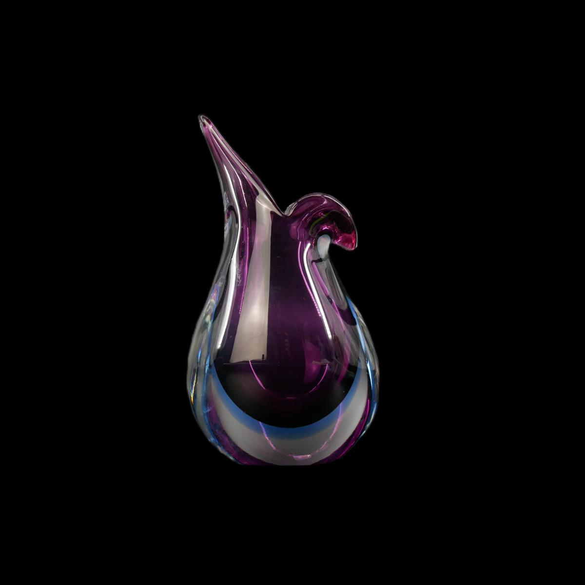 Gorgeous vintage Murano glass vase sculpture. Deep purple amethyst color and exceptional craftsmanship and design. Stickers read "Formia Ventri Di Murano Made in Italy" and "Made in Murano Italy". Truly a beautiful piece! Very small scuff marks that come from the age of the piece, no chips or damage. Superb condition. Measures approximately L 4.5" x H 7.5" x W 3". Circumference around largest area is 11." Weighs 2 lb 14 oz. (G4)