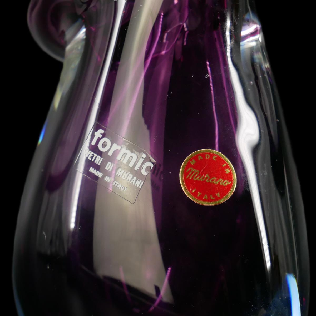 Gorgeous vintage Murano glass vase sculpture. Deep purple amethyst color and exceptional craftsmanship and design. Stickers read "Formia Ventri Di Murano Made in Italy" and "Made in Murano Italy". Truly a beautiful piece! Very small scuff marks that come from the age of the piece, no chips or damage. Superb condition. Measures approximately L 4.5" x H 7.5" x W 3". Circumference around largest area is 11." Weighs 2 lb 14 oz. (G4)