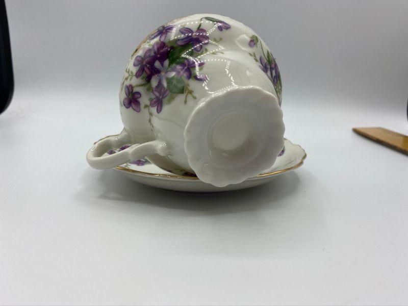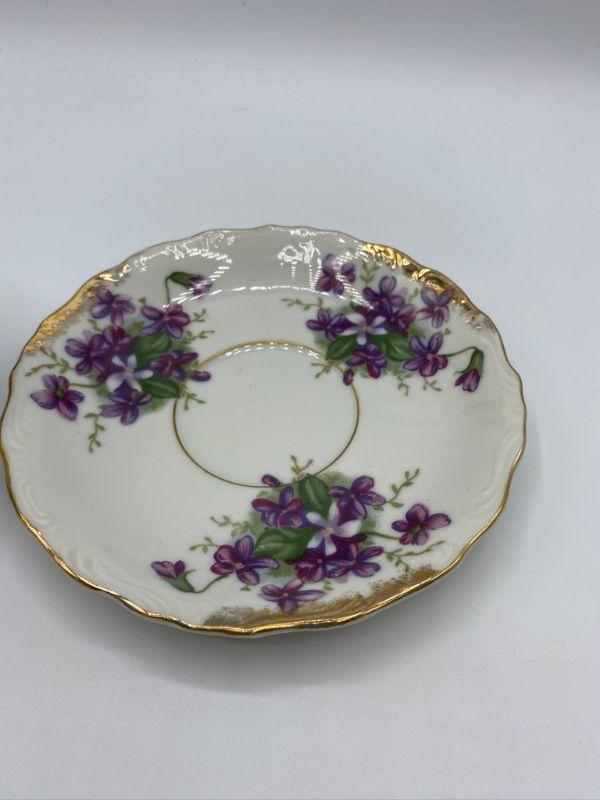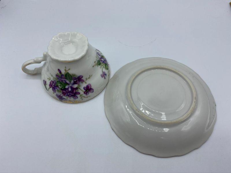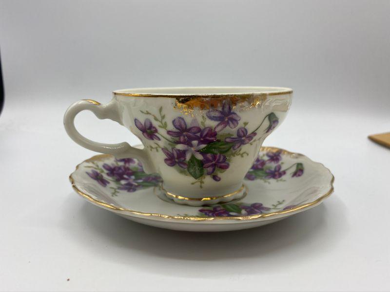 Purple pansy flower tea cup & saucer. Gold accent edges. Good condition, no chips. No makers mark.