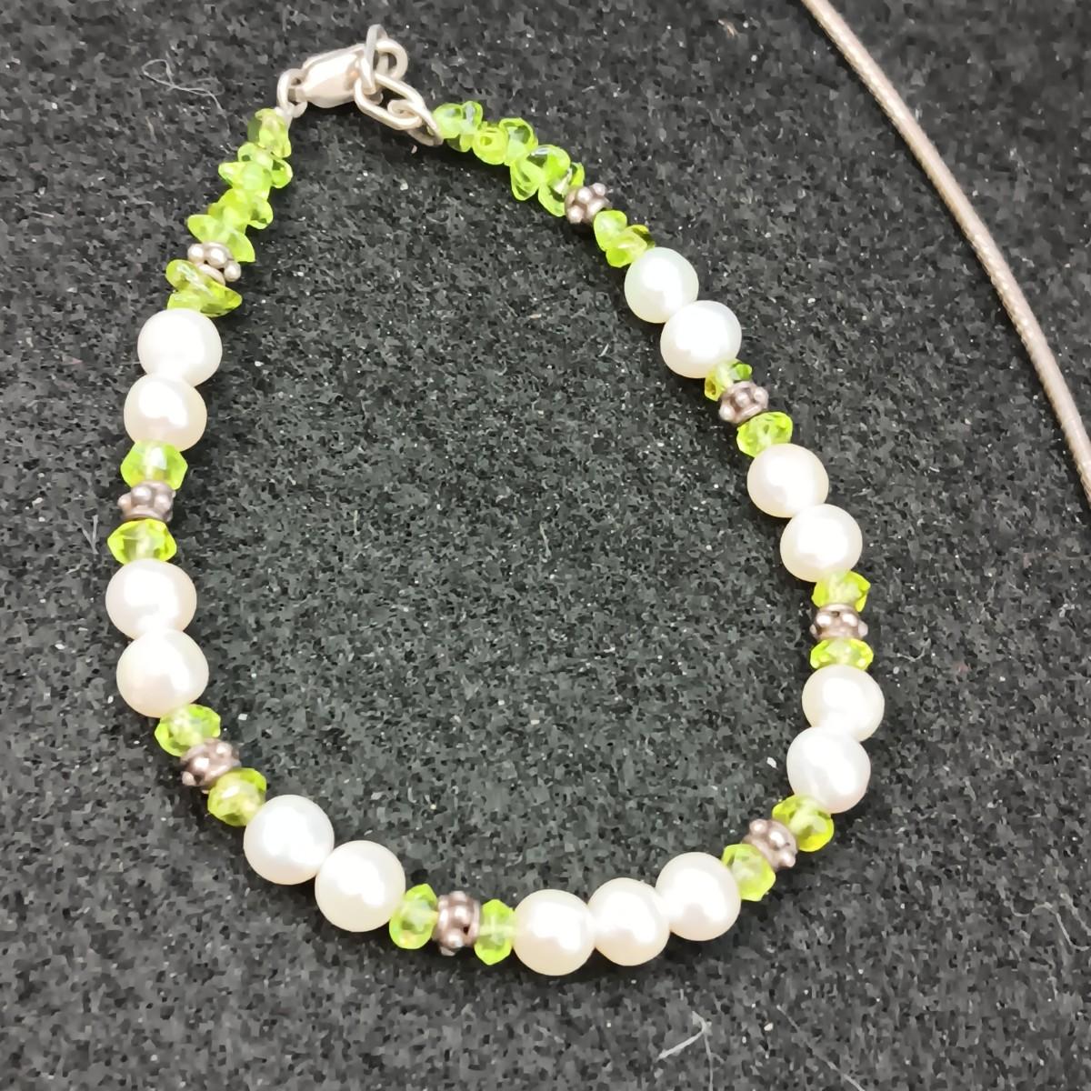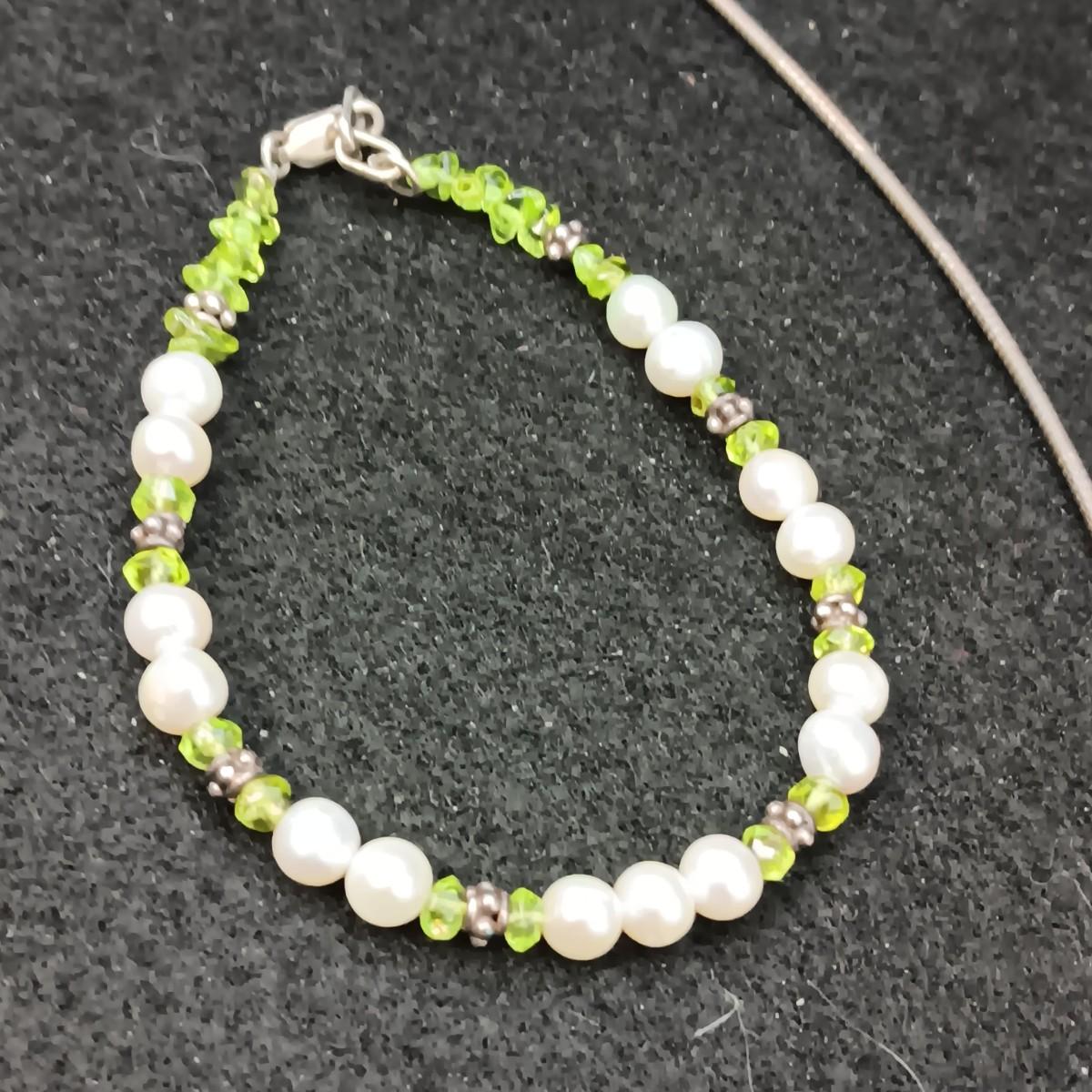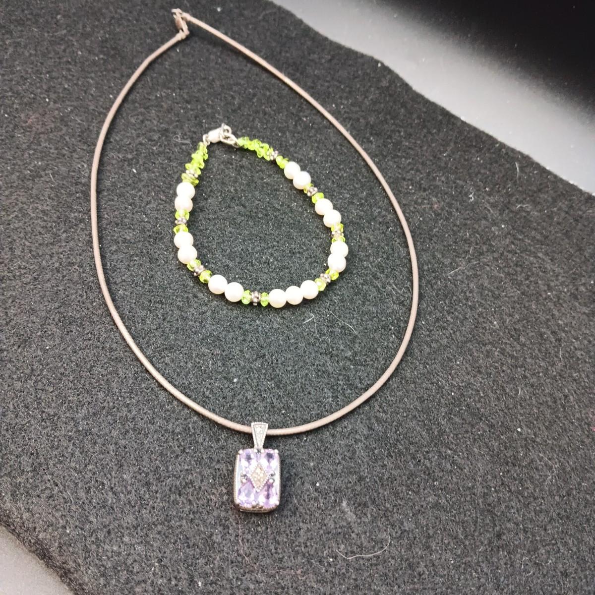 PURPLE STONES SET IN STERLING W/SILVER CHAIN PLUS PEARL & GLASS BEADED BRACELET
