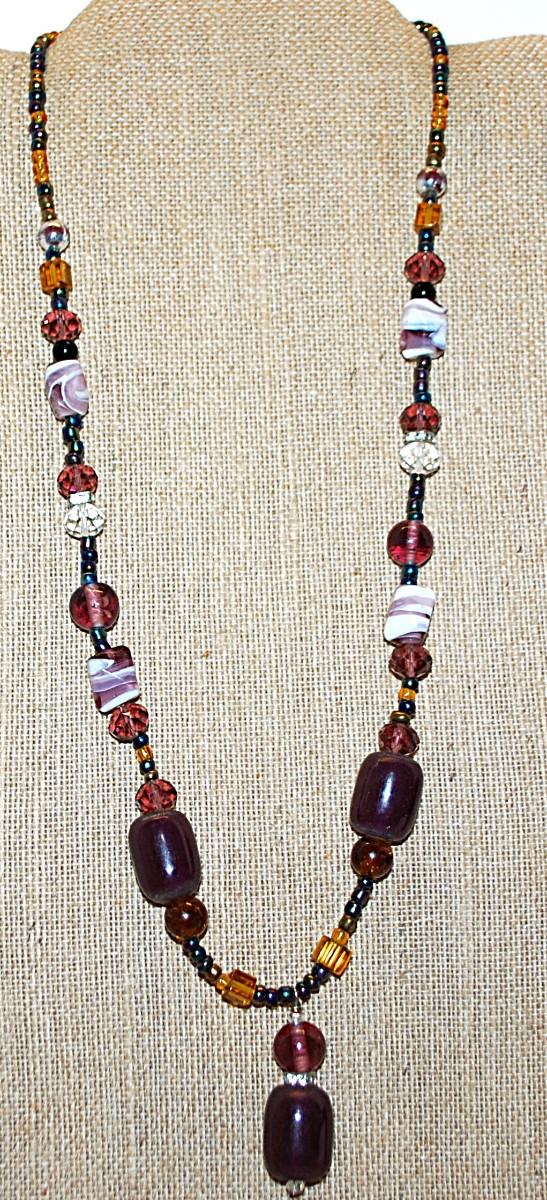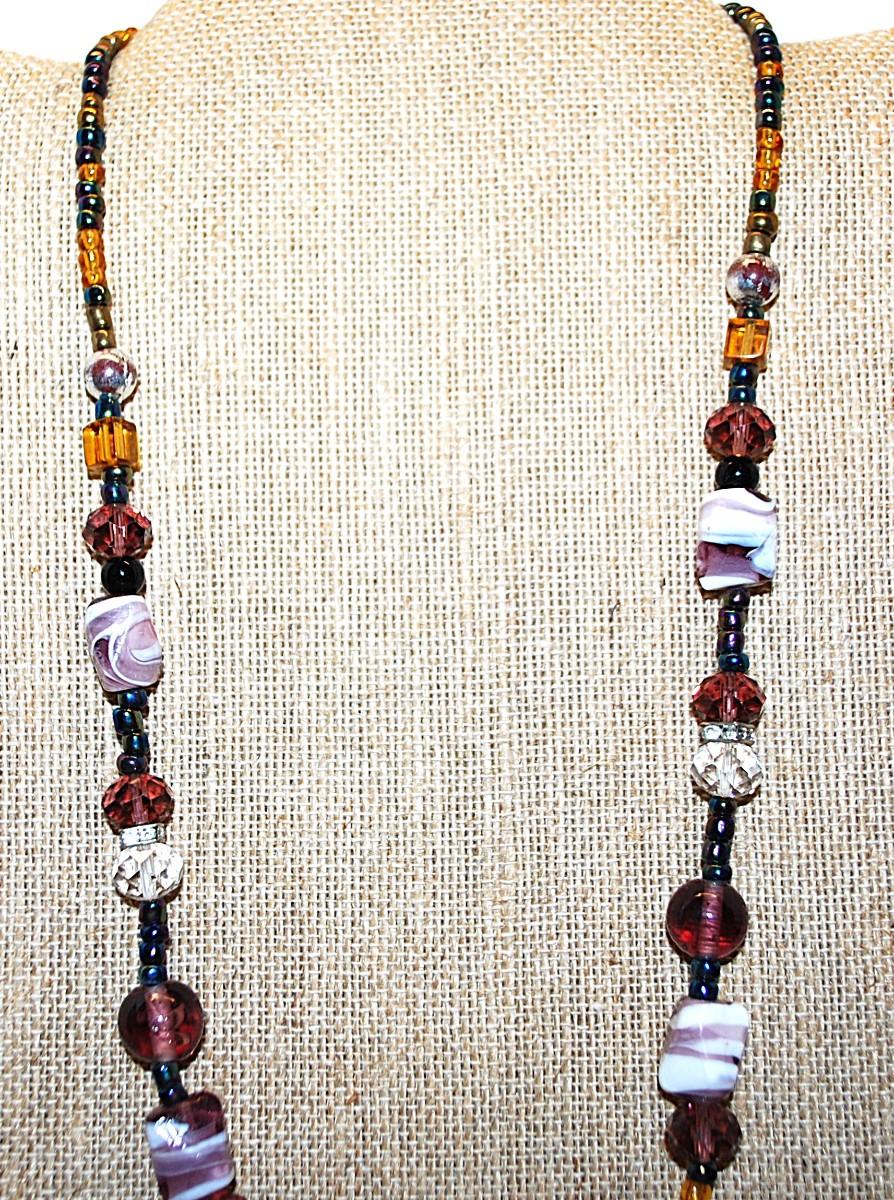 Purple & White Barrels, Globes, Chunk Stones NECKLACE with Amber, Clear + Green Highlight Stones and Screw Barrel Clasp 27" L