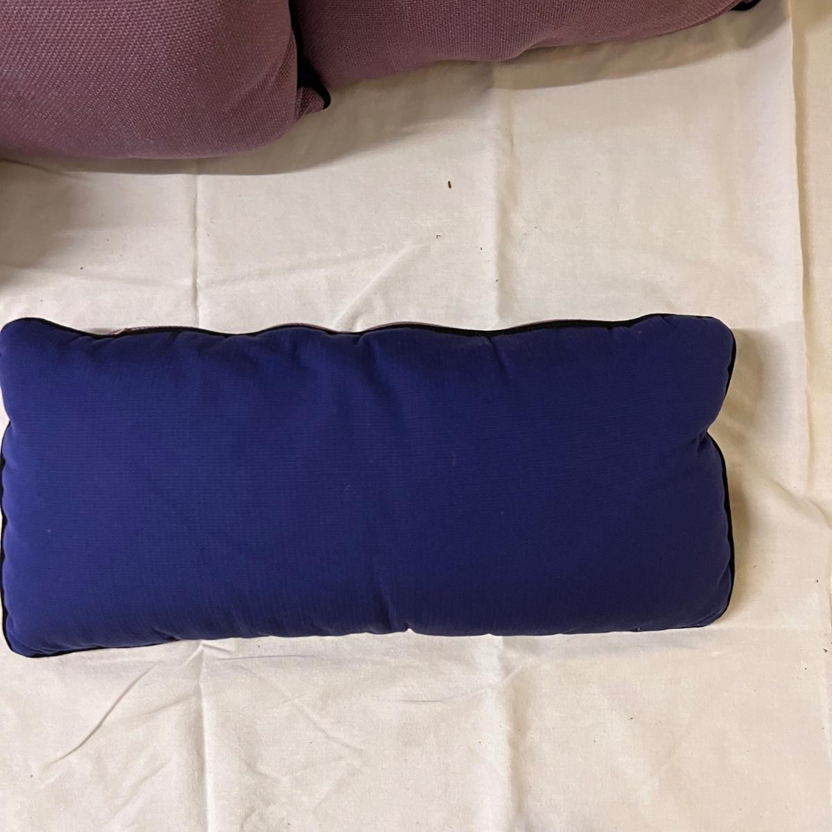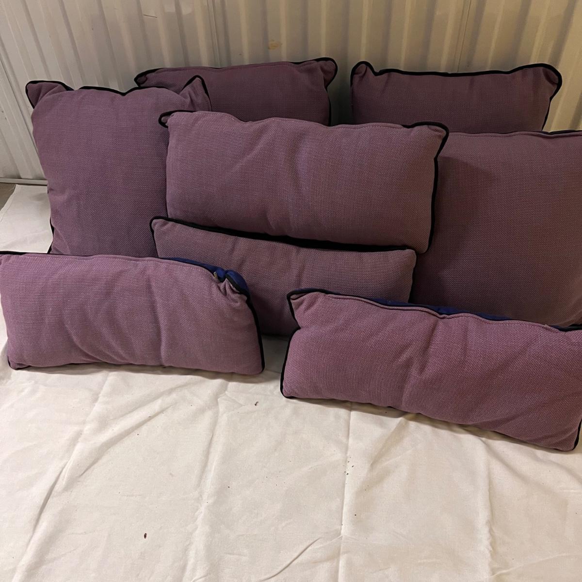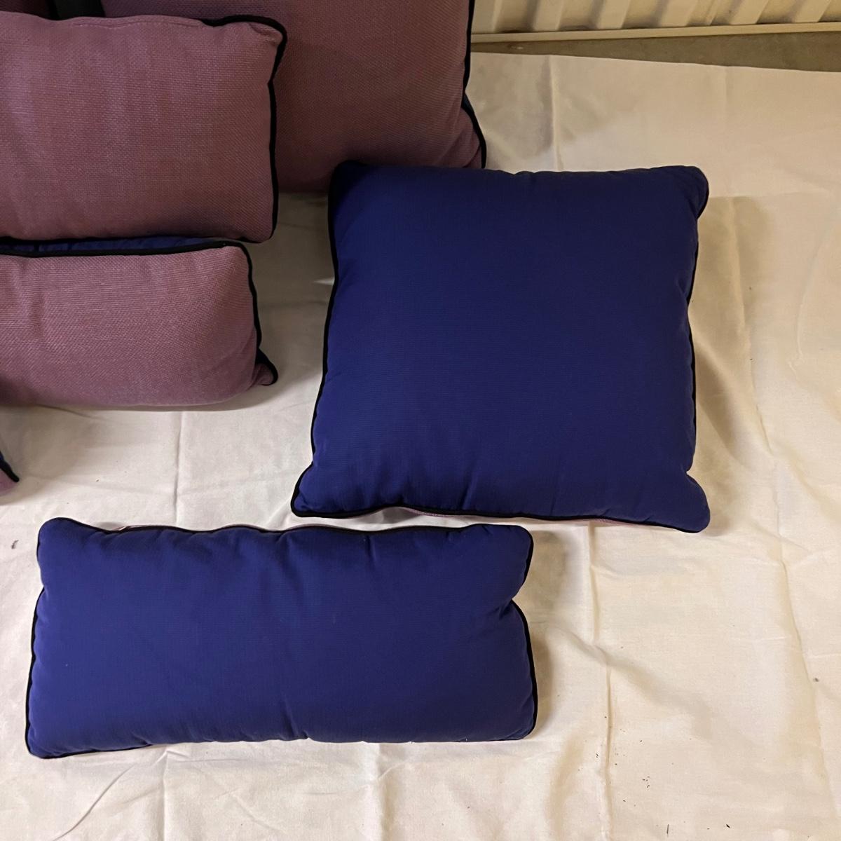 Four square and four smaller rectangle cushions have a light purple tweed like fabric with navy blue backs. Fabric feels very durable, these could be used for patio or indoor accent cushions. They have removable covers; note the cushions inside have some mildew marks.