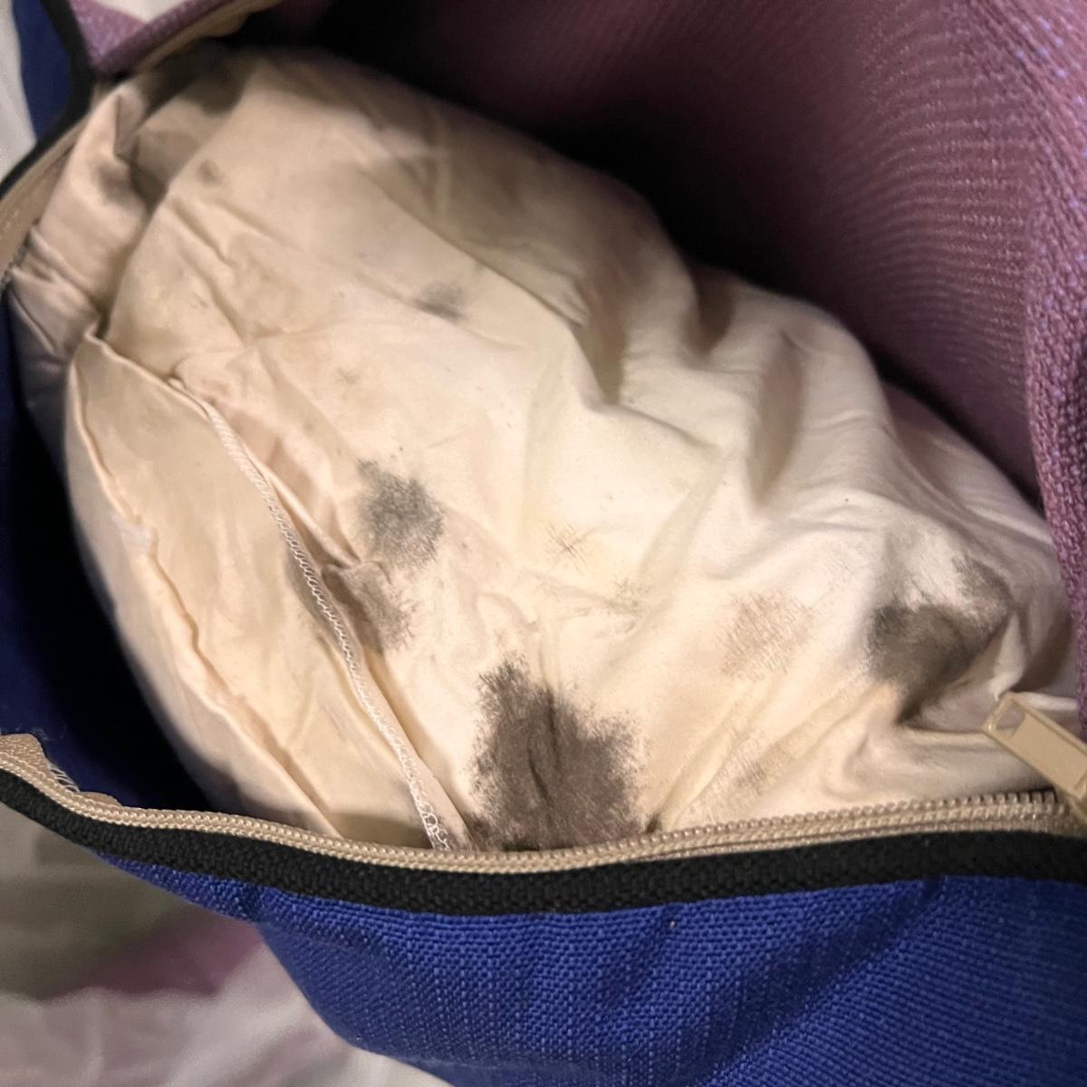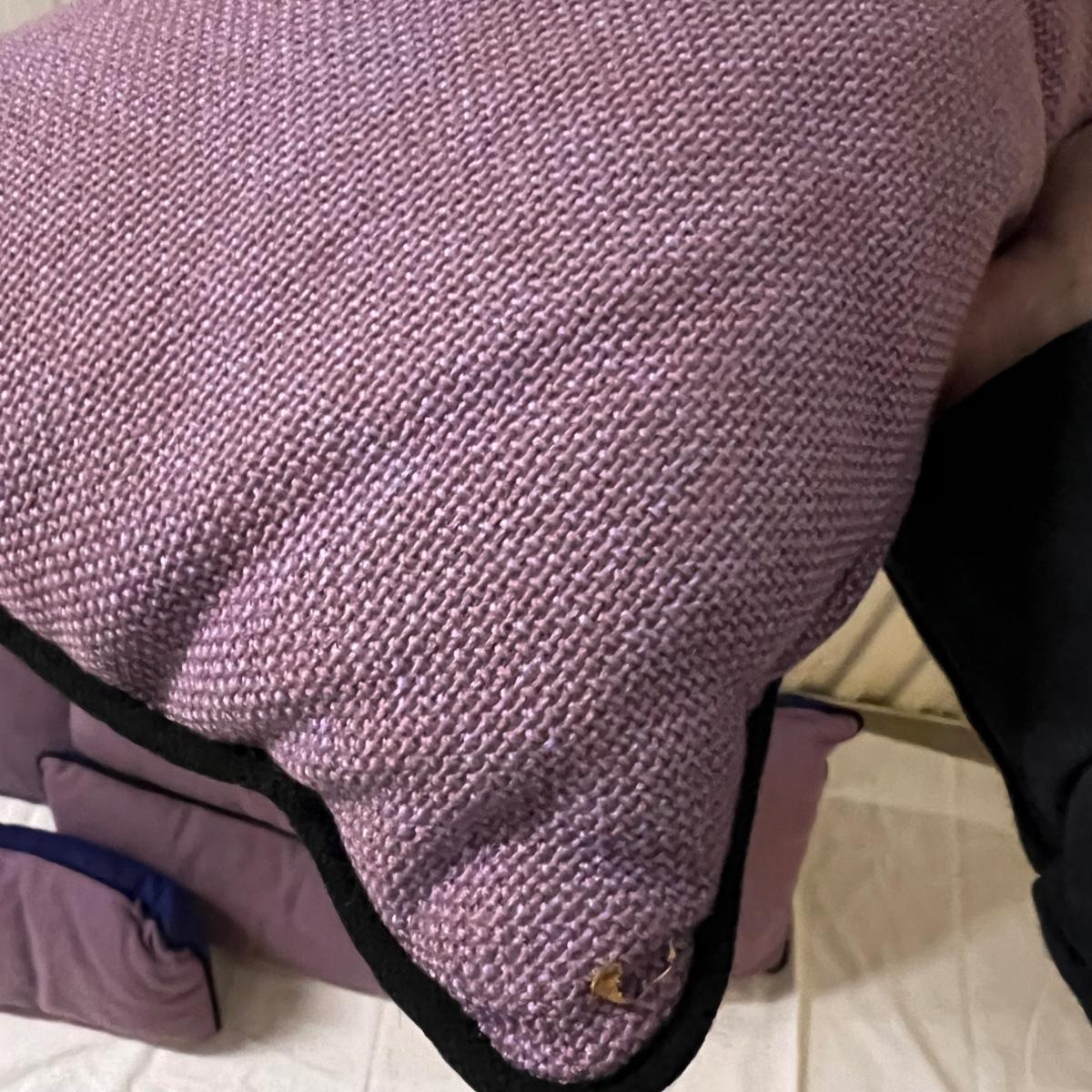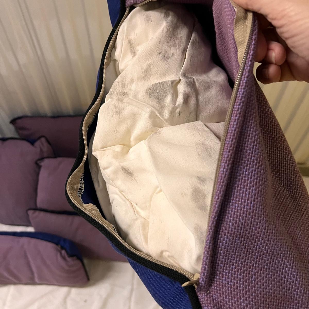 Four square and four smaller rectangle cushions have a light purple tweed like fabric with navy blue backs. Fabric feels very durable, these could be used for patio or indoor accent cushions. They have removable covers; note the cushions inside have some mildew marks.