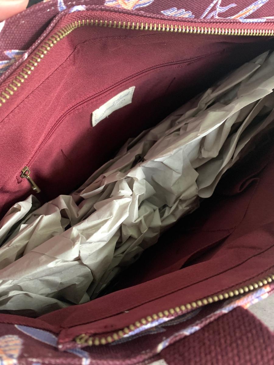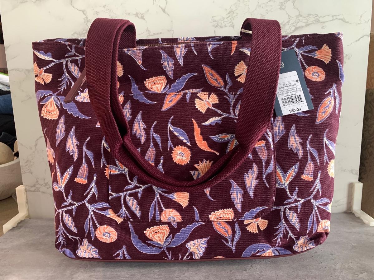 Universal Threads burgundy, with purple and pink floral two strap tote bag. On the front of the bag, there is a pouch pocket. There is a zipper across the top for closure. Inside the bag, there is a burgundy lining, with a zipper pocket against the back wall. Against the front wall, there are two pouch pockets.