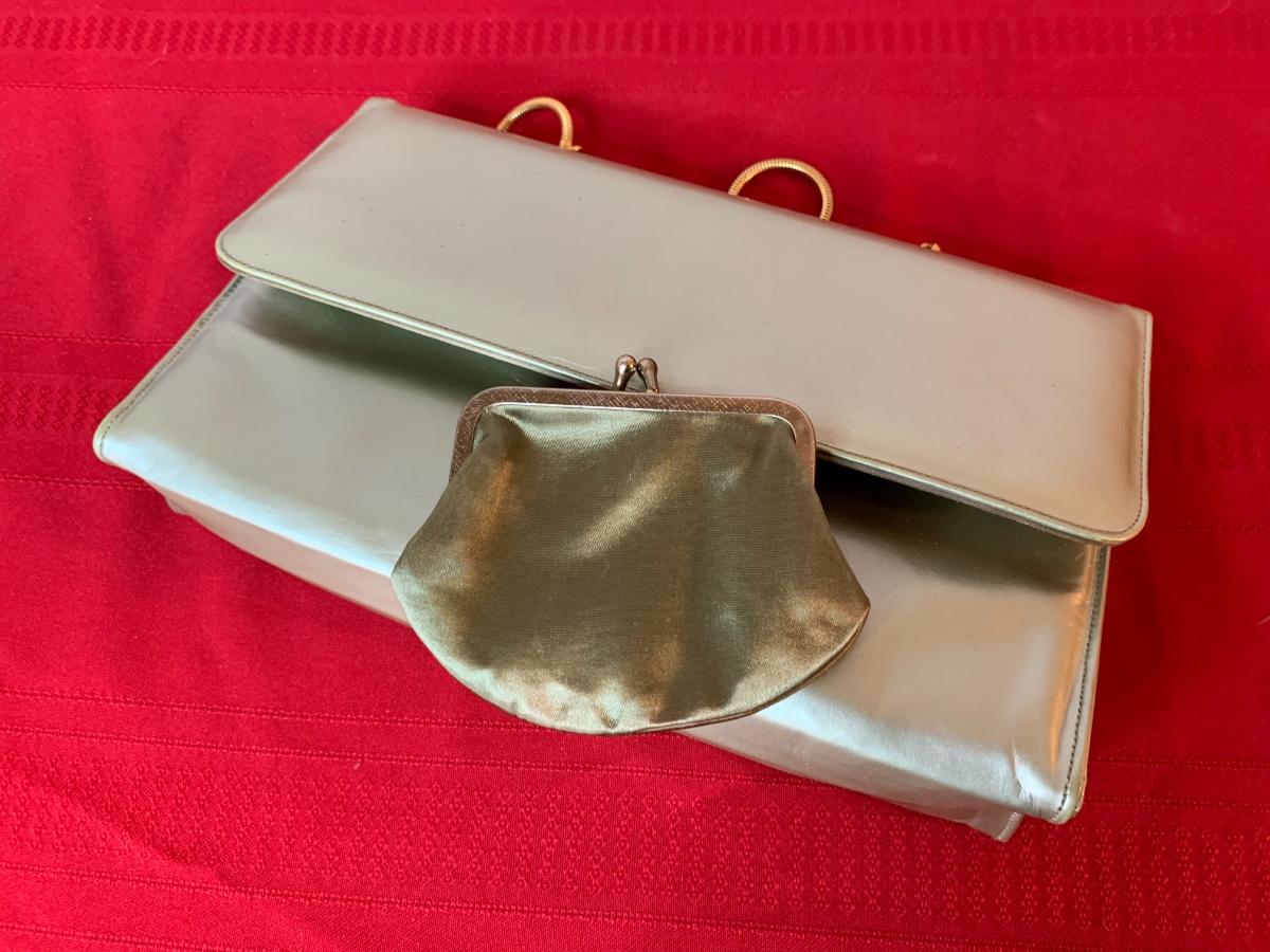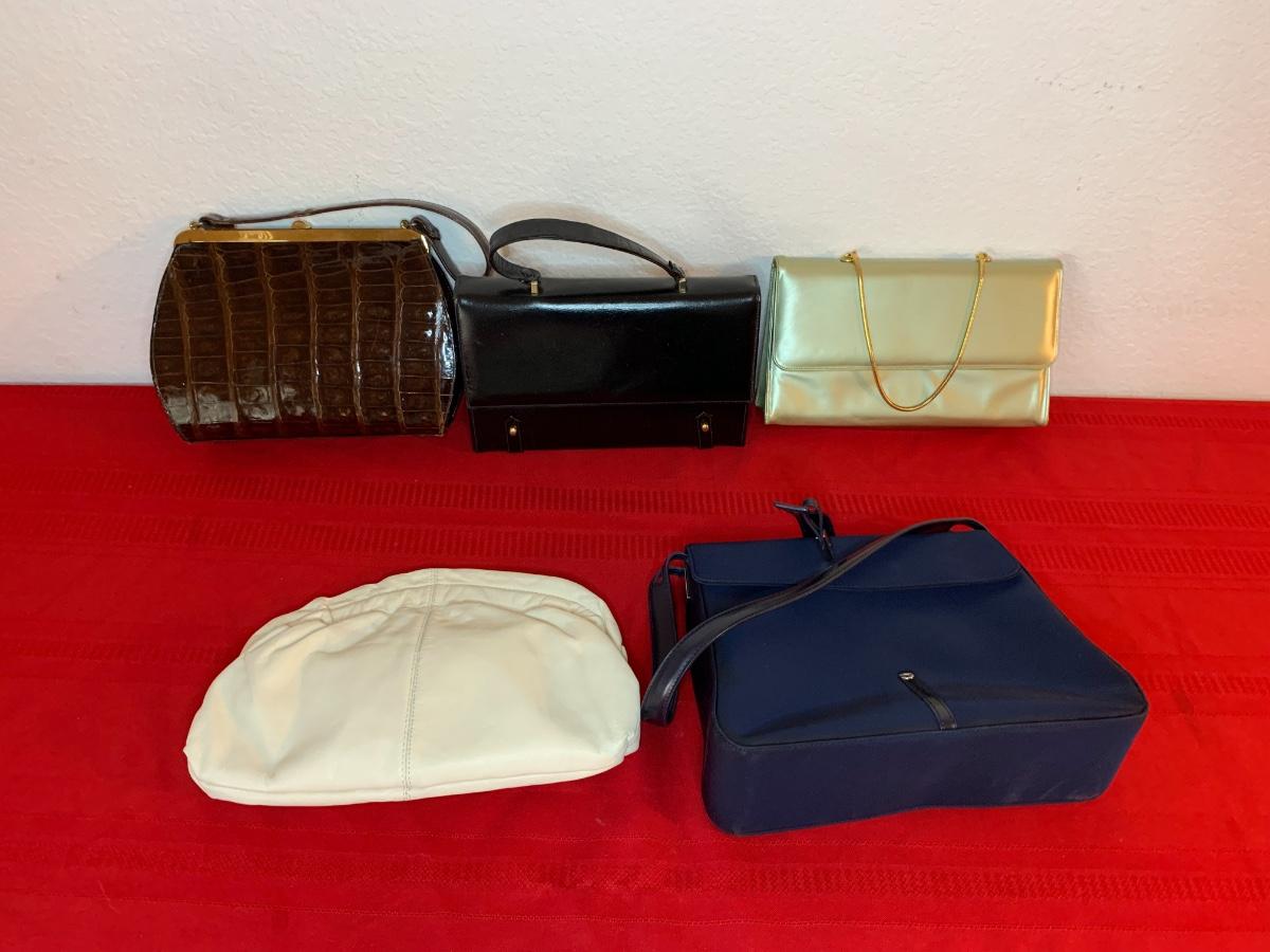 Assortment of purses all in good to great condition with normal wear. Brands include, DKNY, Marchioness, Handbag City, and one Silvas Kings Highway purse made in the 1950s/1960s includes a coin purse.