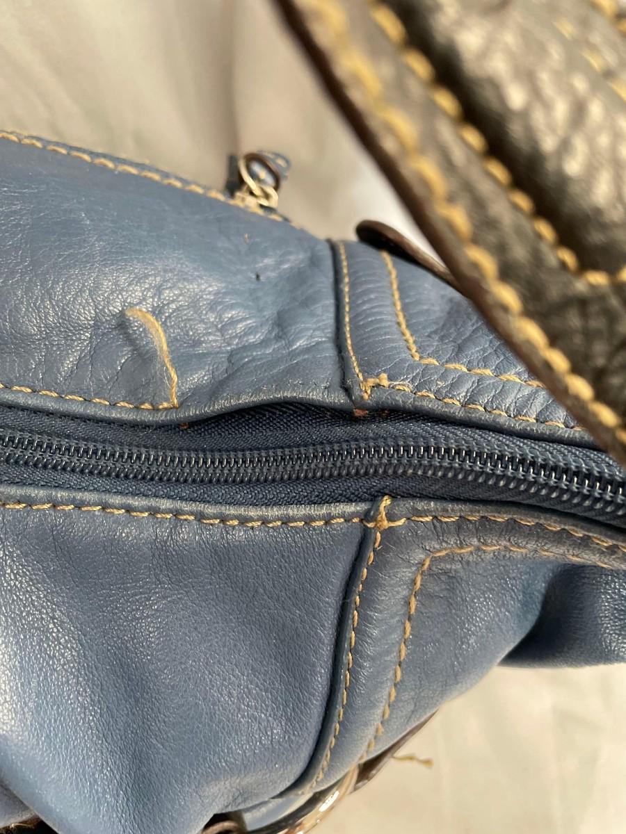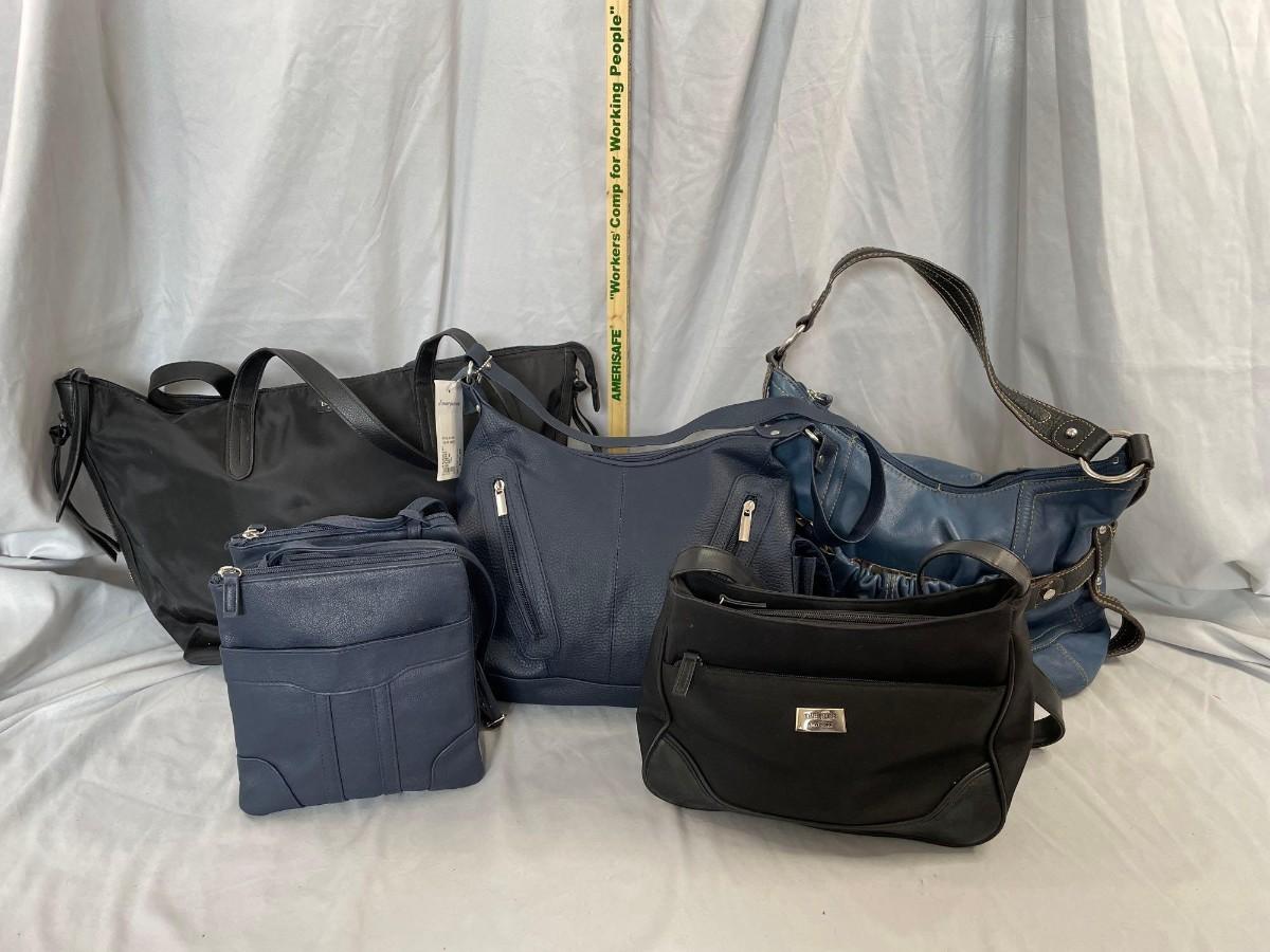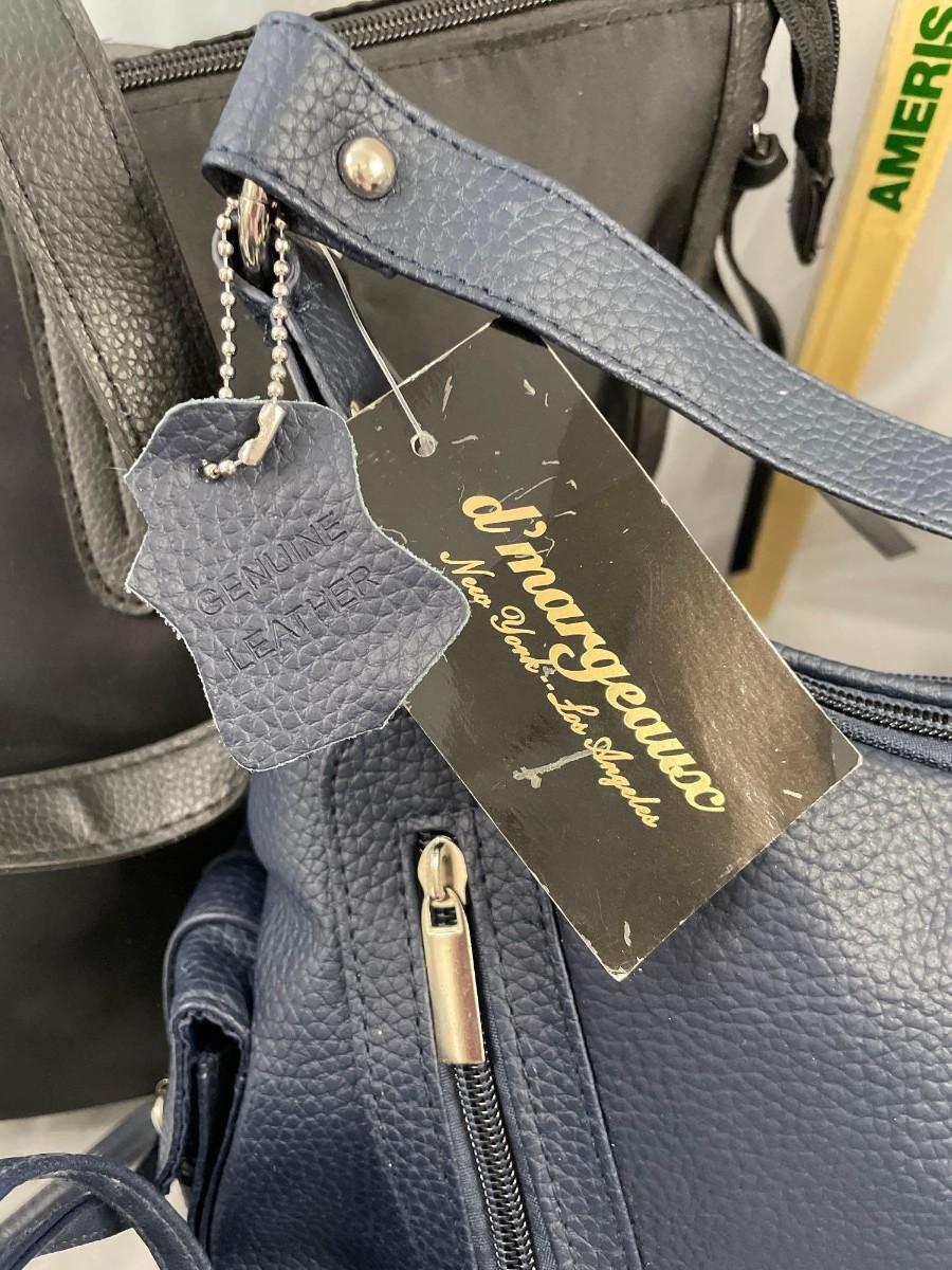 A few of these still have the tags on them.  The one bag in the back right is genuine leather and has a loose seam, but if it could be re-stitched you would have a long lasting bag.<br />