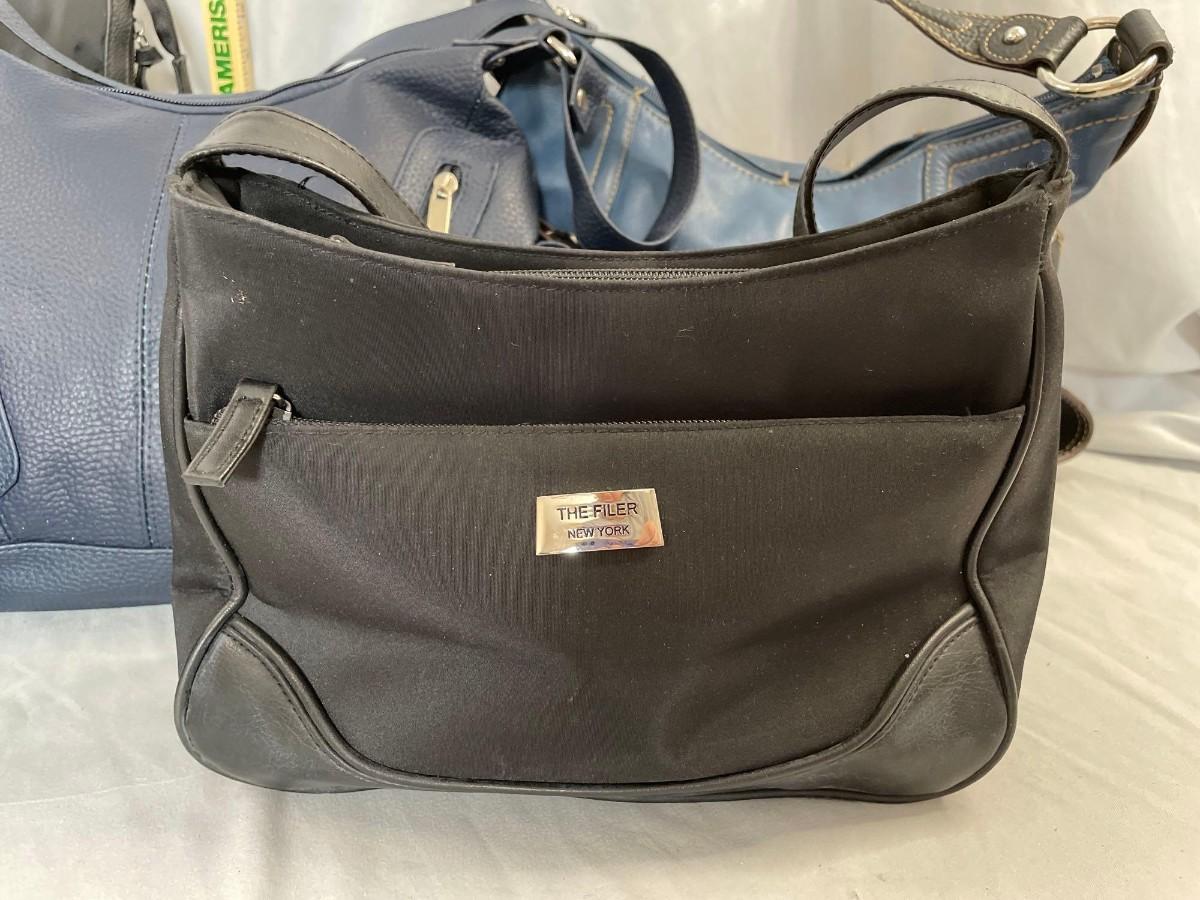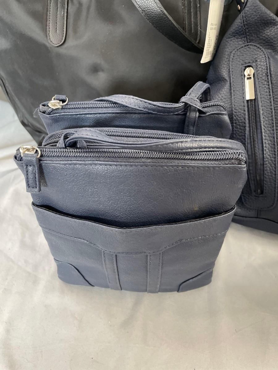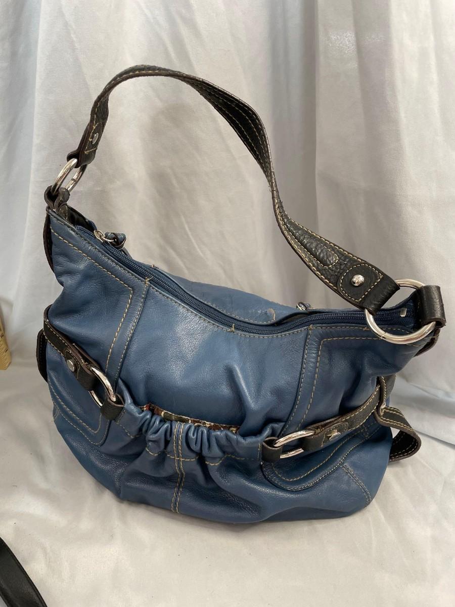 A few of these still have the tags on them.  The one bag in the back right is genuine leather and has a loose seam, but if it could be re-stitched you would have a long lasting bag.<br />