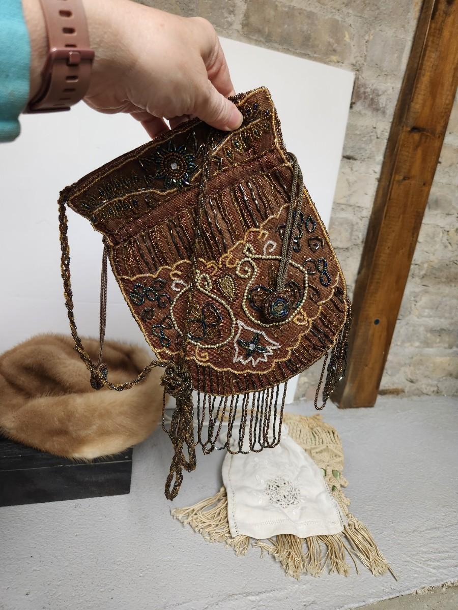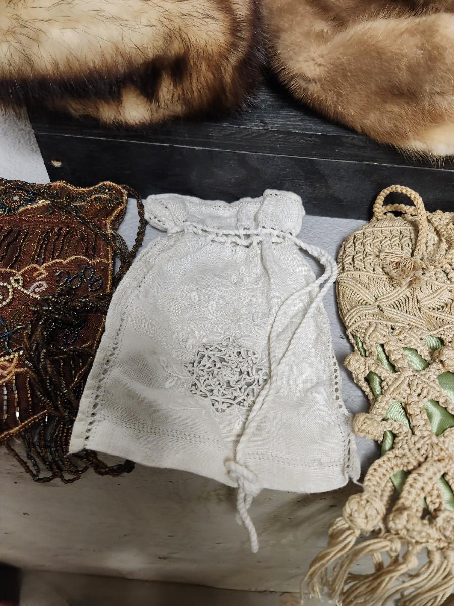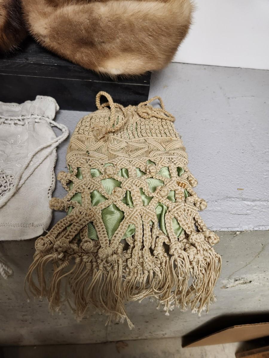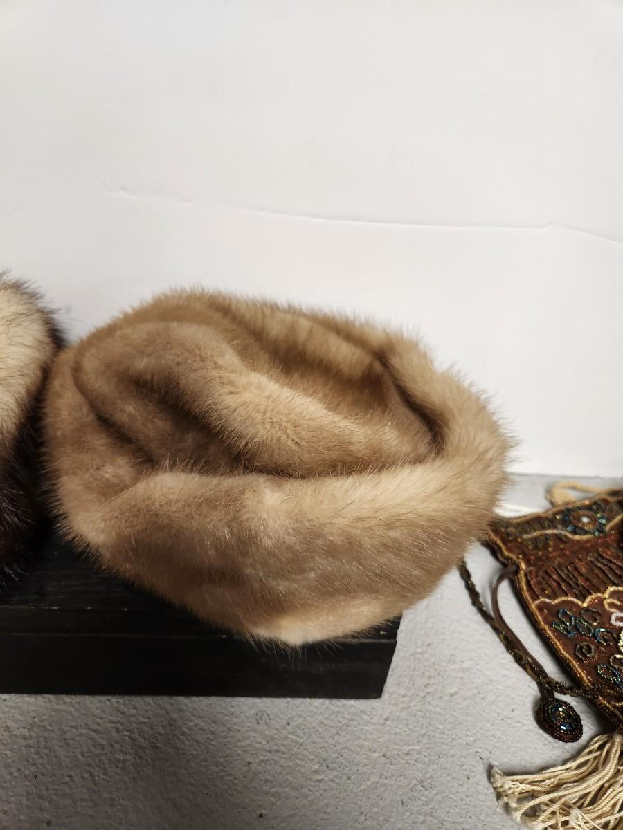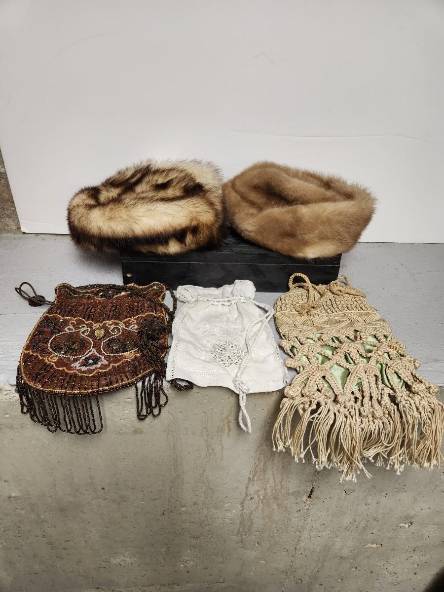 Two vintage fur hats, one is white mink and the other is American mink. Three satchel purses. One antique, one vintage and one fairly new