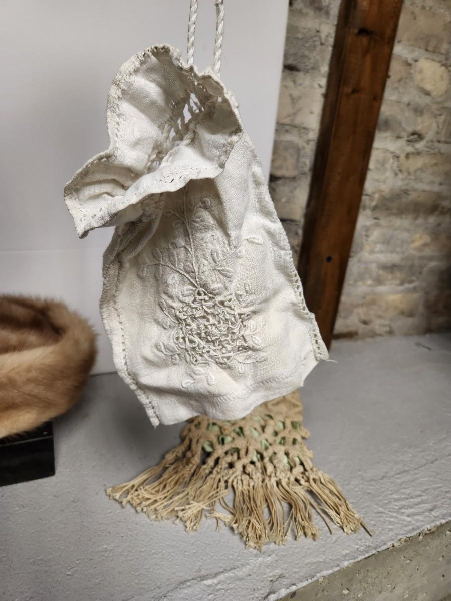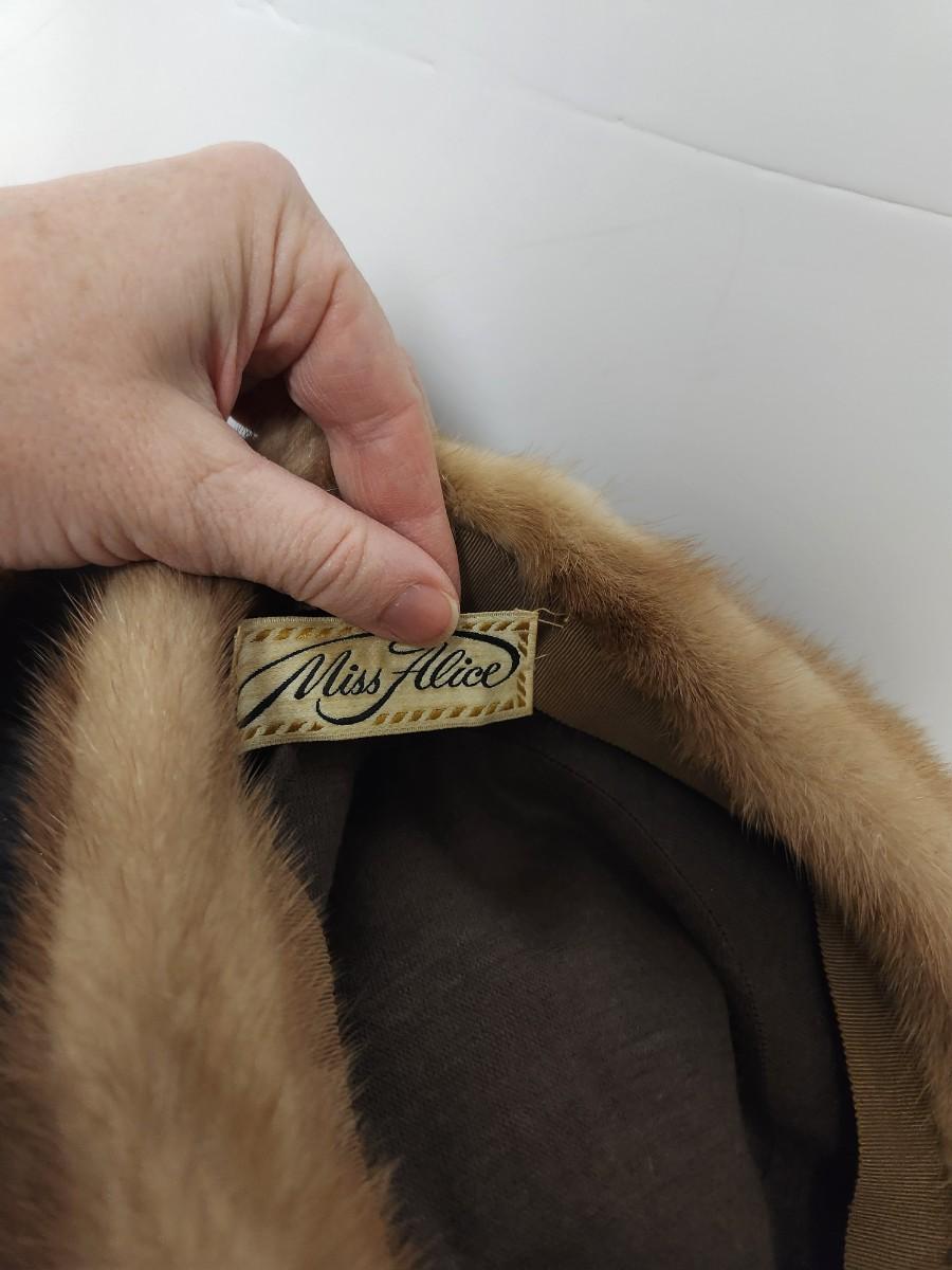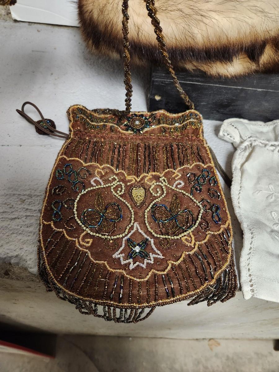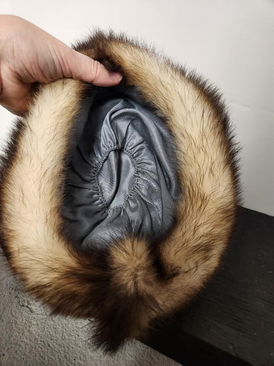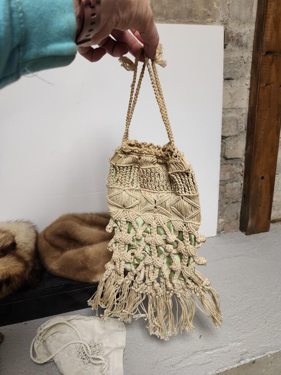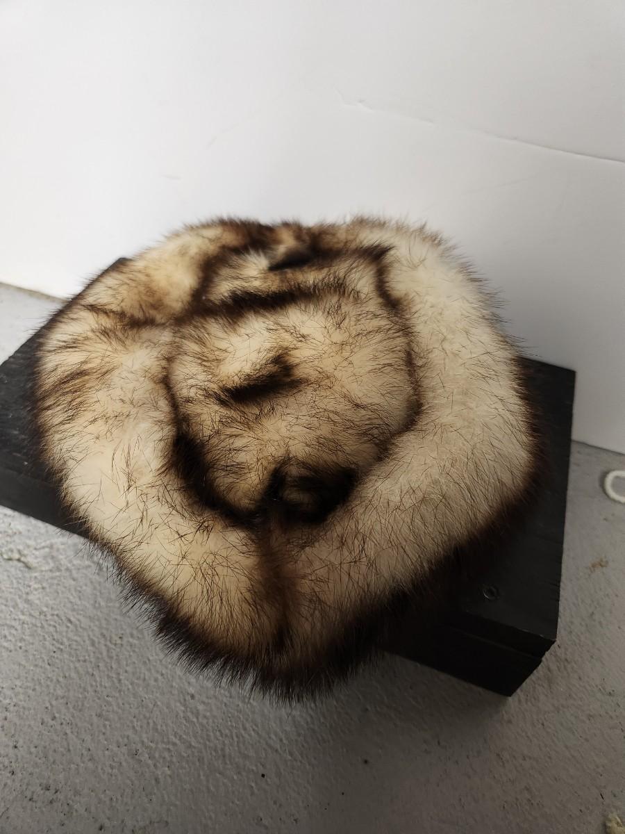 Two vintage fur hats, one is white mink and the other is American mink. Three satchel purses. One antique, one vintage and one fairly new