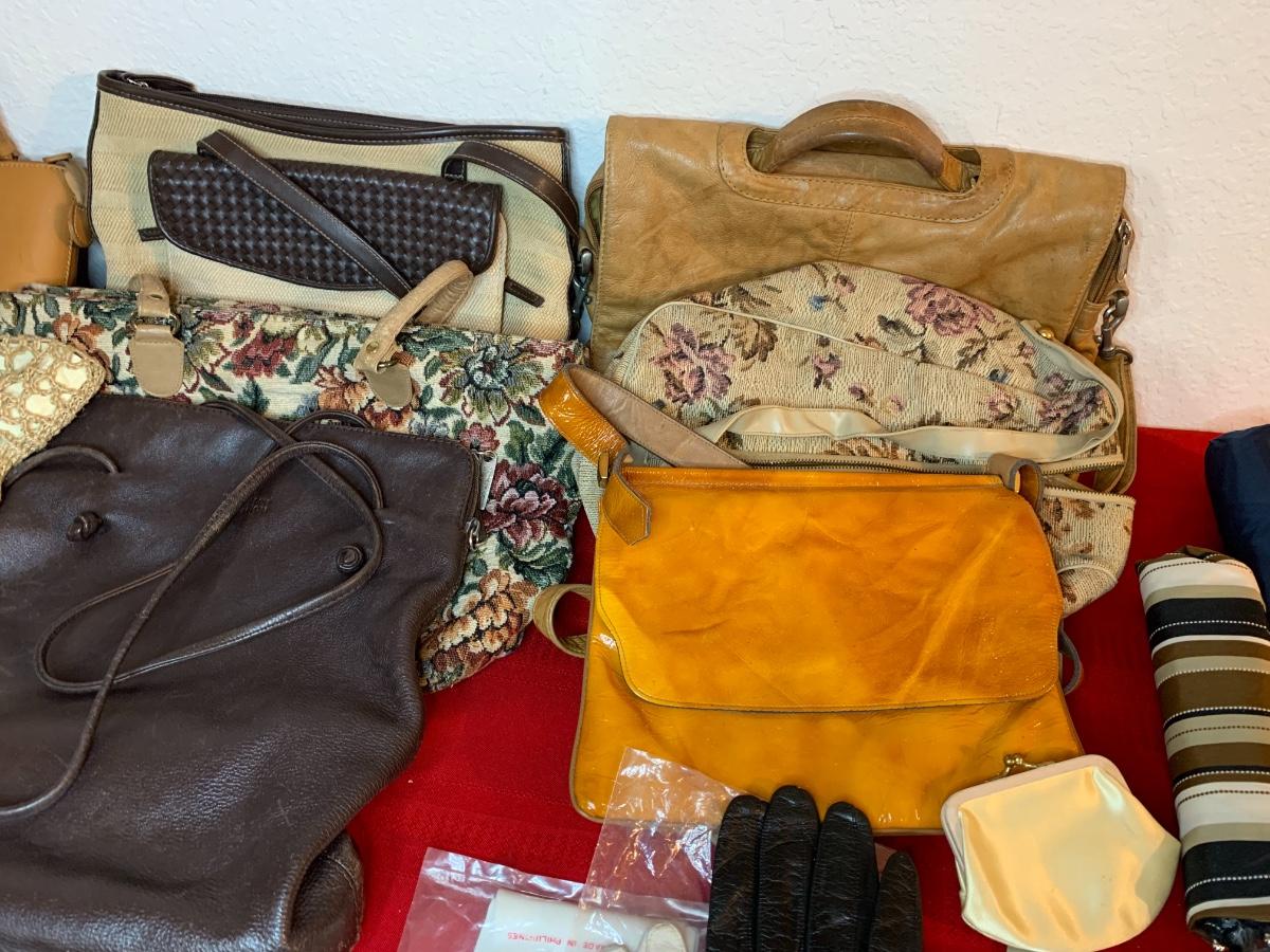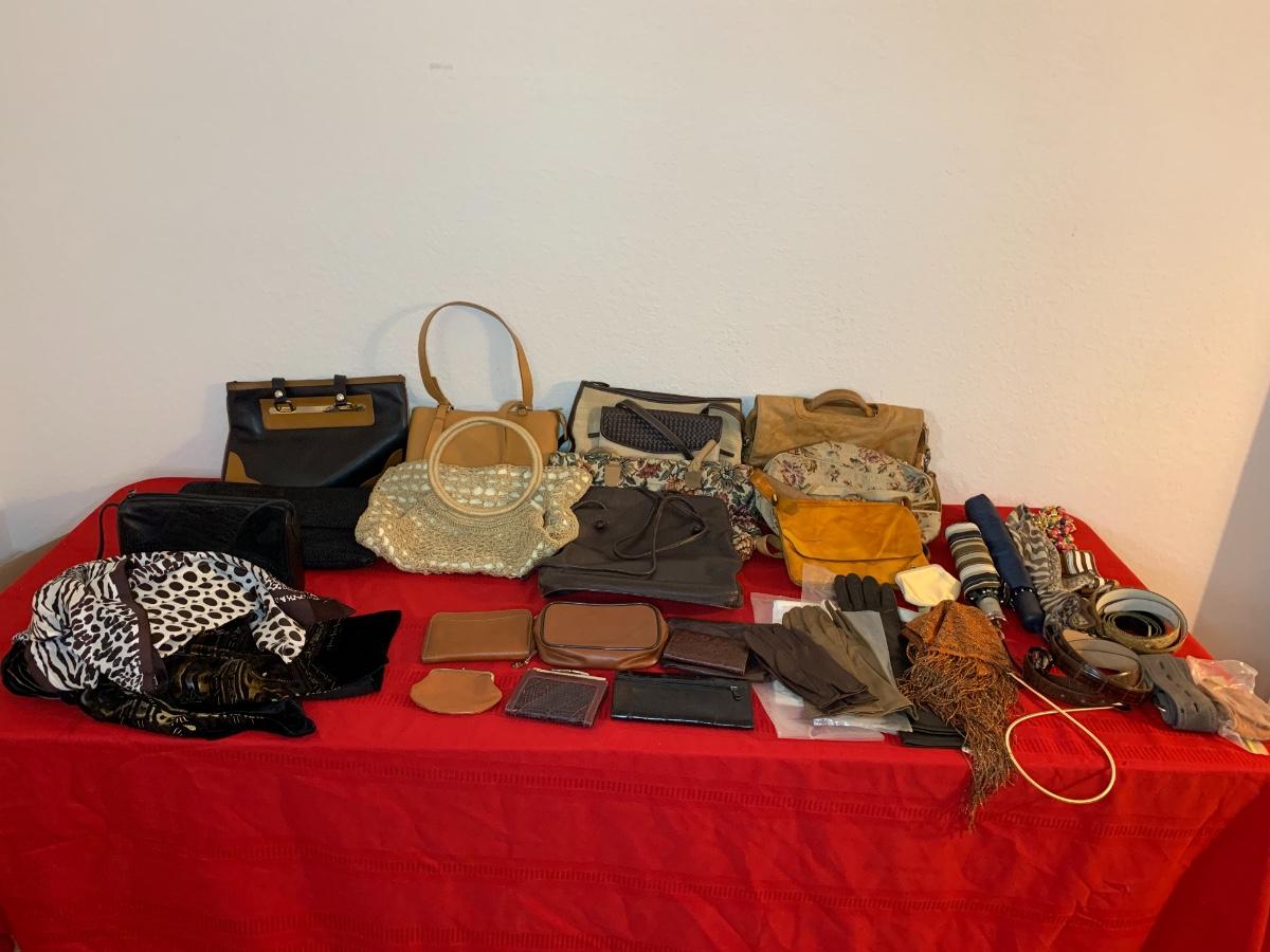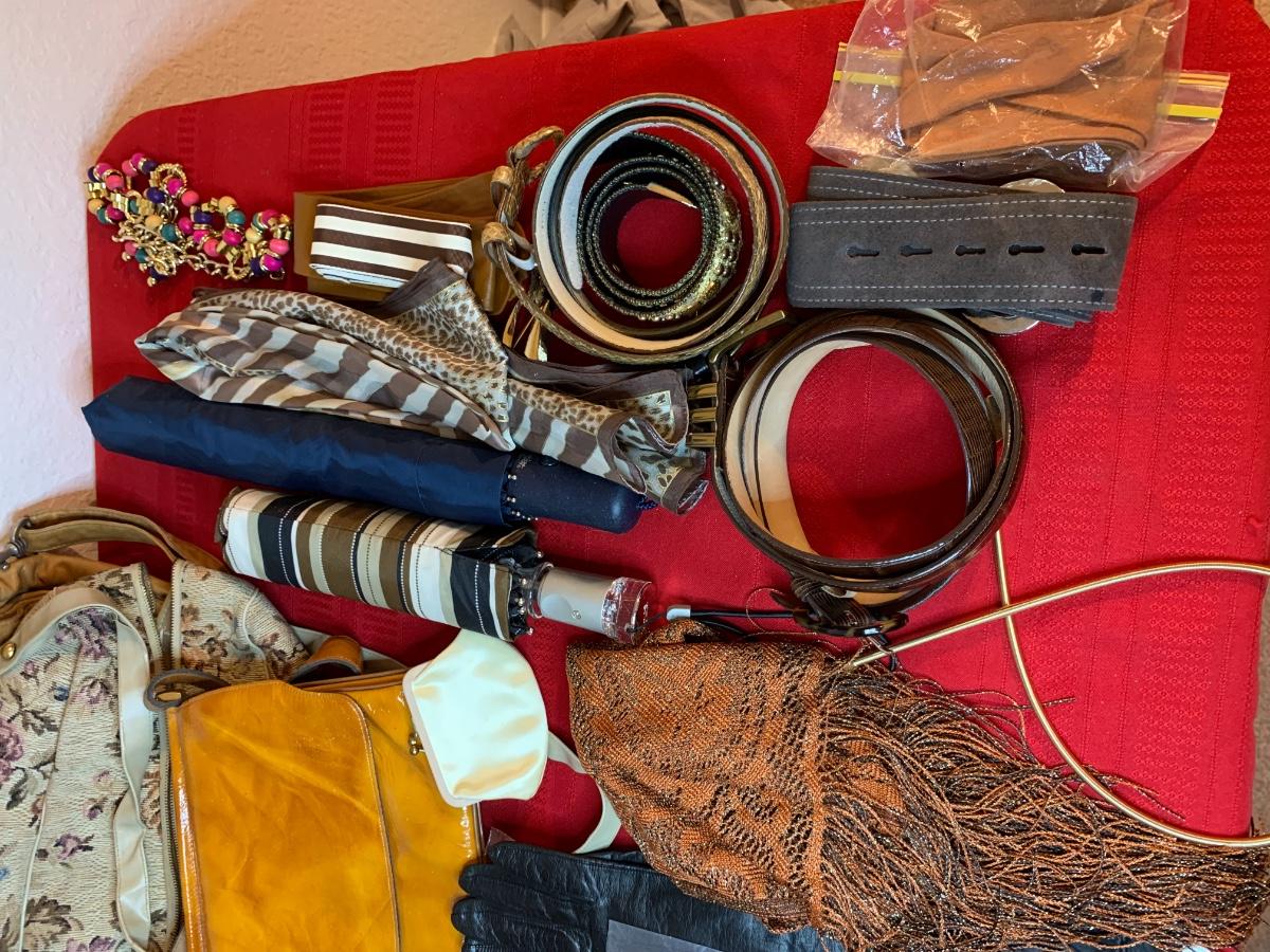 Lot includes purses, belts, umbrellas by Totes and Rain Kist, small pouches and gloves (made in Italy). St Thomas, Bosca, Kenneth Cole, S Roberts, Contessa etc