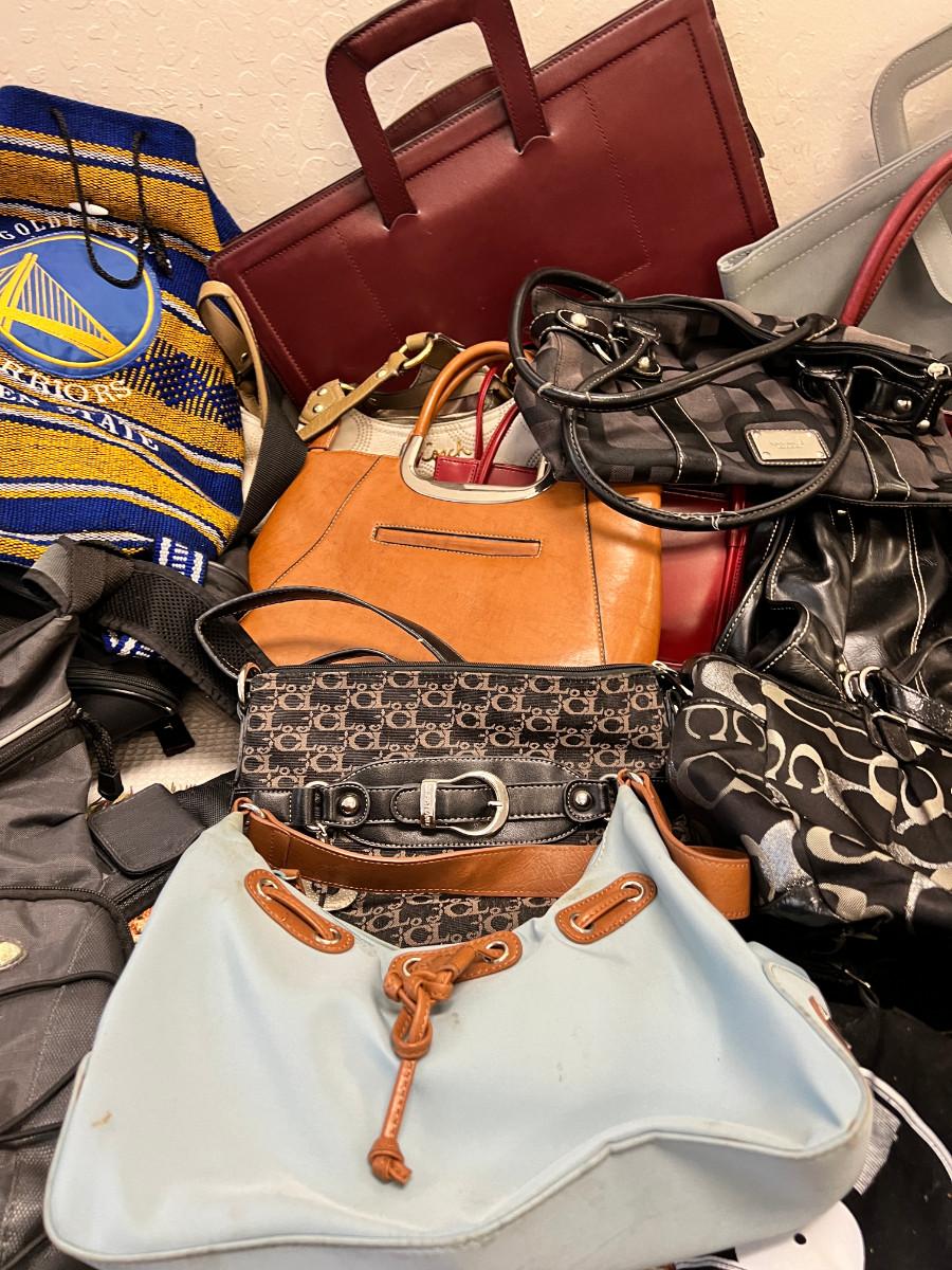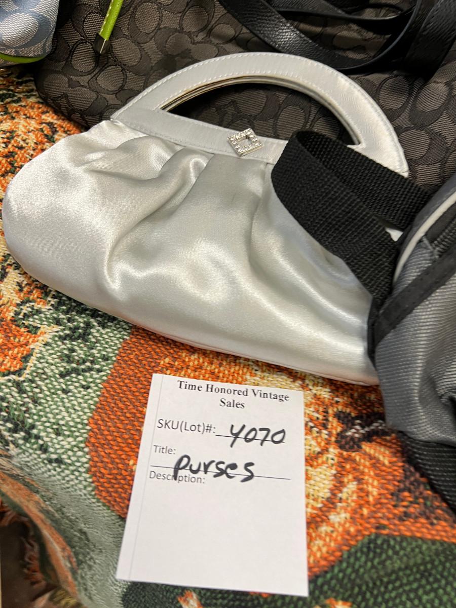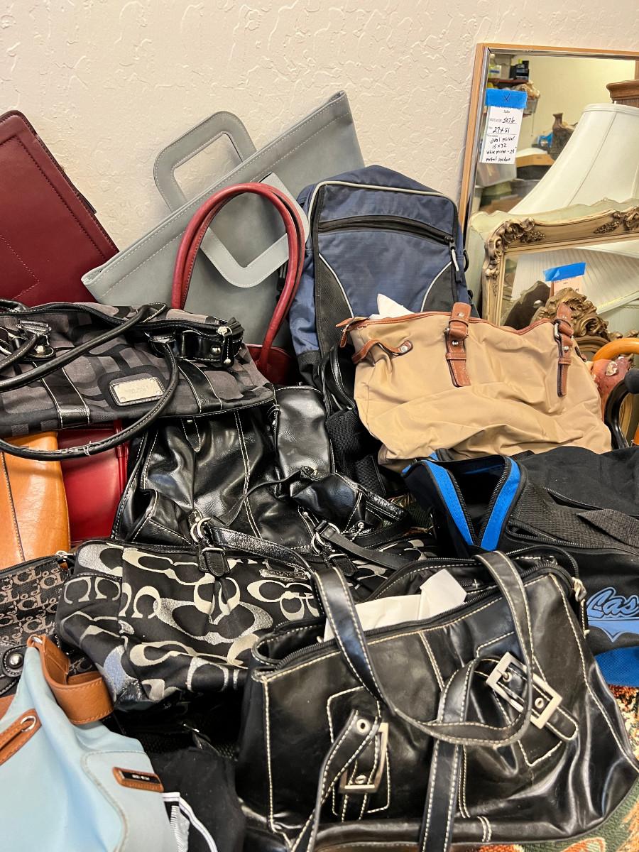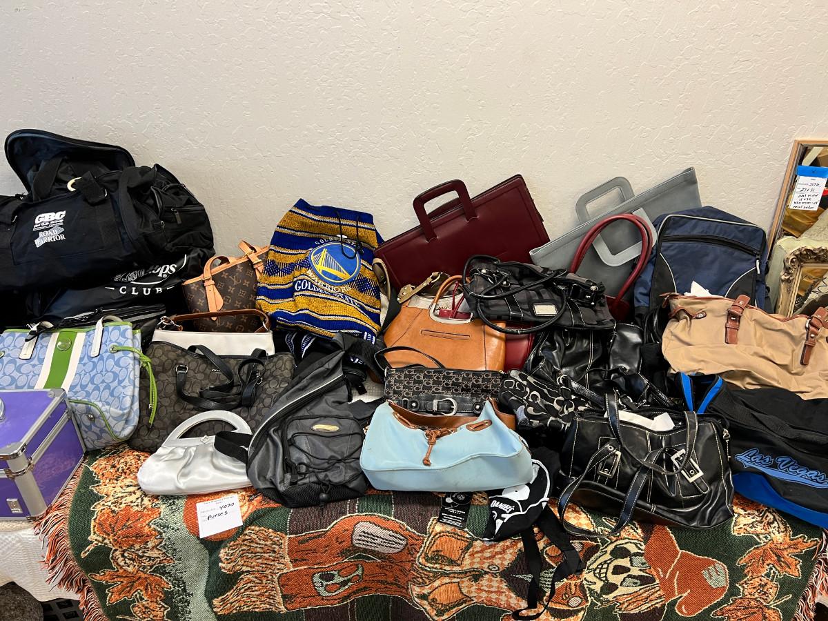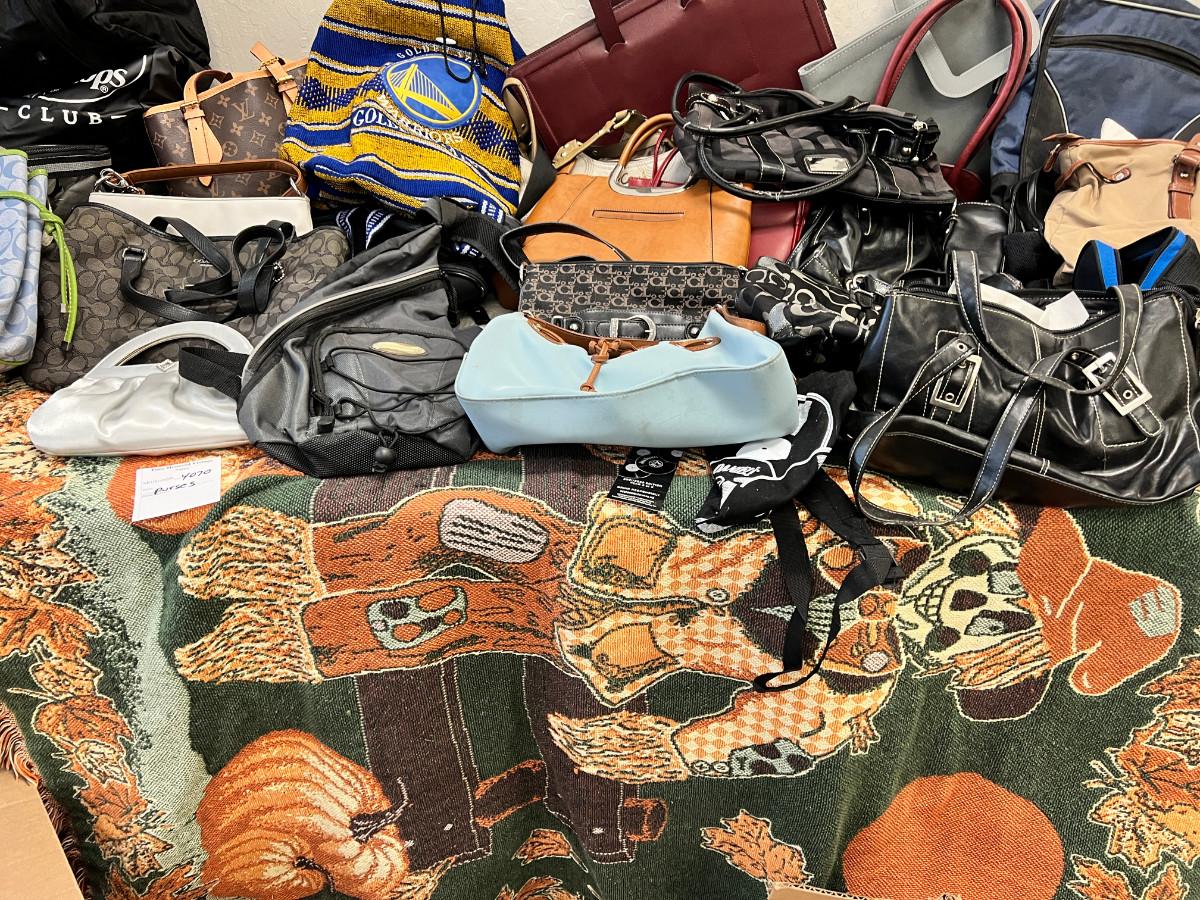 Mostly used purses and bags. Fall pumpkin scarecrow throw blanket. There are name brand purses but only the Coach bags look authentic. there are 2 Guccis that are made in china. Some need cleaning, there is some wear.