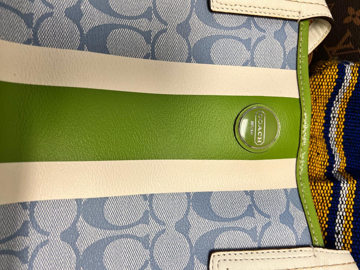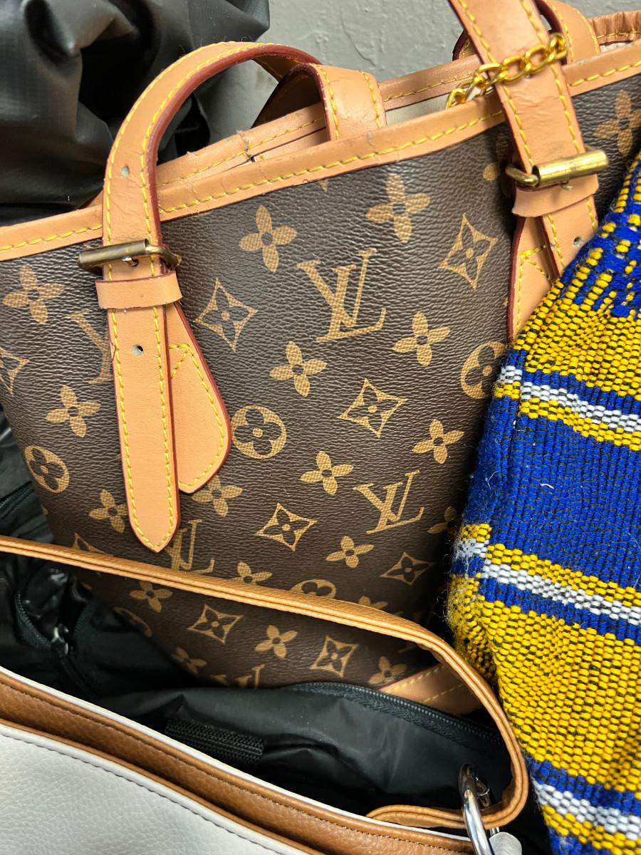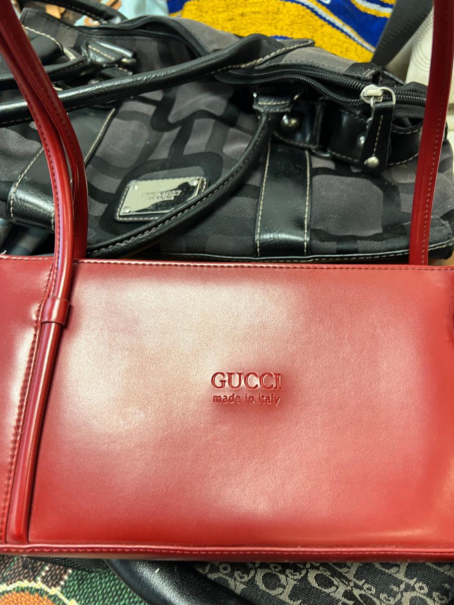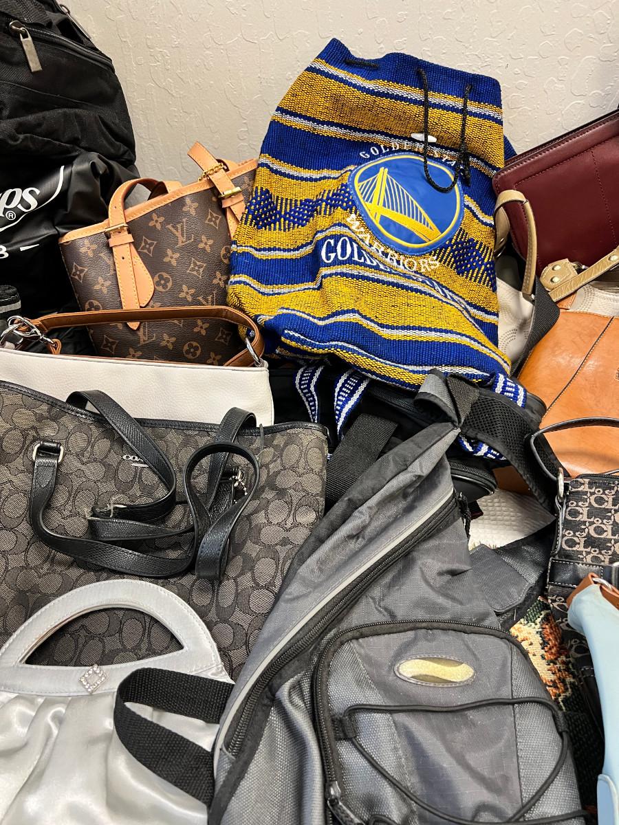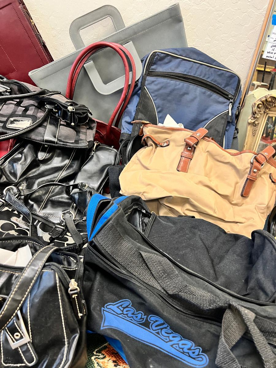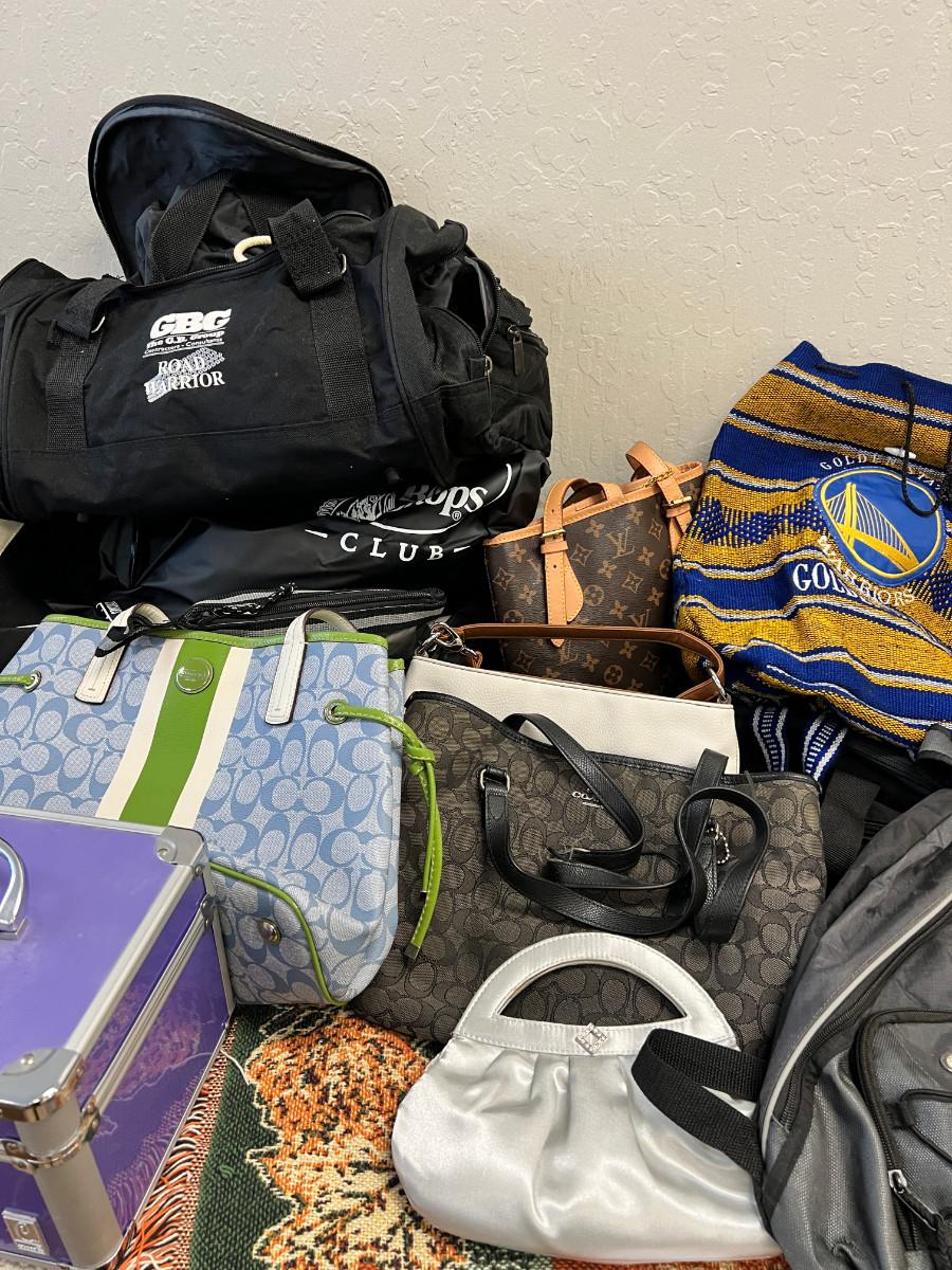Mostly used purses and bags. Fall pumpkin scarecrow throw blanket. There are name brand purses but only the Coach bags look authentic. there are 2 Guccis that are made in china. Some need cleaning, there is some wear.