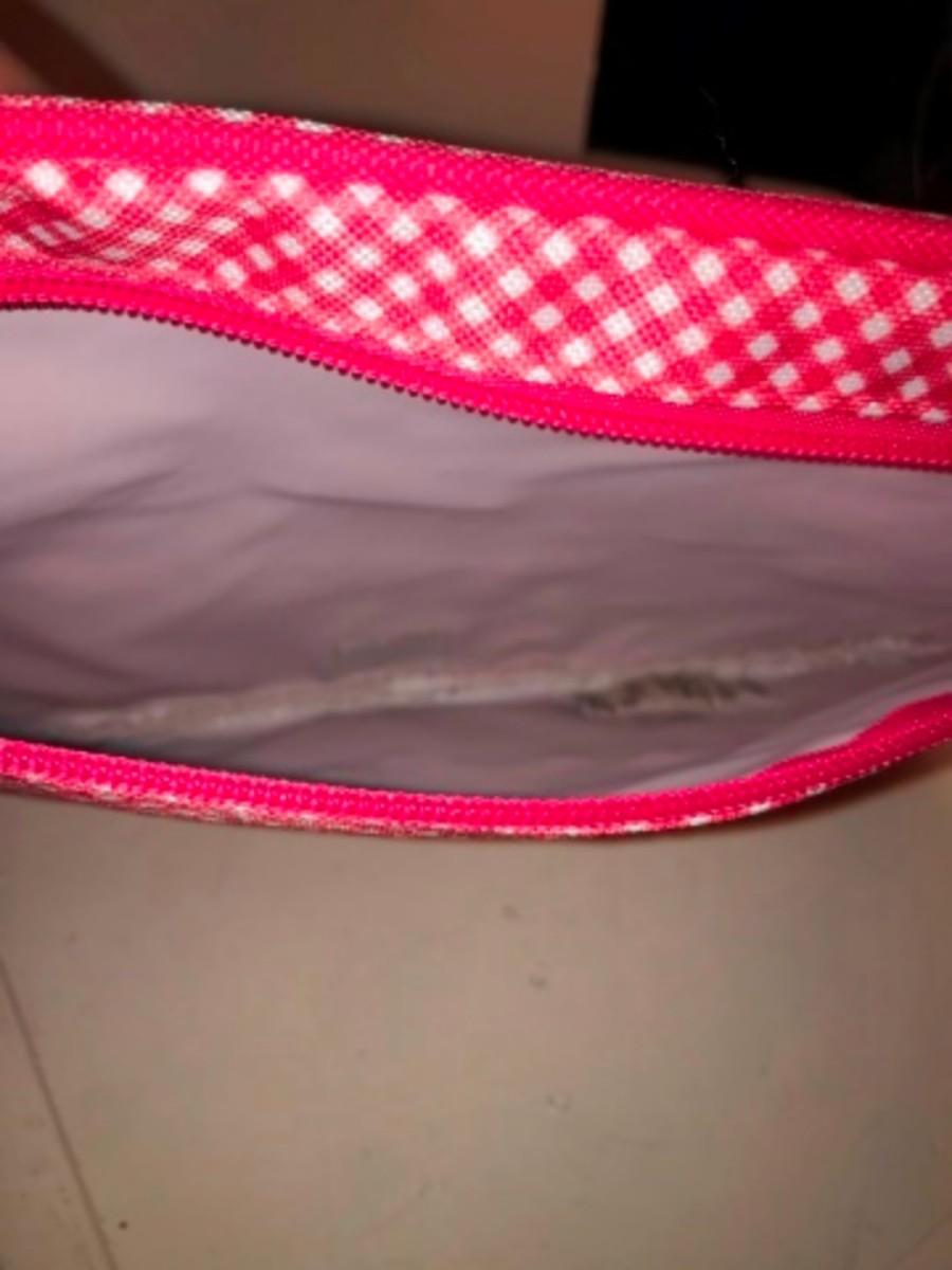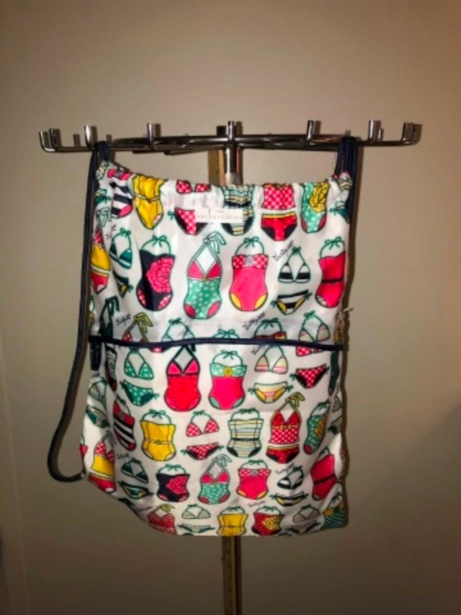 Purses / hangbags: Swimsuit string bag; red & white zipper pouch (Staff Note: CBWLN);