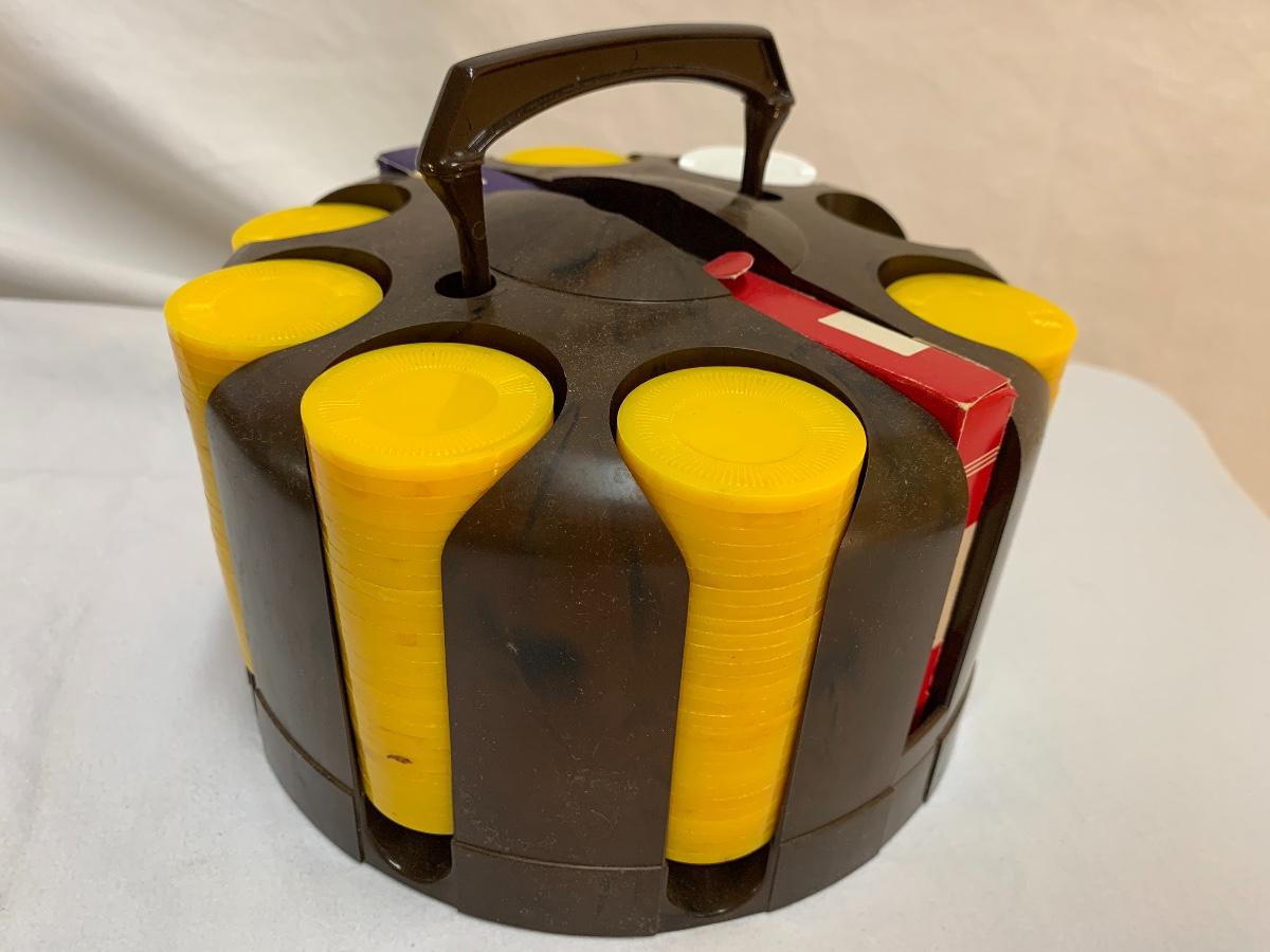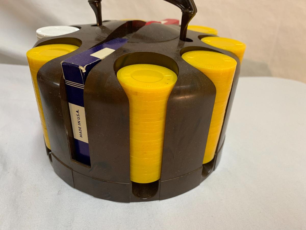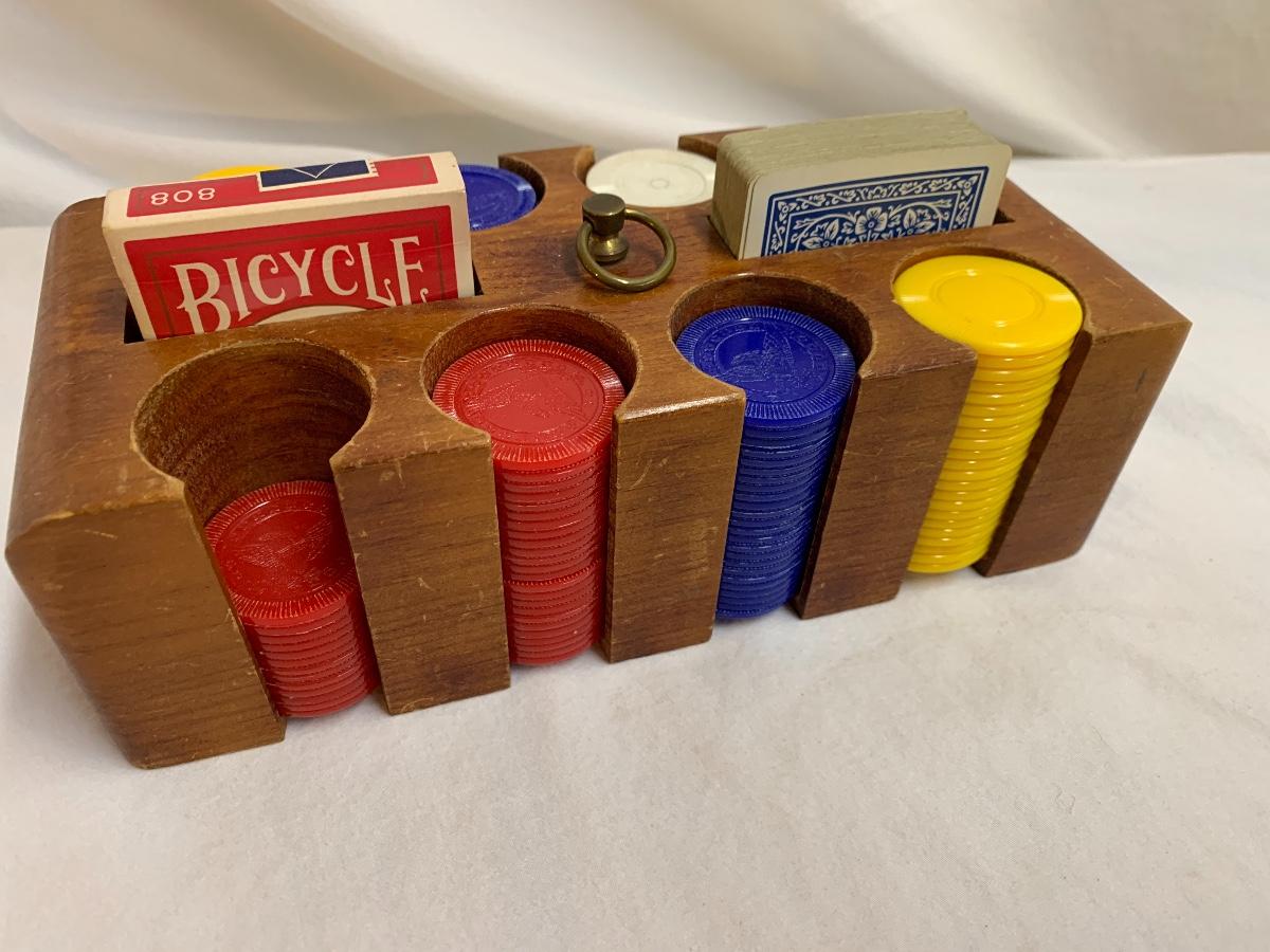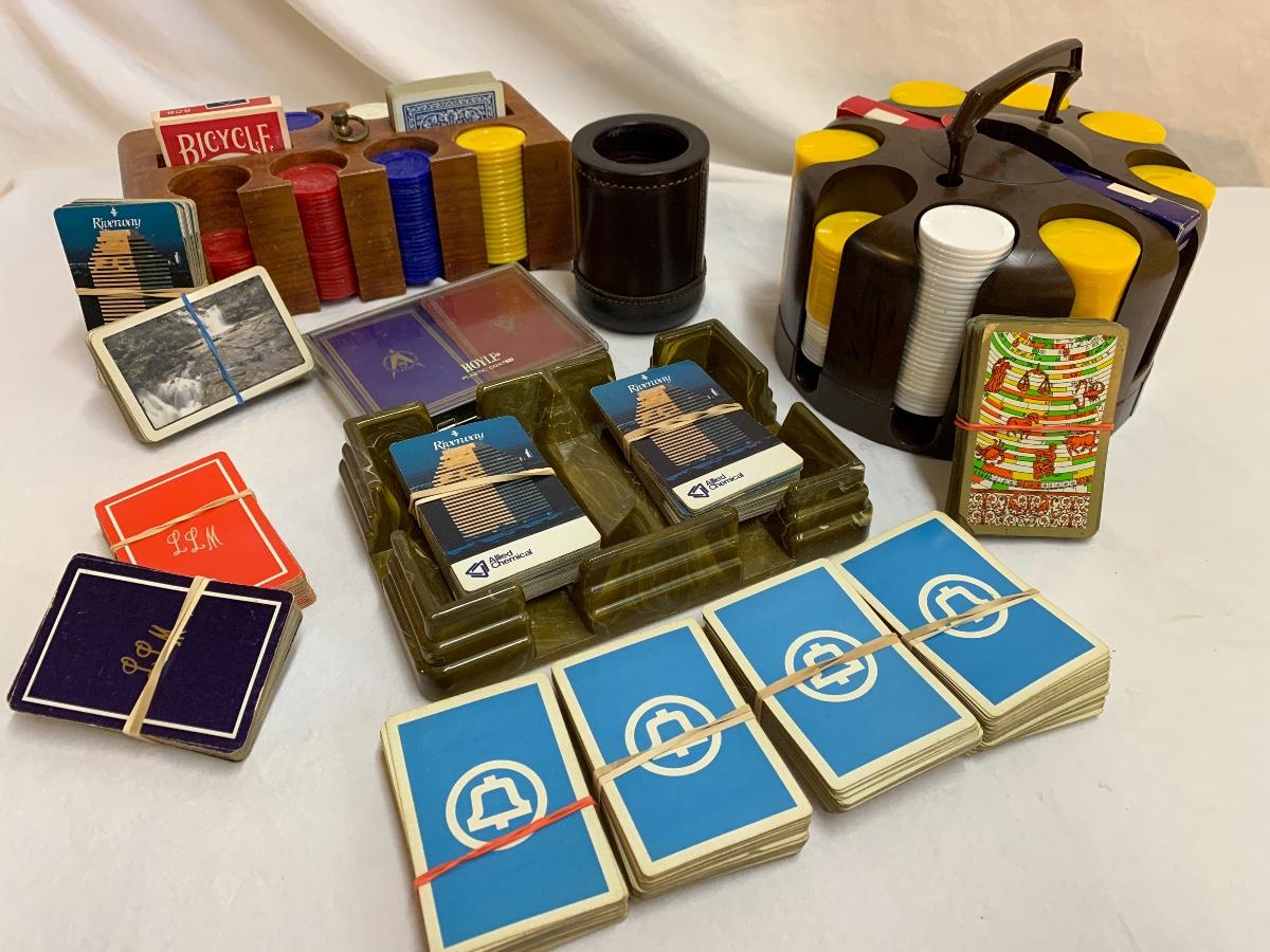 Vintage lot of poker chips, decks of cards and caddies. Also includes dice rolling cup.