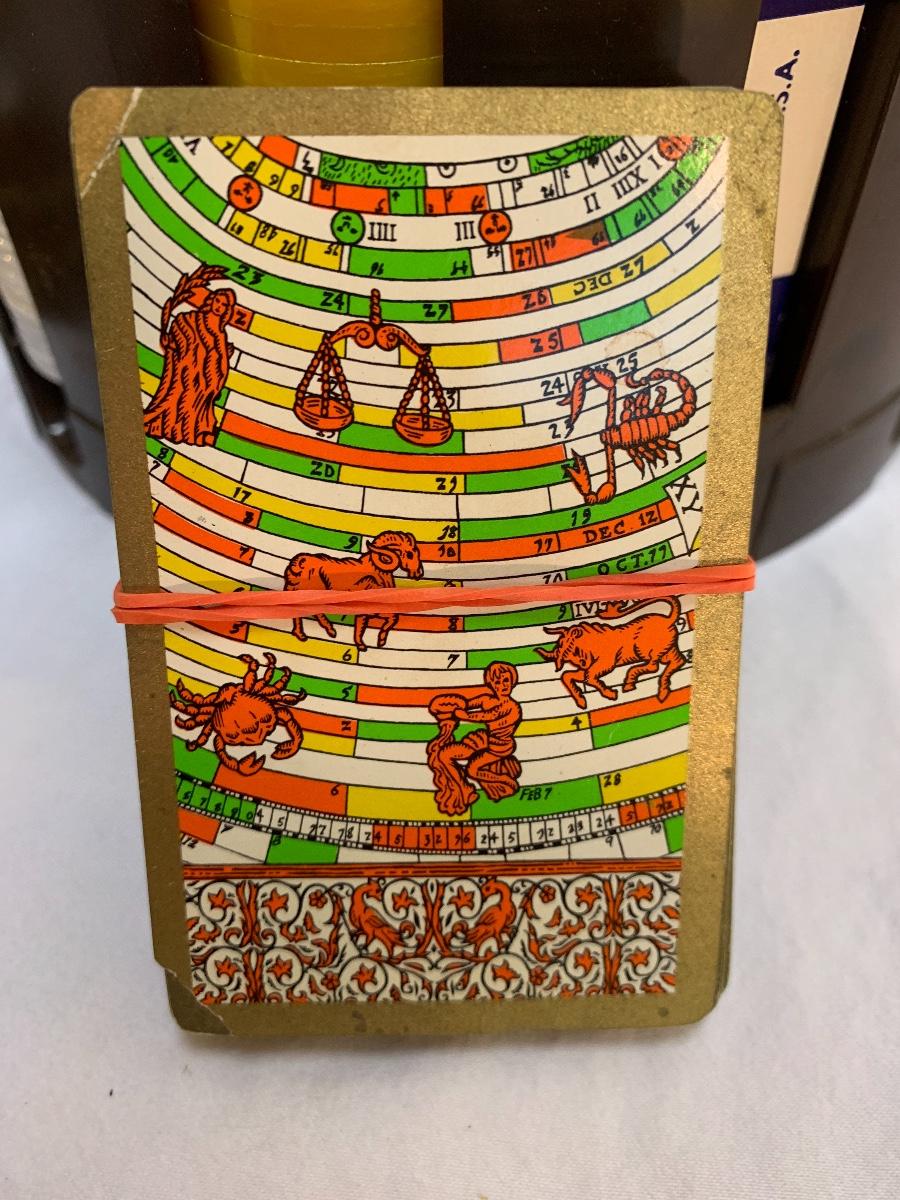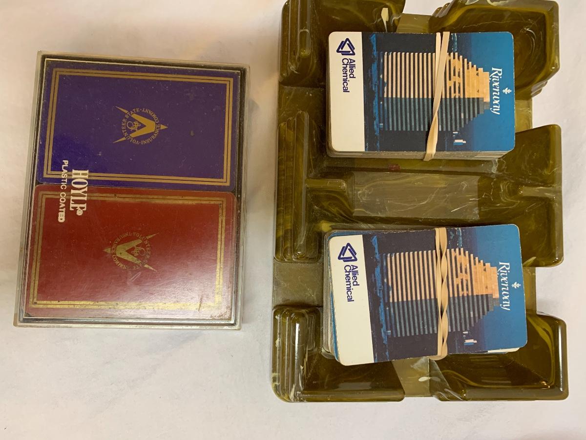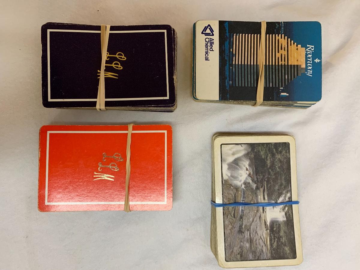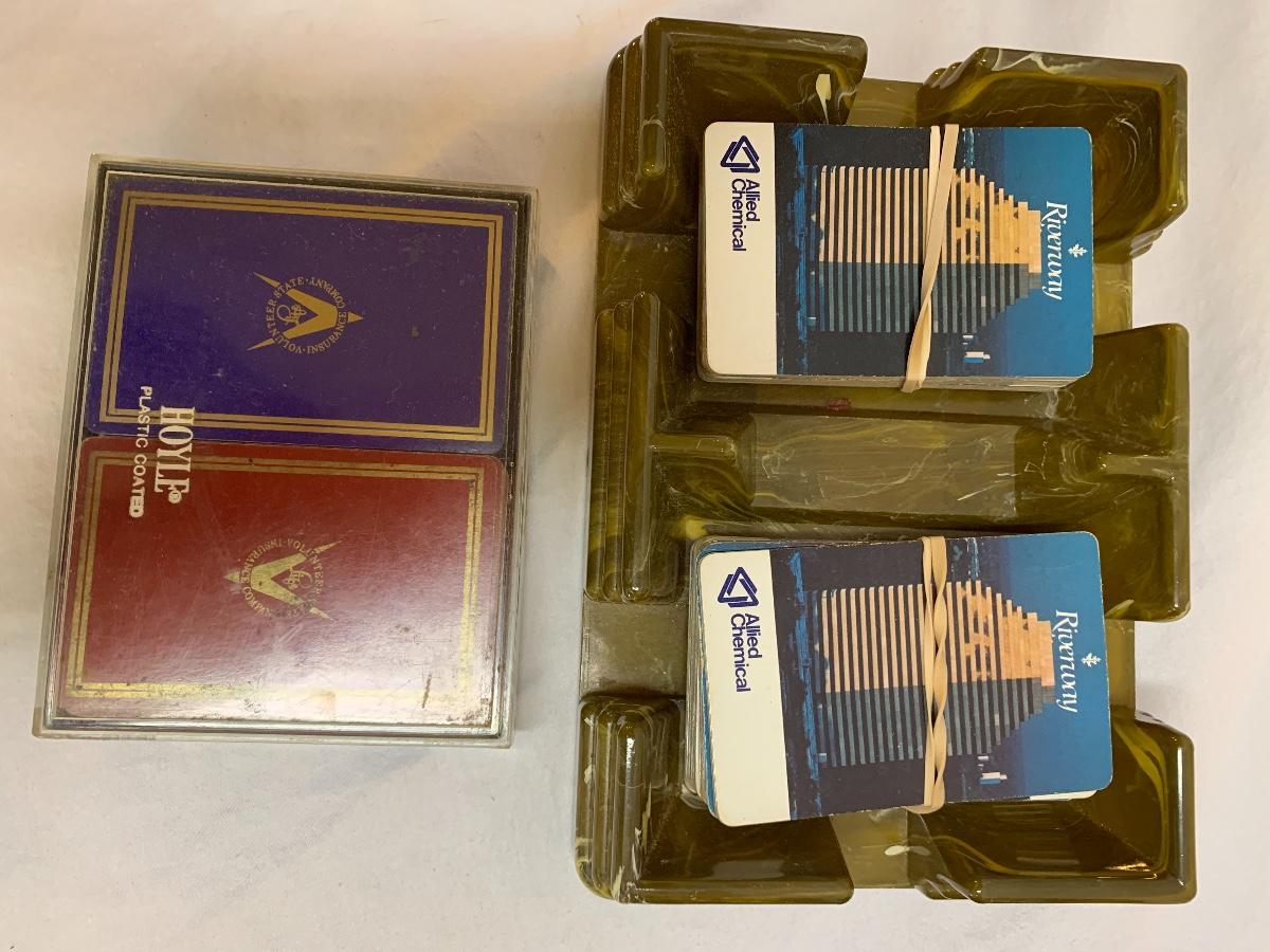 Vintage lot of poker chips, decks of cards and caddies. Also includes dice rolling cup.