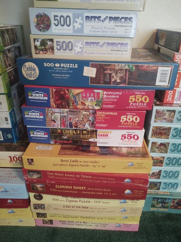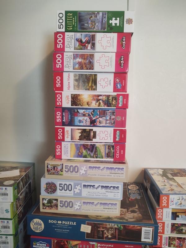 Tall stack of puzzles. Left and right stacks are not included in this lot.