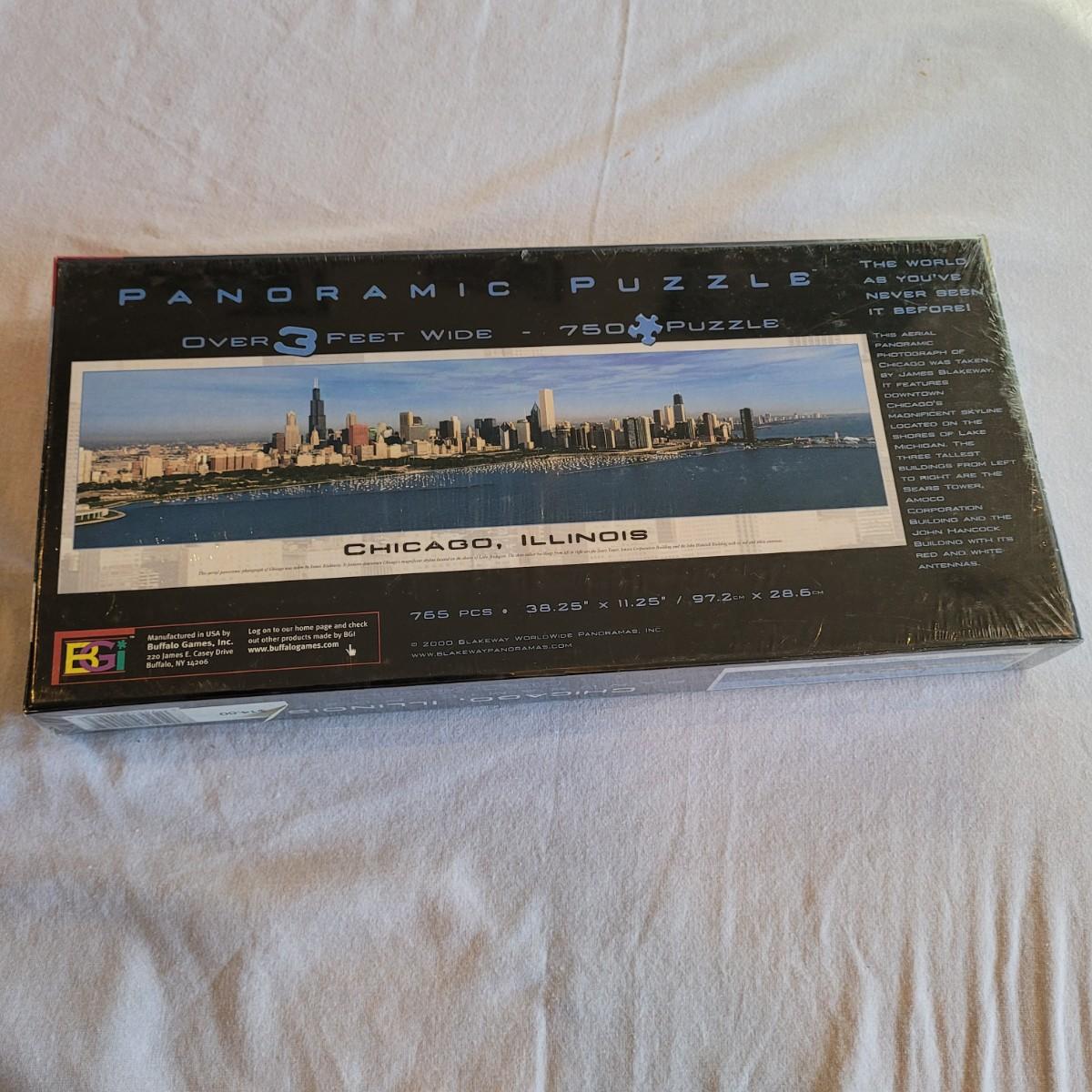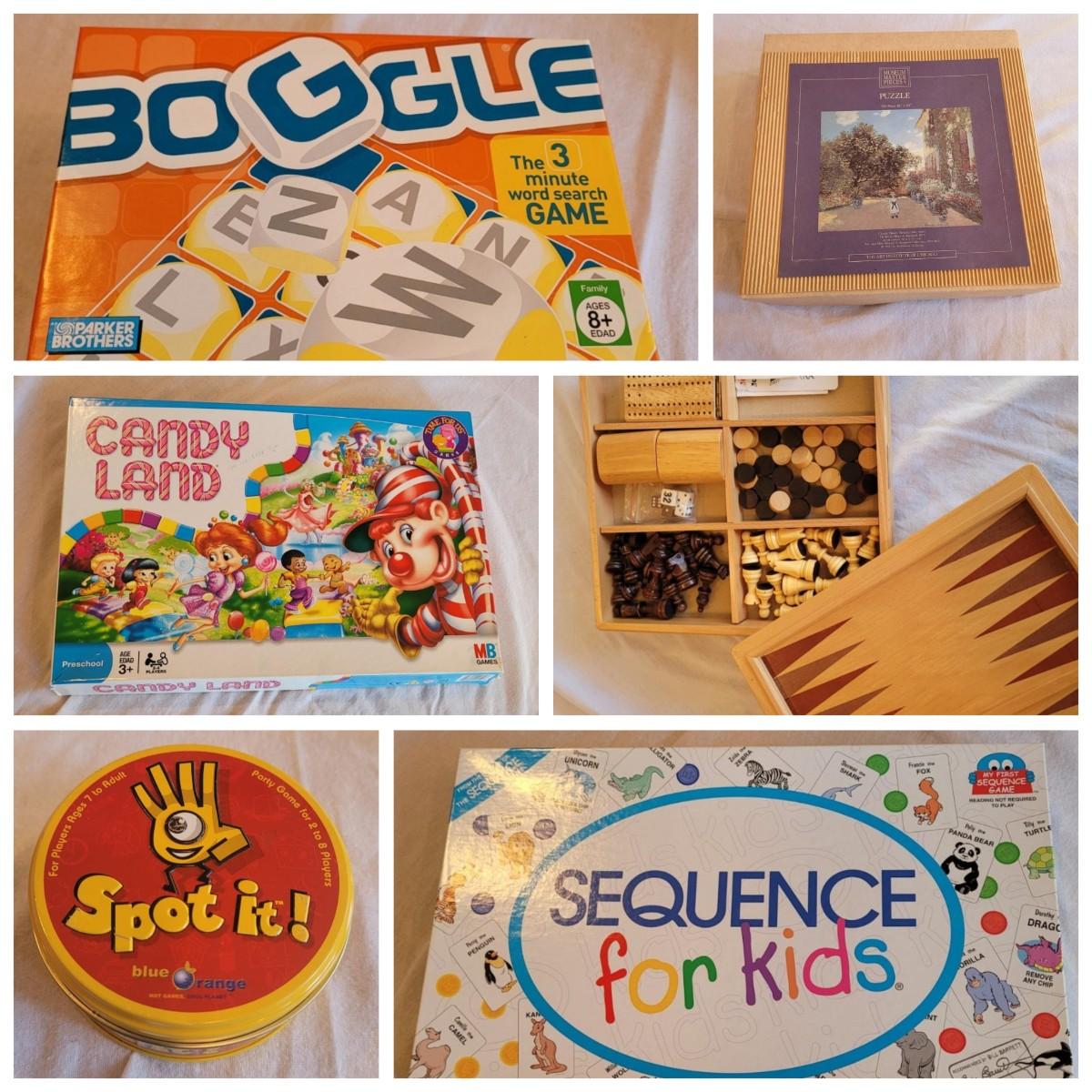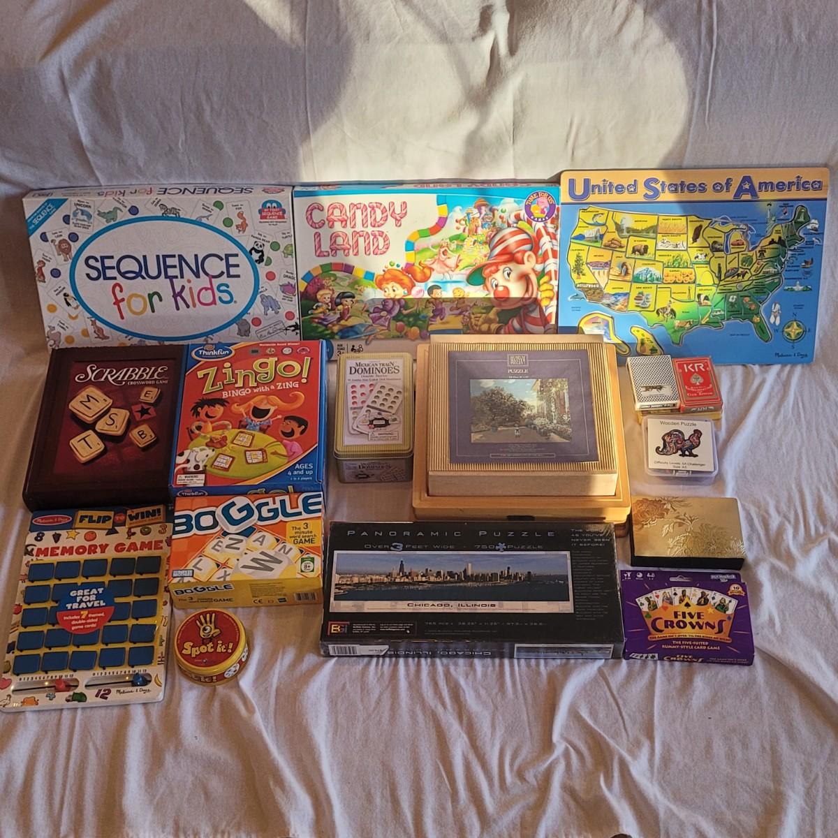 Large lot of various puzzles and games. Game titles include Spot it, Boggle, Zingo, Chess, Checkers, Five Crowns, Mexican Train Dominoes, Scrabble, Sequence for Kids, Candy Land, a Melissa and Doug memory game, and various playing cards. Puzzles include a panoramic puzzle of Chicago, a Claude Monet painting, a wooden rooster, and children's Wooden map puzzle.